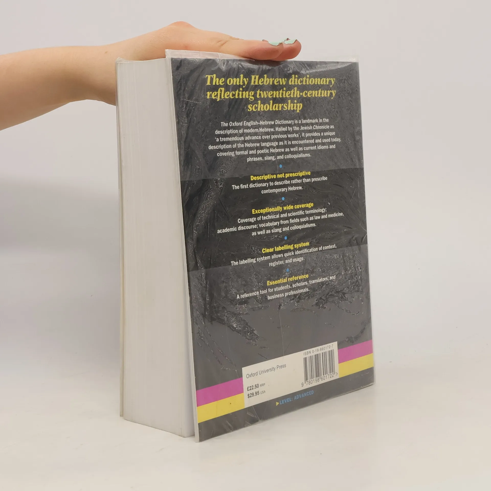 Now available for the first time in a paperback format, The Oxford English-Hebrew Dictionary is a landmark in the description of modern Hebrew. Using principles developed in English lexicography but never before applied to Hebrew, it is an essential reference for serious English and Hebrewusers alike, whether students, scholars, translators, or in professional contexts. The dictionary reflects the development of Hebrew in the twentieth century, and with over 50,000 entries offers extensive coverage of current idioms and phrases, slang and colloquialisms, technical and scientificterminology, academic discourse, legal and medical terminology, American and Australian terms, and a labeling system allowing easy identification of senses, contexts, and registers. For anyone interested in learning or translating modern Hebrew, The Oxford English-Hebrew Dictionary is an invaluableresource.