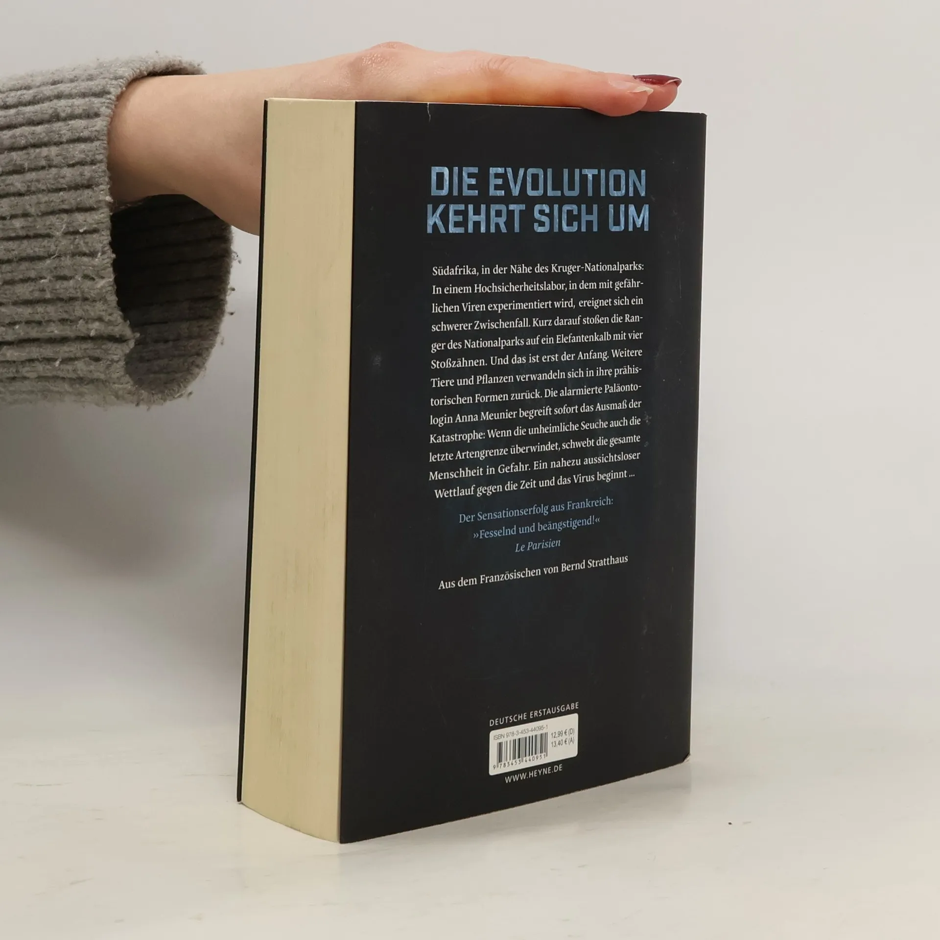 Wie viel Tier steckt noch in uns? Kruger-Nationalpark, Südafrika: Von einem mysteriösen Virus befallen, mutiert ein Elefant innerhalb weniger Tage zu einer prähistorischen Spezies mit vier Stoßzähnen. Wenig später sind auch Affen, Zebras und andere Arten von der Epidemie betroffen. Während die französische Paläontologin Anna Meunier nach den Ursachen sucht, greift das Virus auf den Menschen über. Innerhalb weniger Tage wird die Zeit um Millionen Jahre zurückgedreht: Homo sapiens wird Homo erectus. Panik bricht aus in New York, Paris, Genf und bald auf der ganzen Welt angesichts dieser mit Fell überzogenen, stummen und unberechenbaren Gestalten. Meunier und ihr Team versuchen verzweifelt, die Regression der Menschheit zu stoppen. Und sie müssen sich die Frage stellen: Sind das noch Menschen oder Bestien, die es zu bekämpfen gilt?
