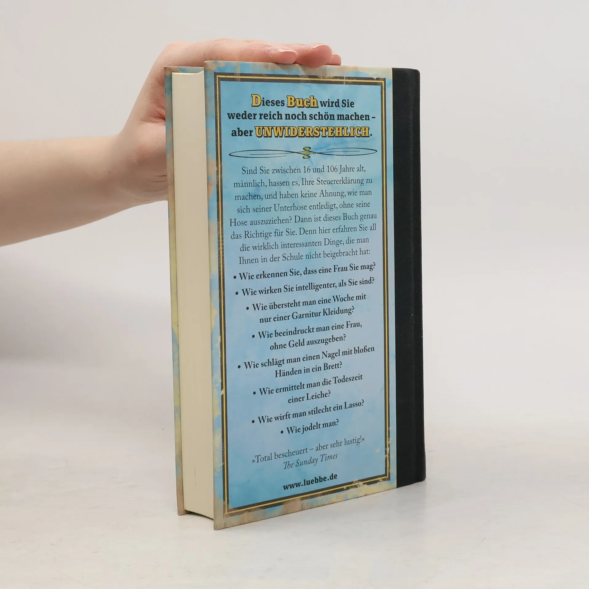 Sind Sie zwischen 16 und 106 Jahre alt, männlich, hassen es, Ihre Steuererklärung zu machen und haben keine Ahnung, wie man sich seiner Unterhose entledigt, ohne seine Hose auszuziehen? Dann ist dieses Buch genau das Richtige für Sie. Denn hier erfahren Sie all die wirklich interessanten Dinge, die man Ihnen in der Schule nicht beigebracht hat: Wie erkennen Sie, dass eine Frau Sie mag? Wie wirken Sie intelligenter, als Sie sind? Wie übersteht man eine Woche mit nur einer Garnitur Kleidung? Wie beeindruckt man eine Frau, ohne Geld auszugeben? Wie schlägt man einen Nagel mit bloßen Händen in ein Brett? Wie ermittelt man die Todeszeit einer Leiche? Wie wirft man stilecht ein Lasso? Wie jodelt man? Wie brät man ein Spanferkel? Dieses Buch wird Sie weder reich noch schön machen - aber unwiderstehlich.