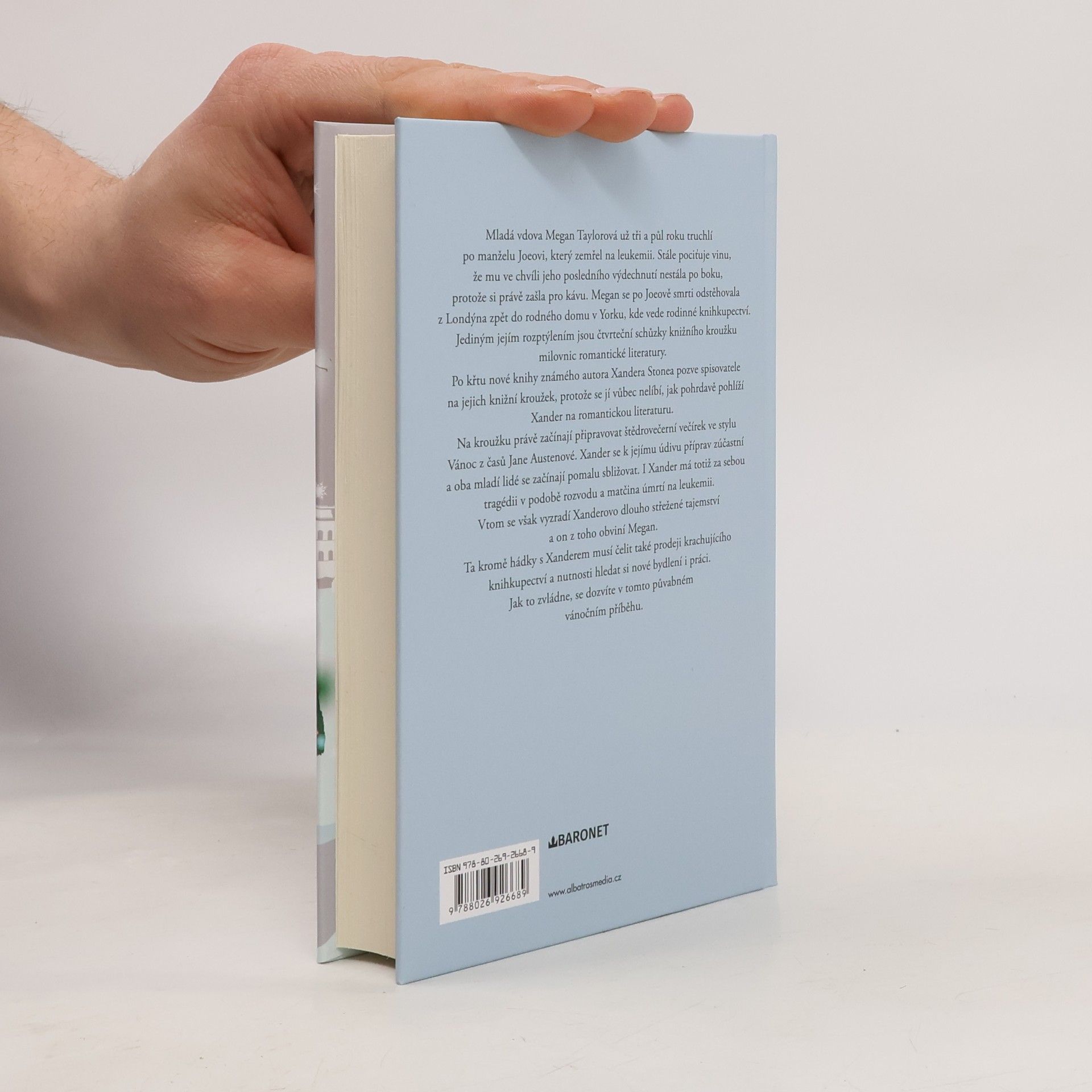 Mladá vdova Megan Taylorová už tři a půl roku truchlí po manželu Joeovi, který zemřel na leukemii. Stále pociťuje vinu, že mu ve chvíli jeho posledního vydechnutí nestála po boku, protože si právě zašla pro kávu. Megan se po Joeově smrti odstěhovala z Londýna zpět do rodného domu v Yorku, kde vede rodinné knihkupectví. Jejím jediným rozptýlením jsou čtvrteční schůzky knižního kroužku milovnic romantické literatury. Po křtu nové knihy známého autora Xandera Stonea pozve spisovatele na jejich knižní kroužek, protože se jí vůbec nelíbí, jak pohrdavě pohlíží Xander na romantickou literaturu. Na kroužku právě začínají připravovat štědrovečerní večírek ve stylu Vánoc z časů Jane Austenové. Xander se k jejímu údivu příprav zúčastní a oba mladí lidé se začínají pomalu sbližovat. I Xander má totiž za sebou tragédii v podobě rozvodu a matčina úmrtí na leukemii. Vtom se však vyzradí Xanderovo dlouho střežené tajemství a on z toho obviní Megan. Ta kromě hádky s Xanderem musí čelit také prodeji krachujícího knihkupectví a nutnosti hledat si nové bydlení i práci. Jak to zvládne, se dozvíte v tomto půvabném vánočním příběhu.