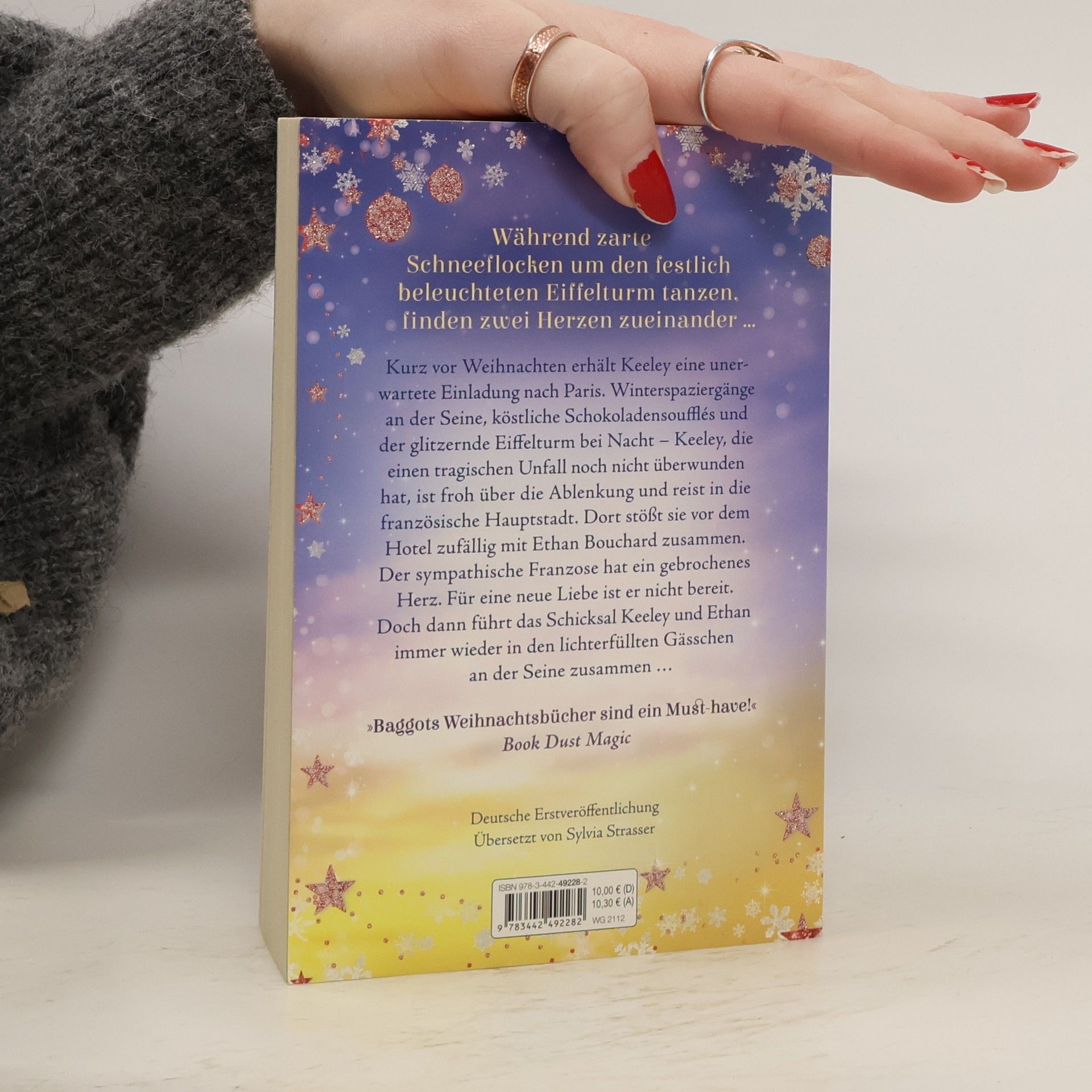 Zarte Schneeflocken tanzen um den festlich beleuchteten Eiffelturm, und zwei Herzen finden zueinander ... Kurz vor Weihnachten erhält Keeley eine unerwartete Einladung nach Paris. Winterspaziergänge an der Seine, köstliche Schokoladensoufflés und der glitzernde Eiffelturm bei Nacht – Keeley, die einen tragischen Unfall noch nicht überwunden hat, ist froh über die Ablenkung und reist in die französische Hauptstadt. Dort stößt sie vor dem Hotel zufällig mit Ethan Bouchard zusammen. Der sympathische Franzose hat ein gebrochenes Herz und ist im Begriff, seine Hotelkette zu verlieren. Für eine neue Liebe ist er nicht bereit. Doch dann führt das Schicksal Keeley und Ethan immer wieder in den charmanten, lichterfüllten Gässchen an der Seine zusammen …