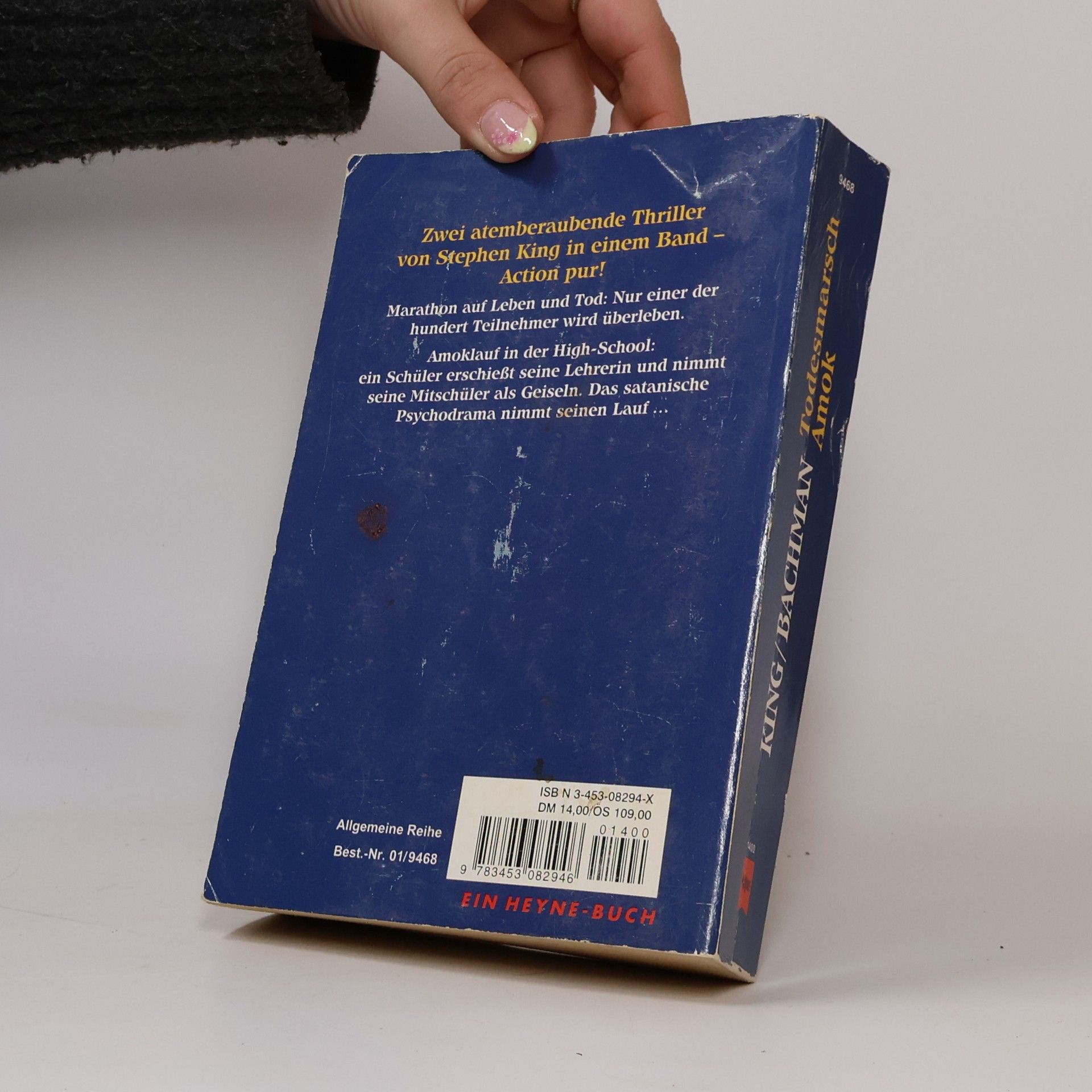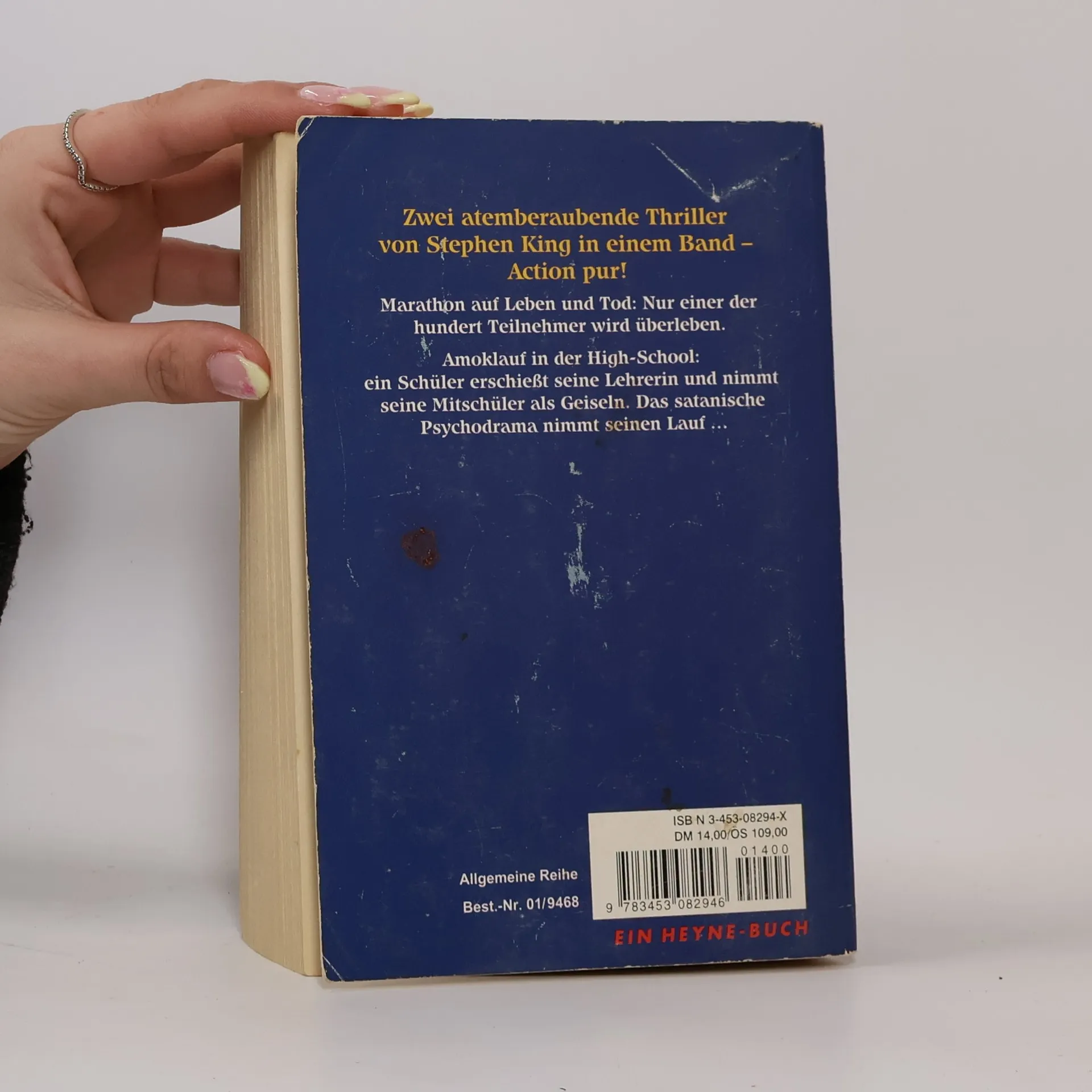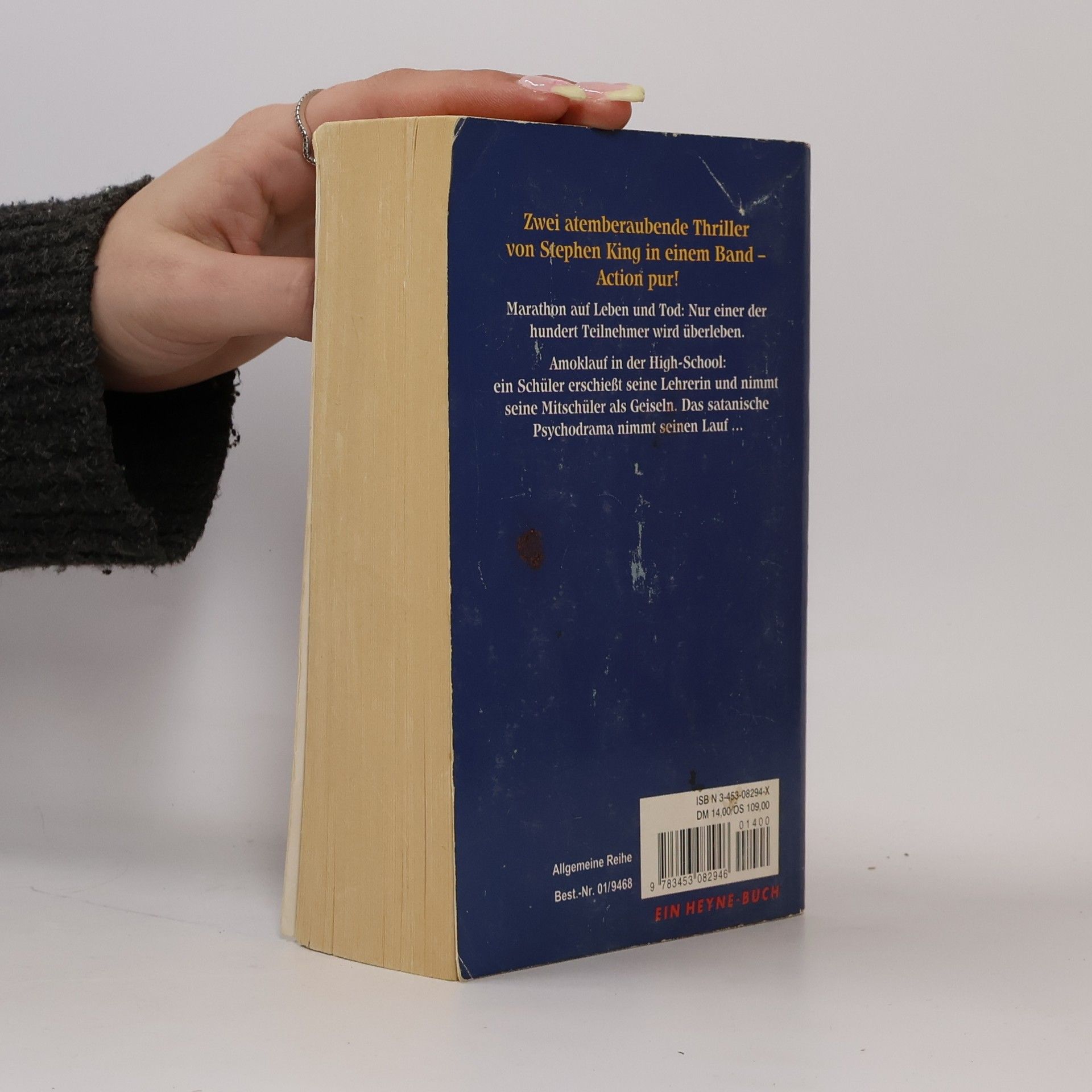Ray Garraty ist einer von 100 Teilnehmern des Todesmarschs - ein jährlicher Wettbewerb um den ultimativen Preis in einer düsteren Zukunftsvision der USA. Der Marsch nach Süden beginnt an der kanadischen Grenze und ist mit dem Tod des vorletzten Gegners zu Ende. Der Sieger erhält bis an sein Lebensende alles, was er sich wünscht. Die Regeln sind einfach: Man darf nicht anhalten und eine bestimmte Mindestgeschwindigkeit nicht unterschreiten. Ansonsten wird man verwarnt und statt der vierten Verwarnung gibt es die rote Karte - in Form einer tödlichen Kugel ...---------------------------Ein Schüler erschießt zwei Lehrer und nimmt seine Mitschüler als Geiseln. Lange bevor Jugendliche mit Schusswaffen zum realen Alptraum an amerikanischen Highschools werden, zeigt Stephen King in seinem Roman die Ursachen der beklemmenden Verzweiflung, aus der manche sich nur mit scheinbar sinnloser Gewalt befreien können.