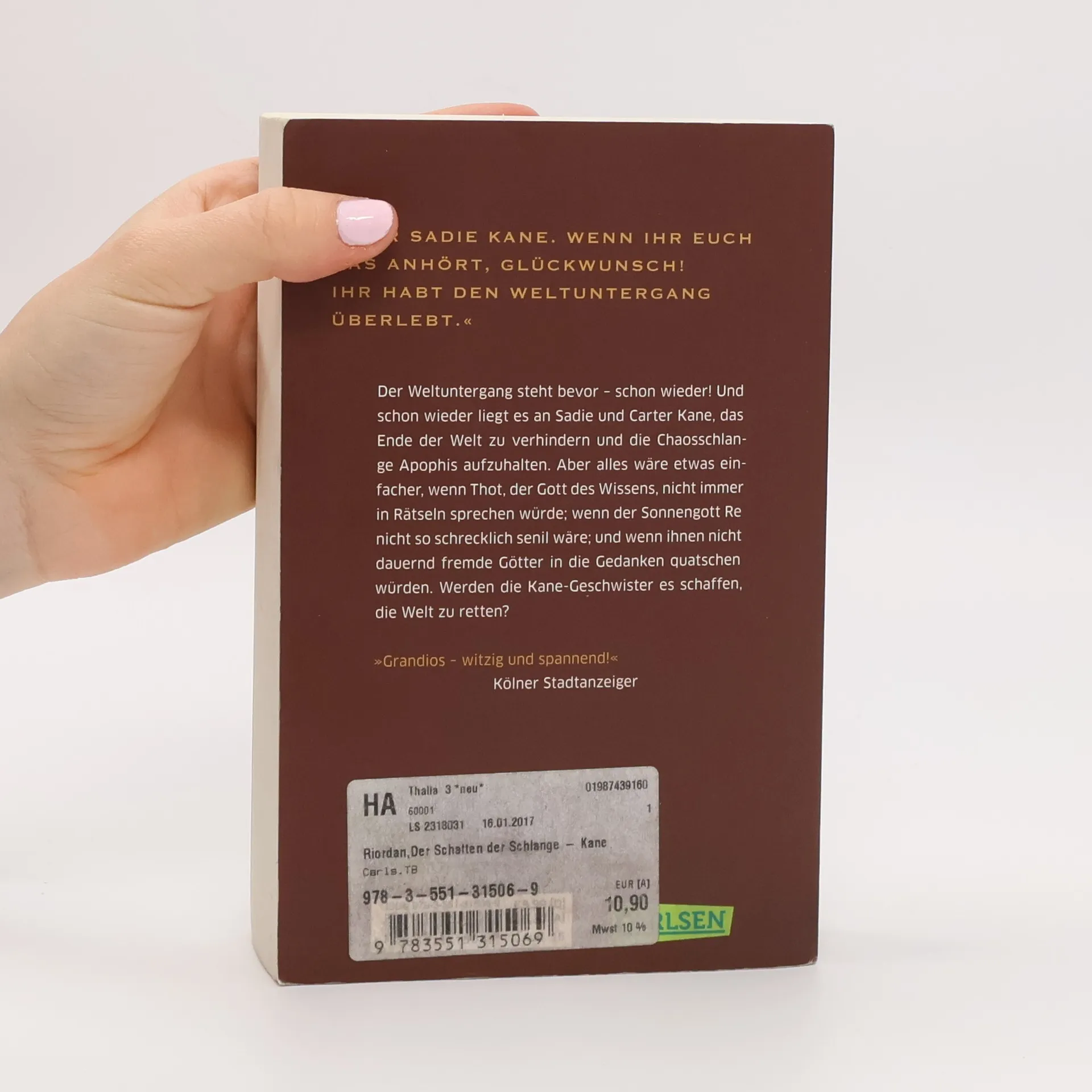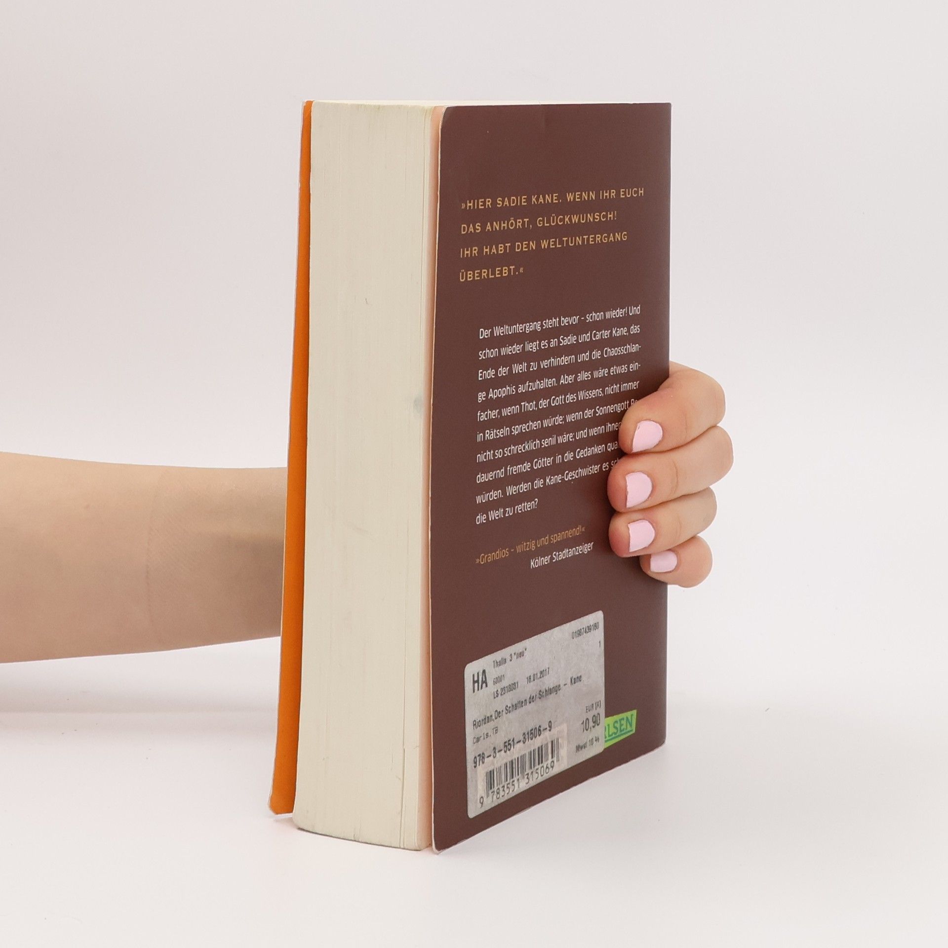 Ägyptische Götter, verlorene Zauber und ein Schatten, der das Schicksal entscheidet Irgendwie wird alles immer schwieriger! Chaos-Gott Apophis bereitet seinen Gefängnisausbruch vor. Den Geschwistern Carter und Sadie bleiben nur wenige Tage Zeit, das zu verhindern. Und leider können sie nicht sicher sein, dass die Magier auf ihrer Seite stehen. Wenn sie doch nur Apophis’ Schatten beeinflussen könnten! Dann hätten sie eine Chance, die Welt nicht dem Chaos zu überlassen. Doch wer ist Freund und wer Feind? Packende Fantasy-Trilogie mit mächtigen Magiern, wild gewordenen Göttern und mythologischen Monstern Die Geschwister Carter und Sadie Kane entdecken, dass sie die Nachkommen von Pharaonen sind und eine besondere Verbindung zu den ägyptischen Göttern haben. Nach einer missglückten Götterbeschwörung durch ihren Vater begibt sich das ungleiche Geschwisterpaar auf eine abenteuerliche Reise. Nur wenn sie ihre Kräfte bündeln und zusammenarbeiten, können sie die Welt retten. In der Fantasy-Buchreihe „Die Kane-Chroniken“ vermischt Rick Riordan die antike ägyptische Kultur und Mythologie mit der modernen Welt und entführt seine Leser*innen in ein rasantes Abenteuer mit spannenden Wendungen bis zur letzten Seite. ***Die Götter Ägyptens erwachen in der modernen Welt – rasant, actionreich und witzig: für Leser*innen ab 12 Jahren und für alle Fans der ägyptischen Mythologie***