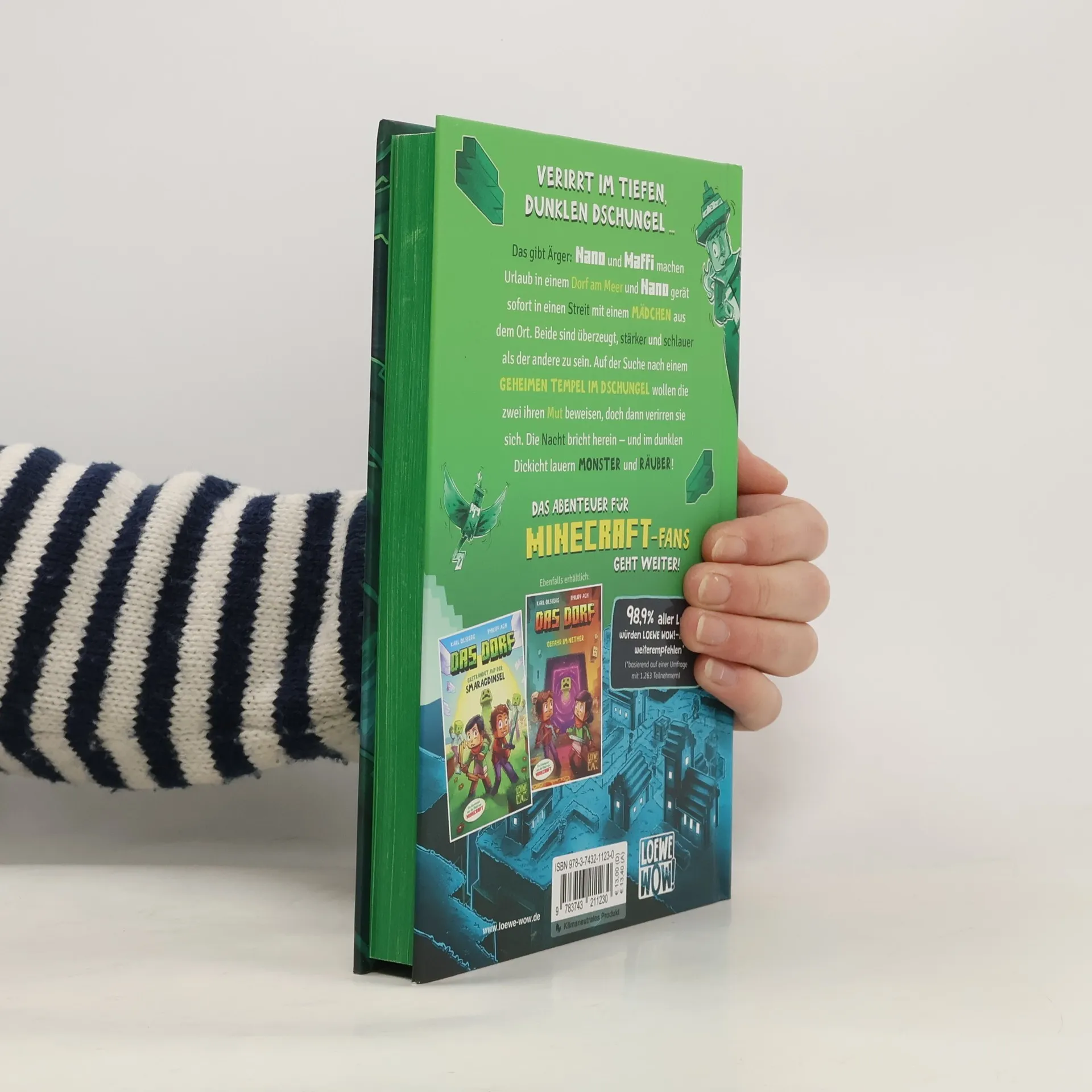 Verirrt im tiefen, dunklen Dschungel … Nano und Maffi machen Urlaub in einem Dorf am Meer, wo Nano sofort in einen Streit mit einem Mädchen aus dem Ort gerät. Beide sind überzeugt, stärker und schlauer als der andere zu sein. Auf der Suche nach einem geheimen Tempel im Dschungel wollen sie ihren Mut beweisen, doch sie verirren sich. Die Nacht bricht herein – und im Dunkeln lauern Monster und Räuber! Das Abenteuer für Minecraft-Fans geht weiter! Die spannende Kinderbuchreihe für Kinder ab 8 Jahren bietet viel Action, Humor und coole Schwarz-Weiß-Illustrationen im Minecraft-Stil. Eine perfekte Mischung für alle Fans des Computerspiels und von Abenteuergeschichten! Entdecke die einzigartigen Geschichten, deren prämierte Erzählweise und ansprechende Gestaltung jedes Kind fürs Lesen begeistert. Auch leseerfahrene Kinder finden schnell neue Lieblingsgeschichten. Mit liebevollen Charakteren, die man gerne auf ihren Abenteuern begleitet, bietet die Reihe mitreißende Abenteuergeschichten, spannende Kinderkrimis und witzige Fantasygeschichten – für jedes Kind gibt es das passende Buch. Die Loewe Wow!-Bücher sind motivierend, vielfältig und wurden mit dem Lesekompass 2020 & 2021 der Stiftung Lesen ausgezeichnet. 98,9 % der Kinder und Eltern, die ein Loewe Wow!-Buch gelesen haben, würden es weiterempfehlen. Lass dich von Loewe Wow! begeistern! Klimaneutrales Produkt – wir unterstützen ausgewählte Klimaprojekte!