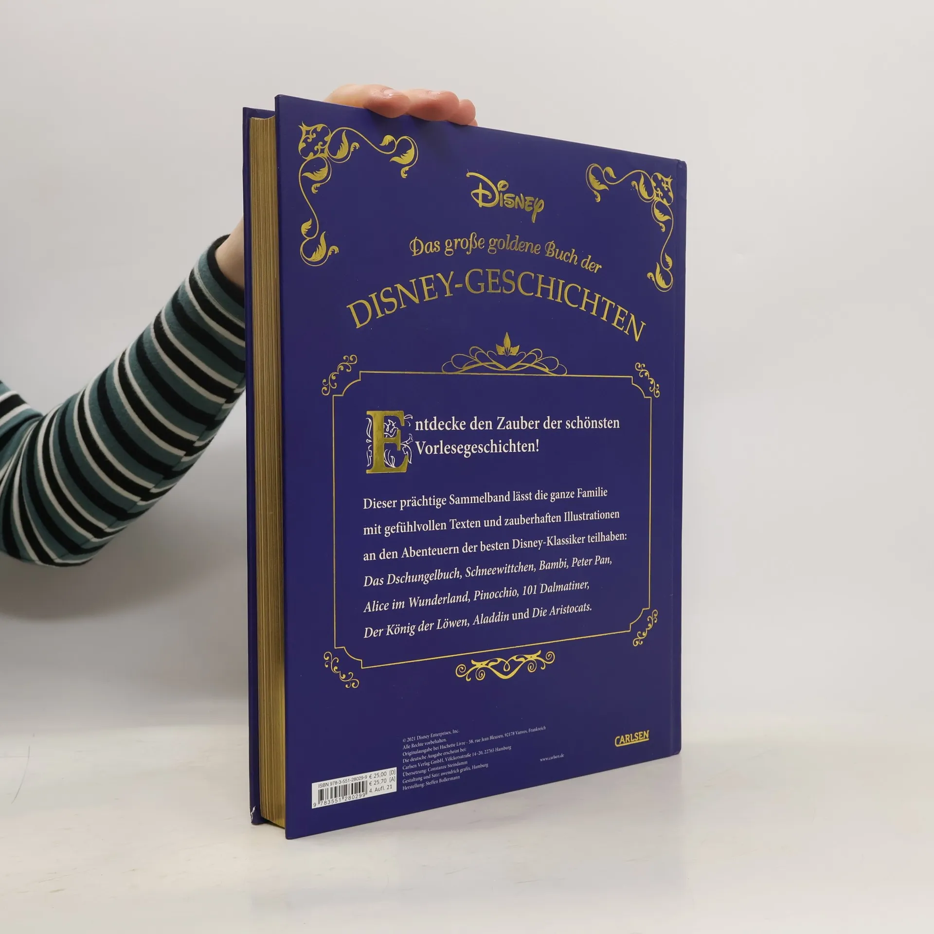 Dieser prächtige Sammelband für ganze Familie mit Goldschnitt, Lesebändchen und edelster Ausstattung lässt die ganze Familie mit gefühlvollen Texten und zauberhaften Illustrationen an den Abenteuern der besten Disney-Geschichten teilhaben: Das Dschungelbuch, Bambi, Schneewittchen, Peter Pan, Alice im Wunderland, Pinocchio, 101 Dalmatiner, Der König der Löwen, Aladdin und Die Aristocats.