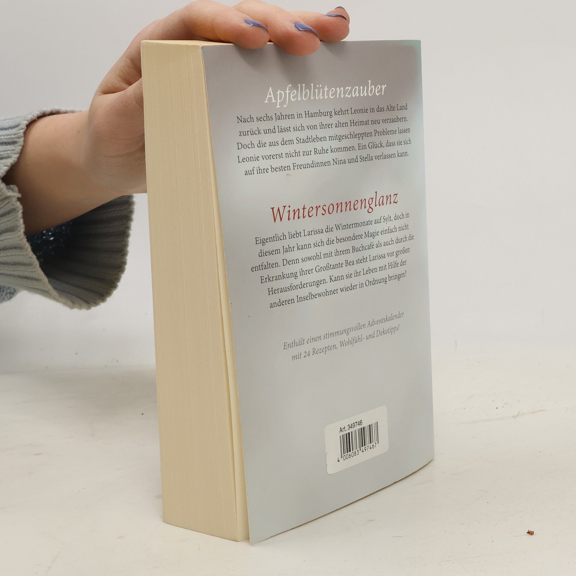 ApfelblütenzauberNach sechs Jahren in Hamburg kehrt Leonie in das Alte Land zurück und lässt sich von ihrer alten Heimat neu verzaubern. Doch die aus dem Stadtleben mitgeschleppten Probleme lassen Leonie vorerst nicht zur Ruhe kommen. Ein Glück, dass sie sich auf ihre besten Freundinnen Nina und Stella verlassen kann.WintersonnenglanzEigentlich liebt Larissa die Wintermonate auf Sylt, doch in diesem Jahr kann sich die besondere Magie einfach nicht einstellen. Denn sowohl mit ihrem Buchcafé als auch durch die Erkrankung ihrer Großtante Bea steht Larissa vor großen Herausforderungen. Kann sie ihr Leben mit Hilfe der anderen Inselbewohner wieder in Ordnung bringen?Enthält einen stimmungsvollen Adventskalender mit 24 Rezepten, Wohlfühl- und Dekotipps!