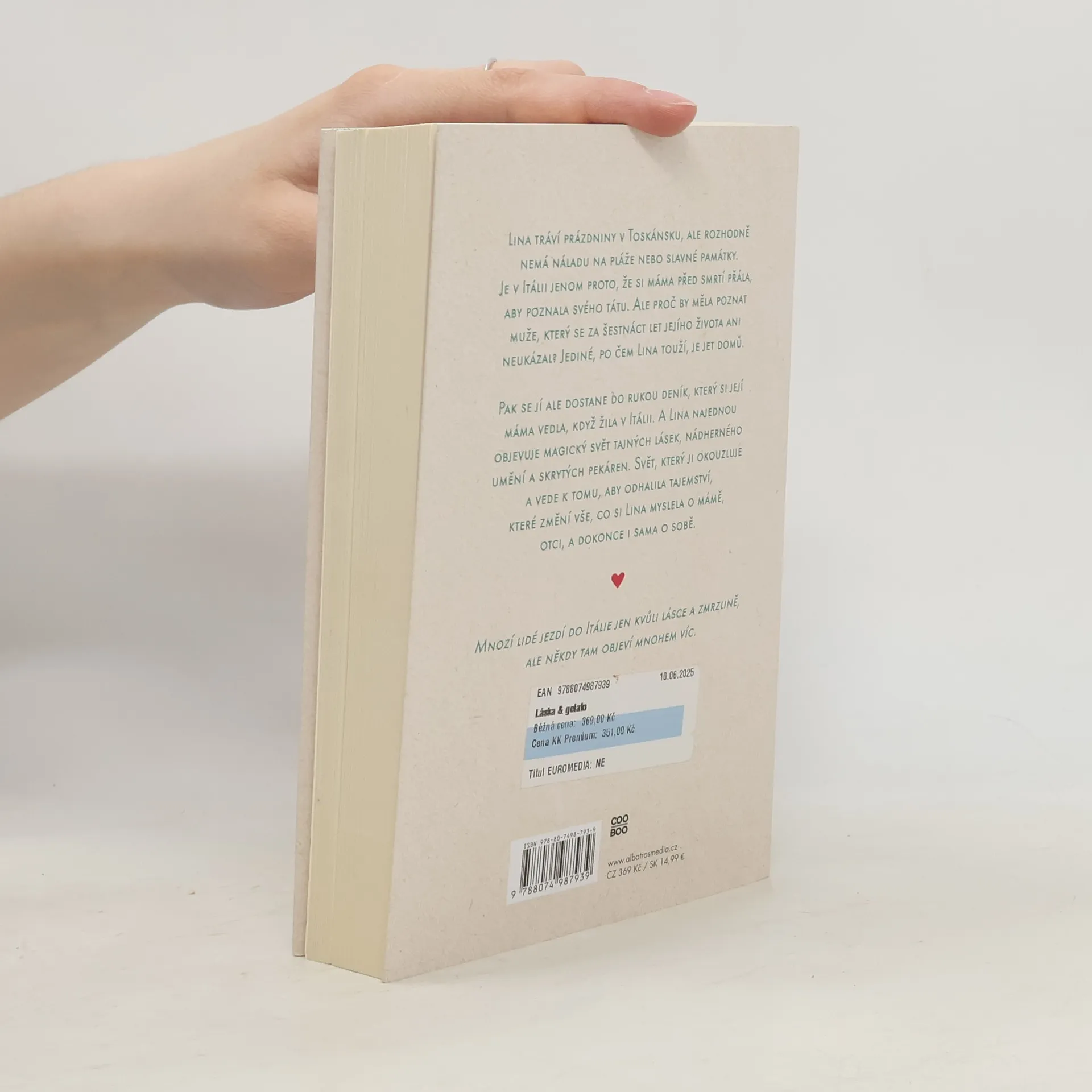 To pravé letní čtení plné lásky a zmrzliny! Lina tráví prázdniny v Toskánsku, ale nemá náladu na pláže nebo památky. Je v Itálii jenom proto, že si máma před smrtí přála, aby poznala svého otce. Ale proč by měla poznat otce, který se za celý její život ani neukázal? Pak se jí ale dostane do rukou deník, který si její máma vedla, když žila v Itálii. A Lina najednou objevuje magický svět tajných lásek, nádherného umění a skrytých pekáren a odhaluje tajemství, které změní vše, co si myslela o mámě, otci, a dokonce i sama o sobě.