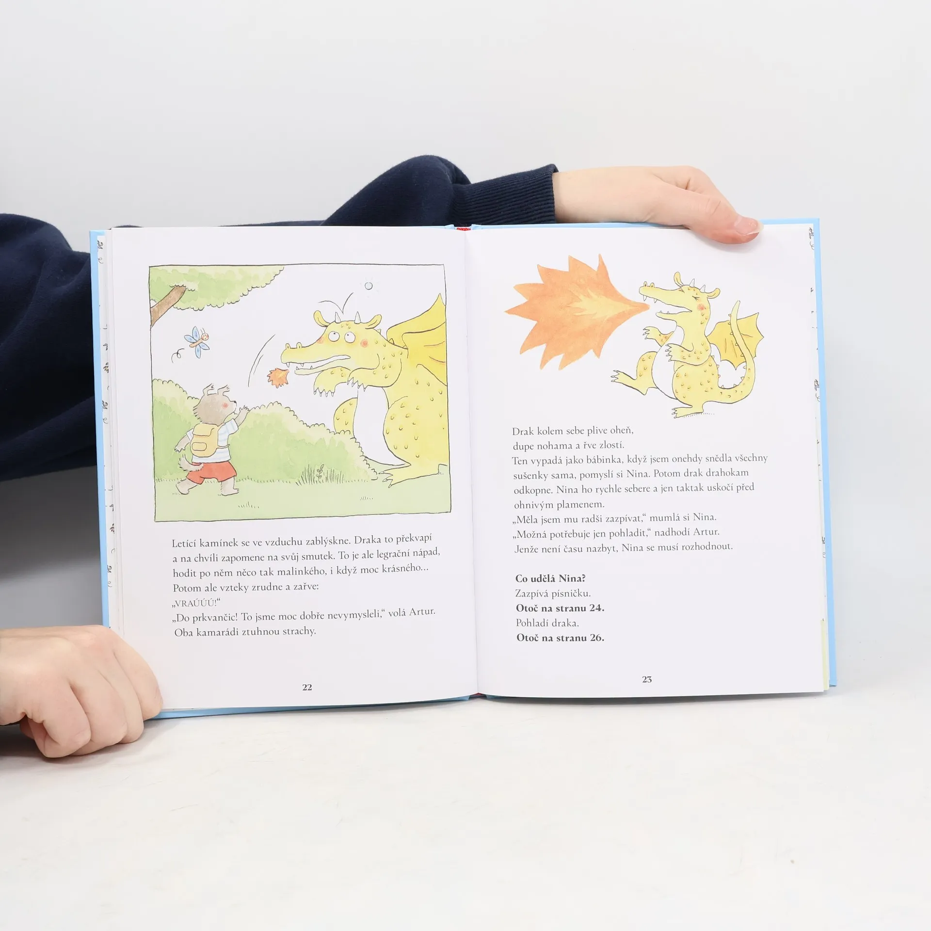 Vtipný příběh pro nejmenší na principu gamebooku.„Já nechci, aby vlk sežral Karkulku!“ „A proč musí Sněhurka kousnout do jablka?!“ Někdy je čtení zkrátka frustrující — víte, co v pohádce bude následovat, tušíte, že se blíží katastrofa, a nemůžete s tím nic dělat… Anebo můžete?Marianne Dubucová napsala a nakreslila příběh, ve kterém si sami určujete, jak se bude děj odvíjet. Děti ve věku kolem tří let mají ostatně sklony k „já sám“ v krvi. Když jim vysvětlíte, že můžou místo hlavních hrdinů rozhodnout, co se bude dít dál, stoprocentně budou nadšené. Každé nové čtení navíc nabízí možnost nechat příběh plynout jinou cestou. No není to splněný sen?Seznamte se s Ninou a Edou a vyrazte s nimi na ryby. Ale pozor na Edu, ať se vám neztratí! Nechceme sýčkovat, ale kdyby se přece jen náhodou ztratil, tak v tom hlavně nenechte Ninu samotnou a dobře zvažte každý krok.