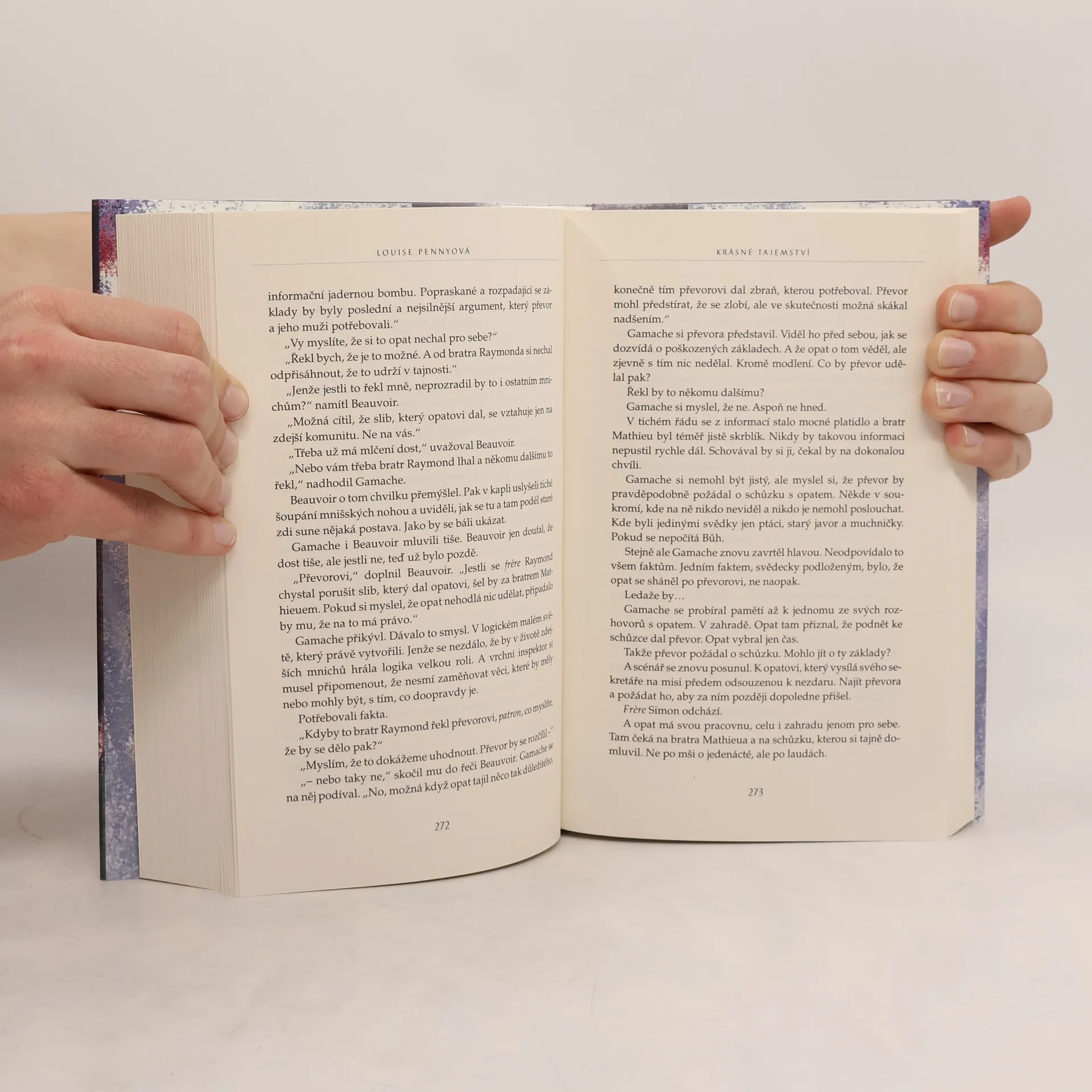 Další z případů vrchního inspektora Gamache zavádí čtenáře do prostředí gilbertýnů, tajemstvím zahaleného mnišského řádu, jehož utajený klášter se stal místem podivné smrti. V před světem uzavřeném klášteře Saint-Gilbert-Entre-les-Loups žije v poklidu a modlitbách dvacet mnichů. Ironií je, že společenství, které přijalo slib mlčení, se stalo proslulým pro svůj nádherný zpěv, jehož působení na posluchače je tak hluboké, že se mu přezdívá "krásné tajemství". Až když je zavražděn známý sbormistr, brána kláštera se otevře a vpustí vrchního inspektora Armanda Gamache ze slavné quebecké Sureté, který zde objeví neklid ve zdánlivé harmonii a je nucen konfrontovat se i se svými vlastními démony. Před odhalením vraha, před obnovením míru musí vrchní inspektor nejprve zvážit božské i lidské a zacelit trhliny mezi nimi. Nakladatelská anotace. Kráceno.