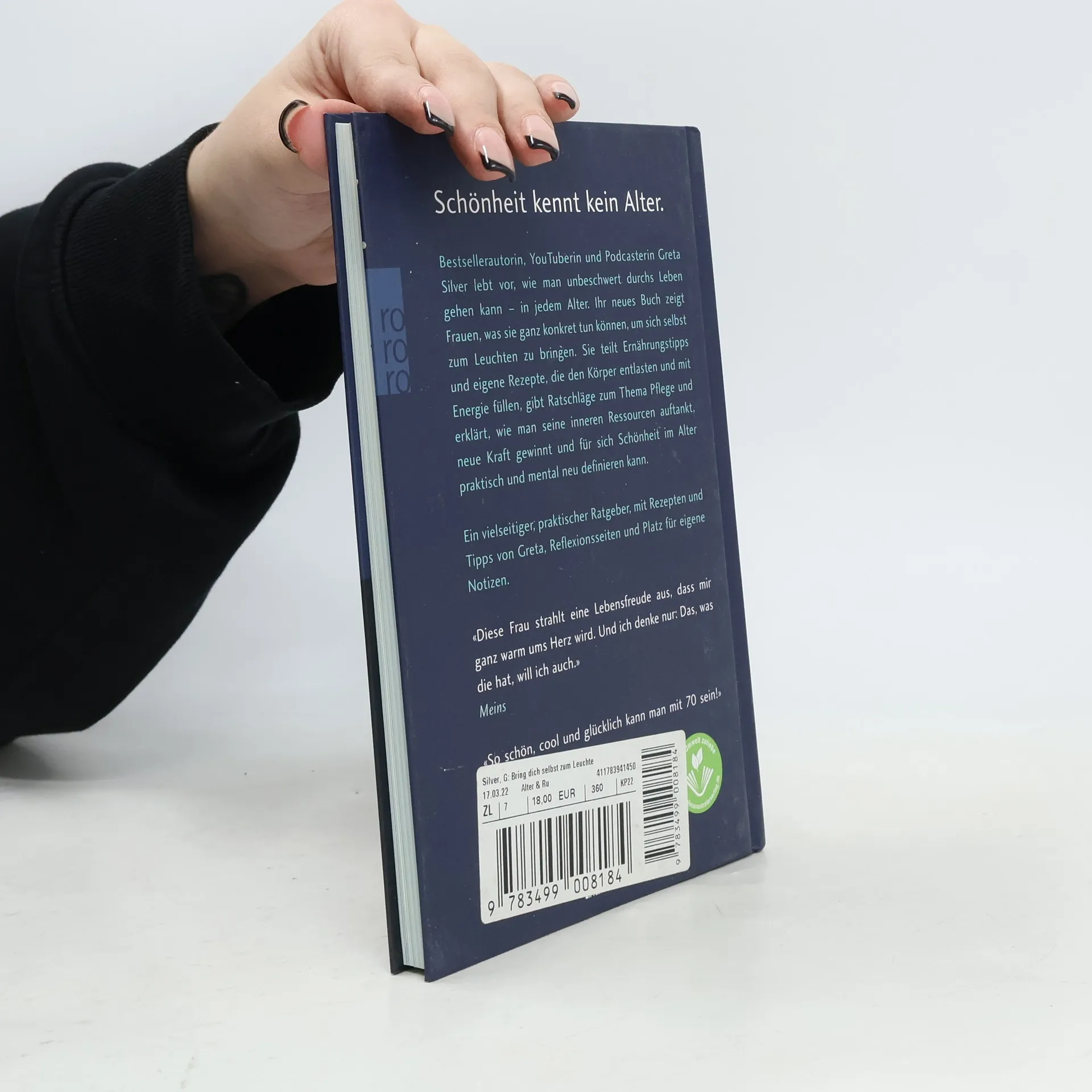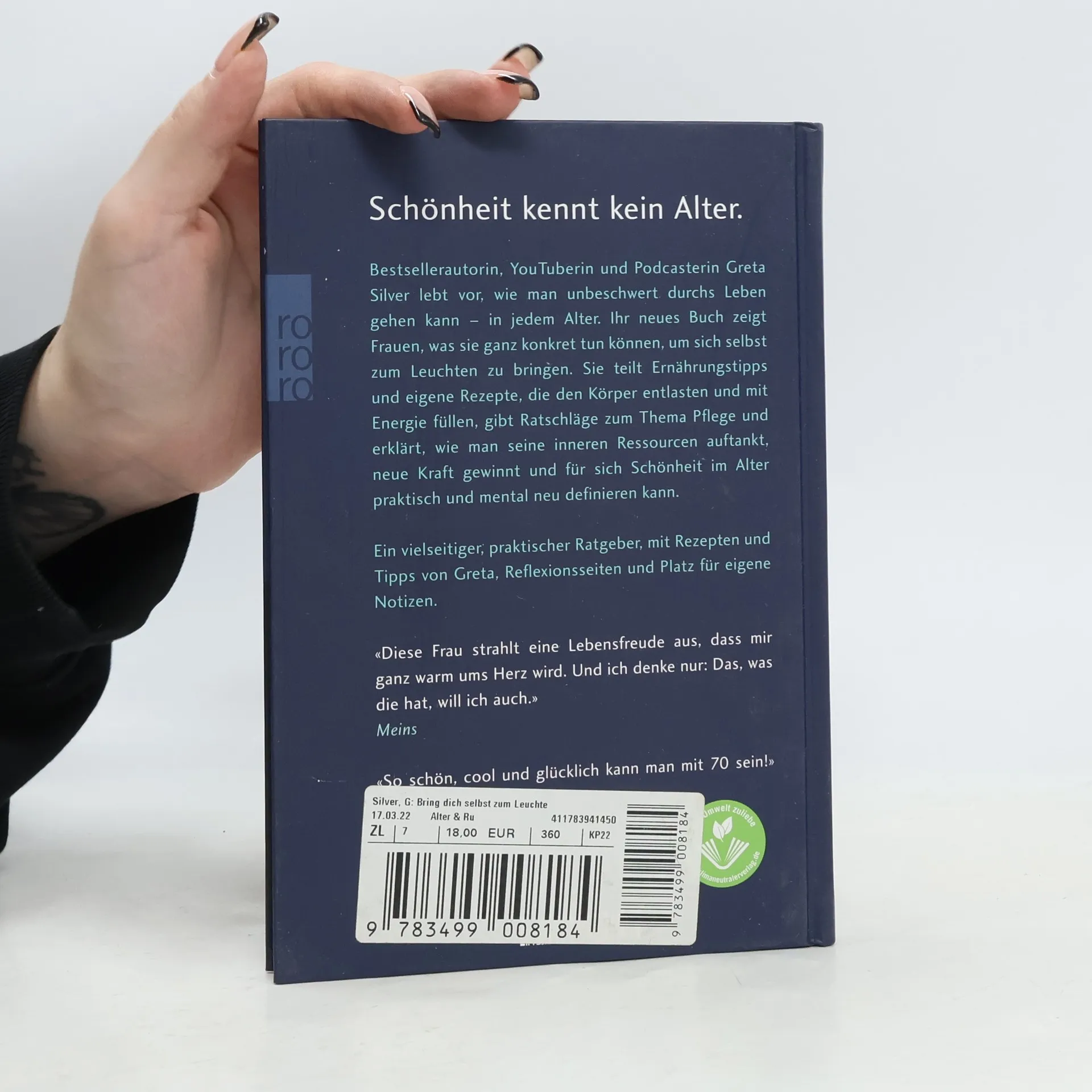 Schönheit kennt kein Alter Bestsellerautorin, YouTuberin, Podcasterin Greta Silver lebt vor, wie man unbeschwert durchs Leben gehen kann – in jedem Alter. Ihr neues Buch zeigt Frauen, was sie ganz konkret tun können, um sich selbst zum Leuchten zu bringen. Sie teilt Ernährungstipps und eigene Rezepte, die den Körper entlasten und mit Energie füllen, gibt Ratschläge zum Thema Pflege und erklärt, wie man seine inneren Ressourcen auftankt, neue Kraft gewinnt und für sich Schönheit im Alter praktisch und mental neu definieren kann. Ein vielseitiger, praktischer Ratgeber, mit Reflexionsseiten, Rezepten und Tipps von Greta und Platz für eigene Notizen. «Diese Frau strahlt eine Lebensfreude aus, dass mir ganz warm ums Herz wird. Und ich denke nur: Das, was die hat, will ich auch.» Meins «So schön, cool und glücklich kann man mit 70 sein!» BILD der FRAU