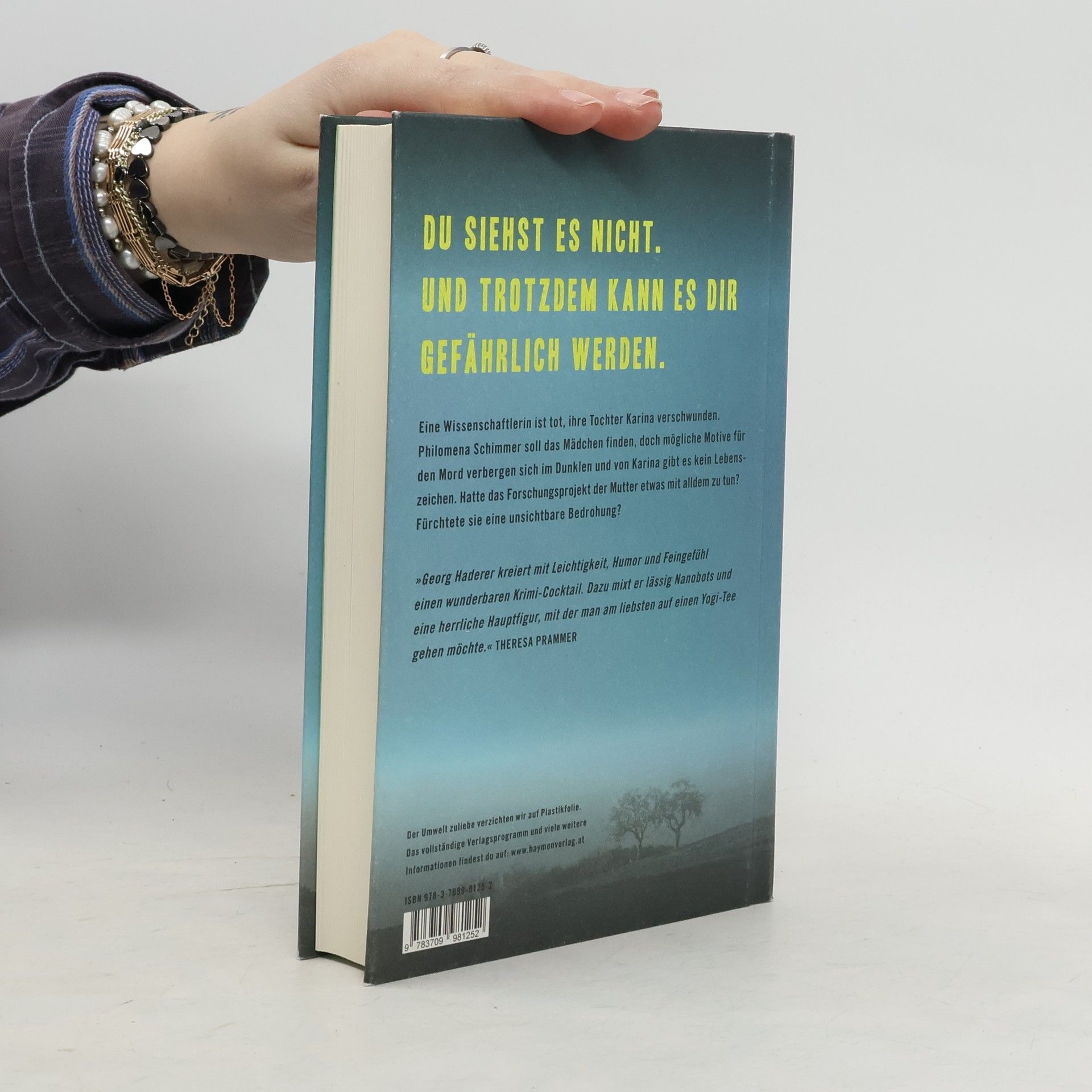 DU SIEHST ES NICHT. UND TROTZDEM KANN ES DIR GEFÄHRLICH WERDEN ... PHILOMENA SCHIMMER KÄMPFT GEGEN EINE UNSICHTBARE BEDROHUNG. Eine Frau ist tot, ihre Tochter verschwunden. Als Helena Sartori, eine leidenschaftliche Wissenschaftlerin, die an Nanobots forschte, ermordet aufgefunden wird, wird Philomena Schimmer beauftragt, die vermisste Karina zu suchen. Helene hat sich kurz vor ihrem Tod in eine wlanfreie Einöde zurückgezogen. Was geschah mit ihr? Hat ihre Arbeit an den winzigen Robotern die Familie ins Unglück gestürzt? Ist Karina am Leben oder wurde sie entführt? Je länger die Suche dauert, desto schwieriger wird es für Philomena, ihre professionelle Distanz zu wahren. Plötzlich taucht ein alter Fall aus ihrer Vergangenheit auf – eine junge Frau, die sie damals nicht retten konnte. Philomena liebt ihre Schwestern, hat aber auch ihre Nerven. Ihr Exfreund bleibt ein Teil ihres Lebens, obwohl er längst eine neue Beziehung hat. Als Polizistin sieht sie Dinge, die andere nicht wahrnehmen, und entdeckt kleinste Hinweise. Nach einer traumatischen Erfahrung hat sie mysteriöse „Besucher“, die sie nicht ignorieren kann. Georg Haderer schafft mit Leichtigkeit und Humor einen fesselnden Krimi. Er konfrontiert den Leser mit der Angst vor der Dunkelheit und der Unsichtbarkeit von Gefahren, während er gleichzeitig für humorvolle Momente sorgt. Philomena Schimmer wird dich mitfühlen und mitfiebern lassen, während du versuchst, das Rätsel
