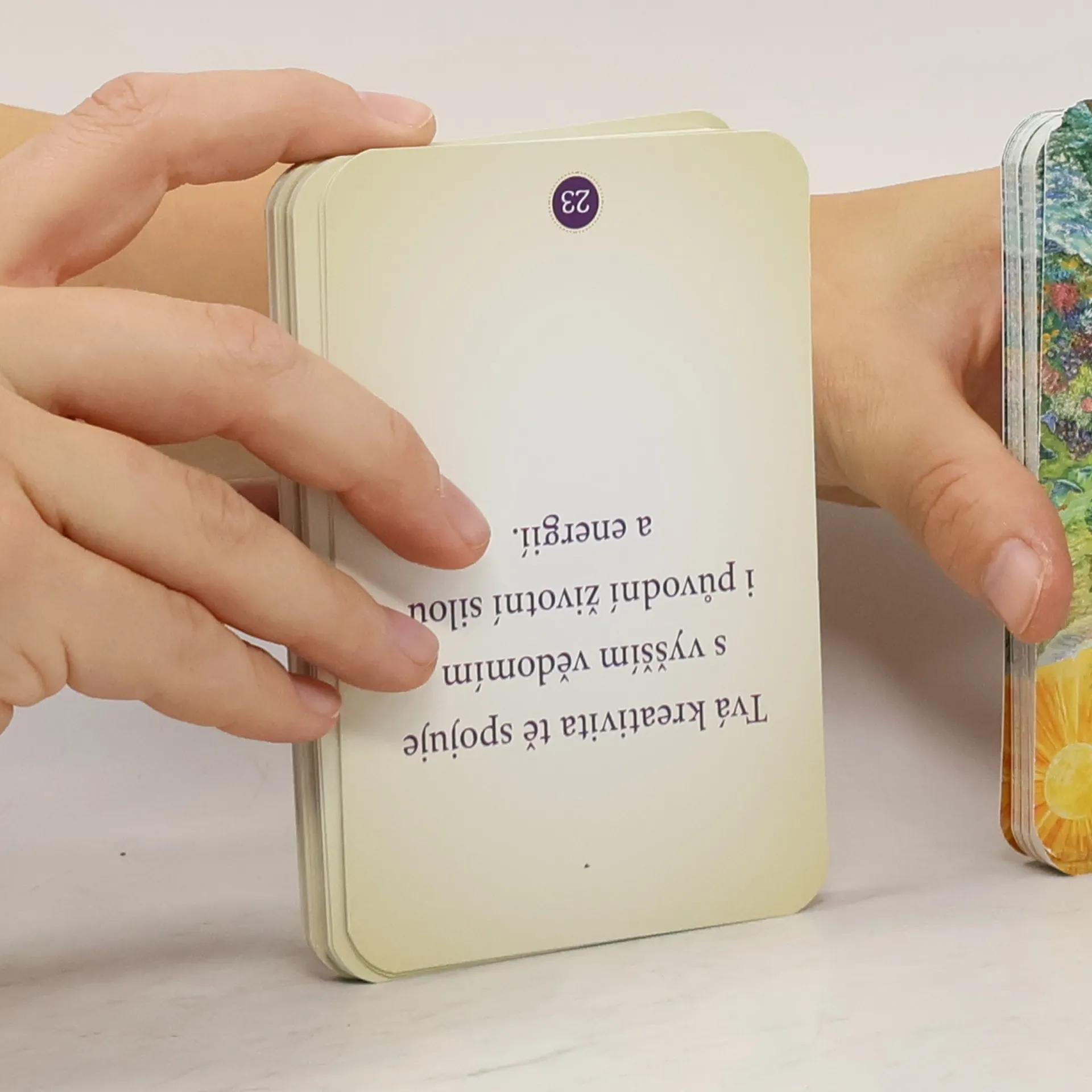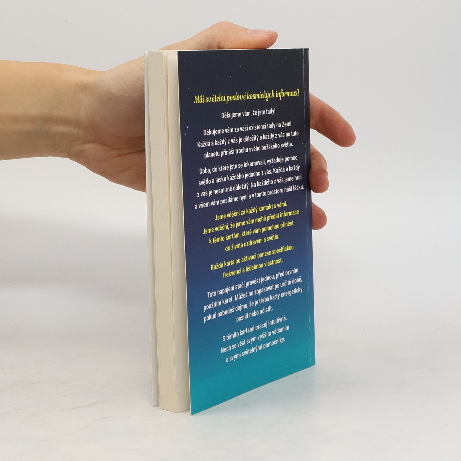 Doba, do které jste se inkarnovali, vyžaduje pomoc, světlo a lásku každého jednoho z vás. Každá a každý z vás je nesmírně důležitý. Na každého z vás jsme hrdí a všem vám posíláme nyní a v tomto prostoru naši lásku. Jsme vděční za každý kontakt s vámi. Jsme vděční, že jsme vám mohli předat informace k těmto kartám, které vám pomohou přinést do života uzdravení a světlo. Každá karta po aktivaci ponese specifickou frekvenci a léčebnou vlastnost. Toto napojení stačí provést jednou, před prvním použitím karet. Můžeš ho zopakovat po určité době, pokud nabudeš dojmu, že je třeba karty energeticky posílit nebo očistit. S těmito kartami pracuj intuitivně. Nech se vést svým vyšším vědomím a svými světelnými pomocníky. Kniha a karty uloženy ve společné kartonové krabici.