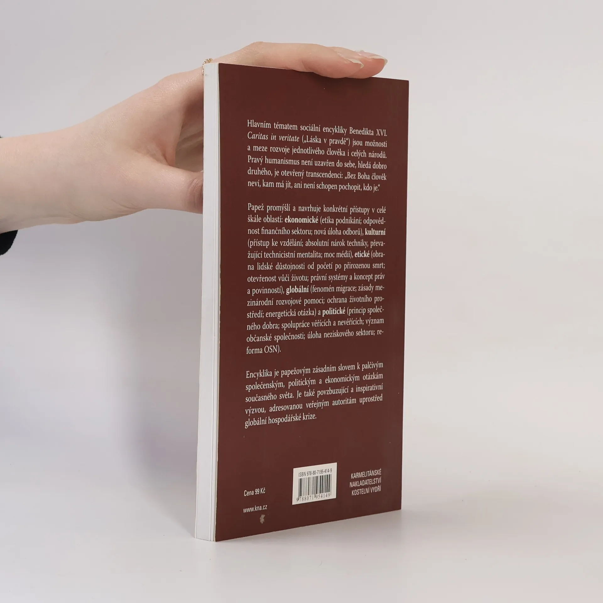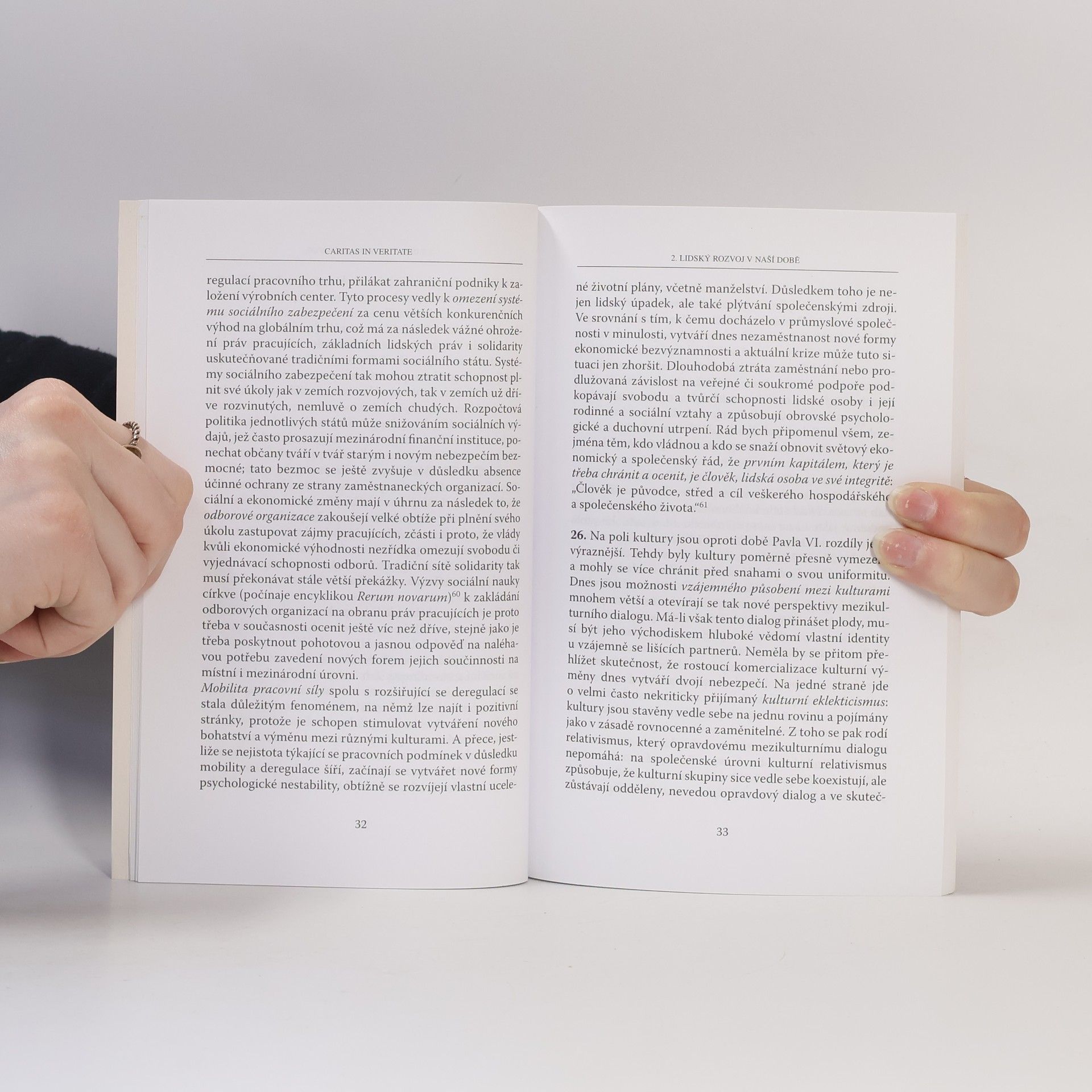 Hlavním tématem sociální encykliky Benedikta XVI. Caritas in veritate („Láska v pravdě“) jsou možnosti a meze rozvoje jednotlivého člověka i celých národů. Pravý humanismus není uzavřen do sebe, hledá dobro druhého, je otevřený transcendenci: „Bez Boha člověk neví, kam má jít, ani není schopen pochopit, kdo je.“ Papež promýšlí a navrhuje konkrétní přístupy v celé škále oblastí: ekonomické (etika podnikání; odpovědnost finančního sektoru; nová úloha odborů), kulturní (přístup ke vzdělání; absolutní nárok techniky, převažující technicistní mentalita; moc médií), etické (obrana lidské důstojnosti od početí po přirozenou smrt; otevřenost vůči životu; právní systémy a koncept práv a povinností), globální (fenomén migrace; zásady mezinárodní rozvojové pomoci; ochrana životního prostředí; energetická otázka) a politické (princip společného dobra; spolupráce věřících a nevěřících; význam občanské společnosti; úloha neziskového sektoru; reforma OSN). Encyklika je papežovým zásadním slovem k palčivým společenským, politickým a ekonomickým otázkám současného světa. Je také povzbuzující a inspirativní výzvou, adresovanou veřejným autoritám uprostřed globální hospodářské krize.