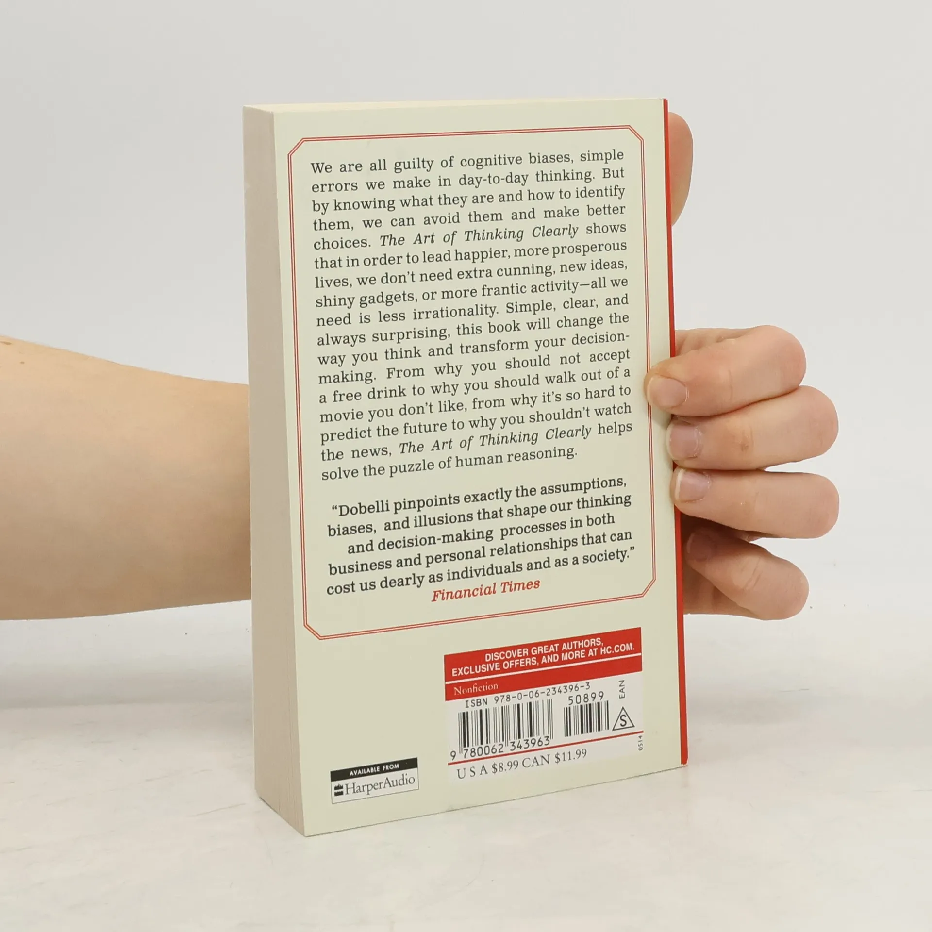 The Art of Thinking Clearly by world-class thinker and entrepreneur Rolf Dobelli is an eye-opening look at human psychology and reasoning — essential reading for anyone who wants to avoid “cognitive errors” and make better choices in all aspects of their lives. Have you ever: Invested time in something that, with hindsight, just wasn’t worth it? Or continued doing something you knew was bad for you? These are examples of cognitive biases, simple errors we all make in our day-to-day thinking. But by knowing what they are and how to spot them, we can avoid them and make better decisions. Simple, clear, and always surprising, this indispensable book will change the way you think and transform your decision-making—work, at home, every day. It reveals, in 99 short chapters, the most common errors of judgment, and how to avoid them.
