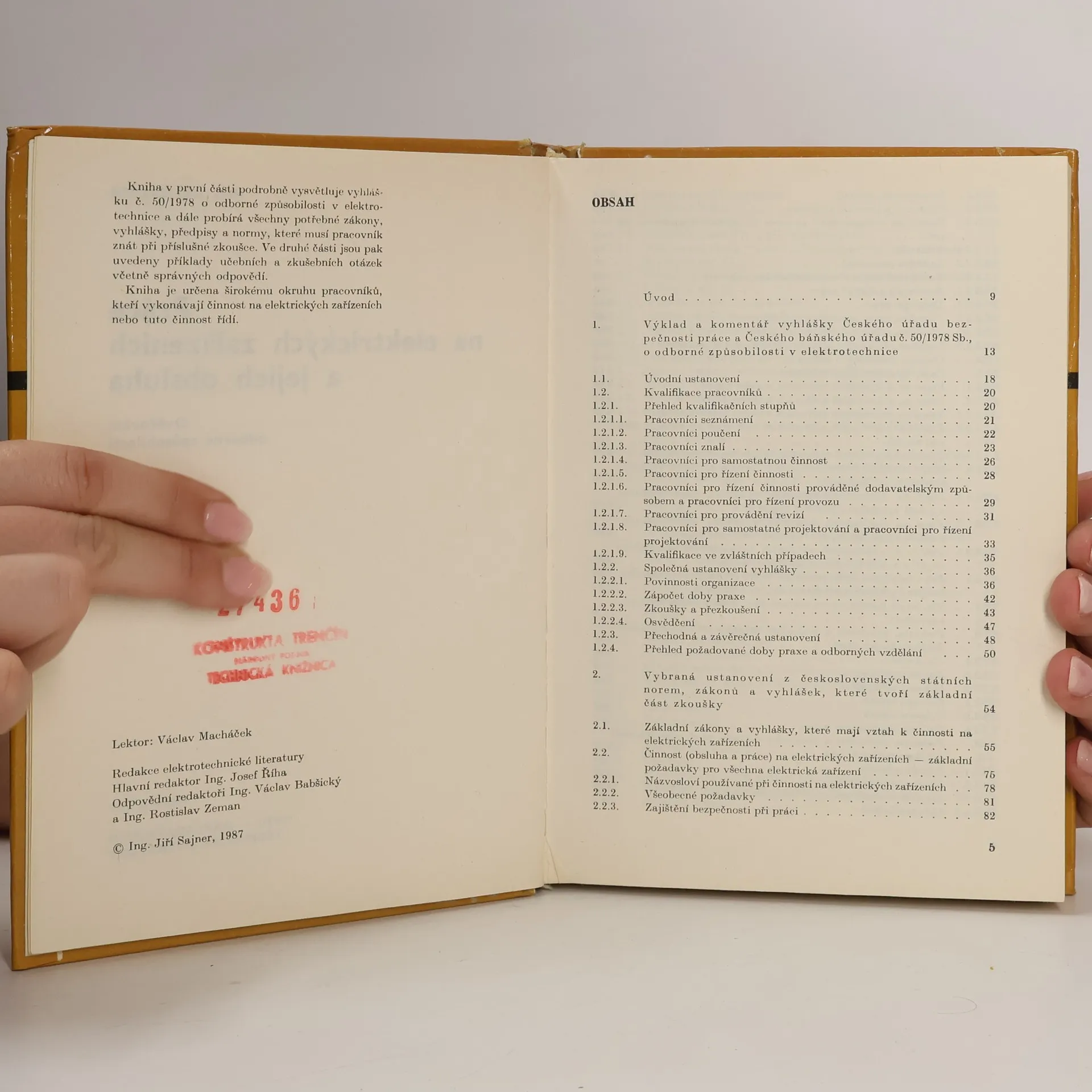 Kniha v první části podrobné vysvětluje vyhlášku č. 50/1978 u odborné způsobilosti v elektrotechnice a dále probírá všechny potřebné zákony, vyhlášky, předpisy a normy, které musí pracovník znát, při příslušné zkoušce. Ve druhé části jsou pak uvedeny příklady učebních a zkušebních otázek včetně správných odpovědí. Kniha je určena širokému okruhu pracovníků, kteří vykonávají činnost na elektrických zařízeních nebo tuto činnost řídí.