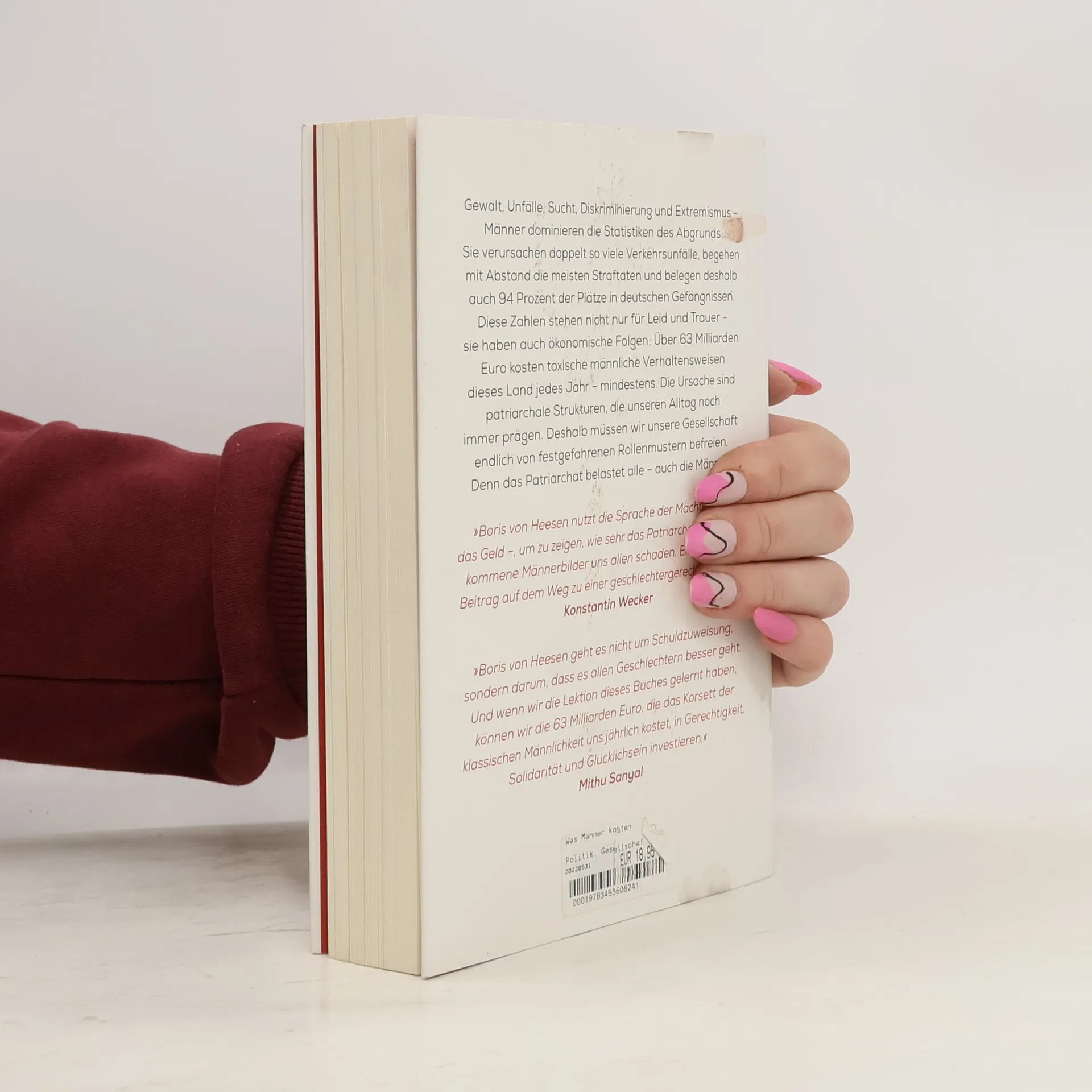 Gewalt, Unfälle, Sucht, Diskriminierung, Hate Speech und Extremismus – Männer dominieren die Statistiken des Abgrunds: Sie verursachen doppelt so viele Verkehrsunfälle, begehen mit Abstand die meisten Straftaten und belegen deshalb auch 94 Prozent der Plätze in deutschen Gefängnissen. 75 Prozent der Alkoholtoten jedes Jahr sind männlich und mehr als 80 Prozent der häuslichen Gewalt geht von Männern aus. Diese Zahlen stehen nicht nur für Schmerz und Trauer – sie verursachen auch immense Kosten. Boris von Heesen trägt erstmals Schritt für Schritt zusammen, wie hoch der Preis ist, den wir alle für toxische männliche Verhaltensweisen bezahlen: Über 63 Milliarden Euro kosten sie dieses Land jedes Jahr – mindestens. Er erläutert die Ursachen und zeigt Wege auf, wie wir diesem dramatischen Ungleichgewicht begegnen können: indem wir eine Gesellschaft schaffen, in der alle Geschlechter ihre Potentiale frei von patriarchalisch geprägten Klischees und festgefahrenen Rollenmustern entwickeln können. Ausstattung: mit Abb.