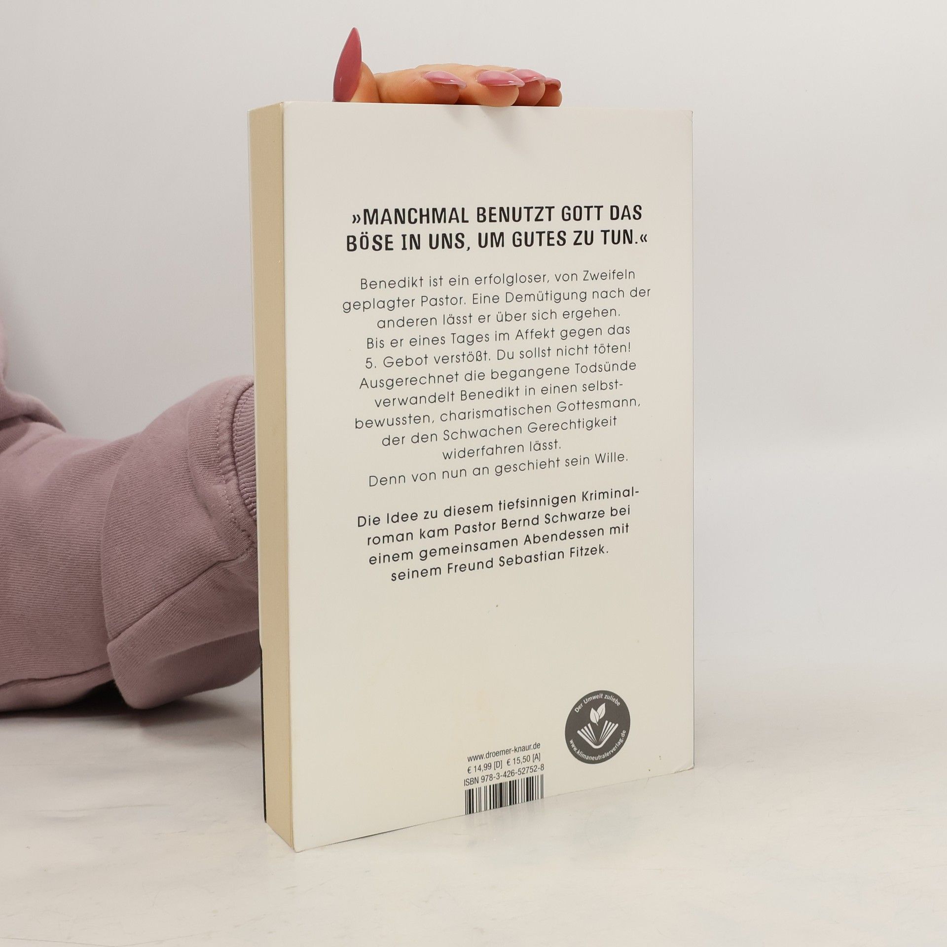 »Manchmal benutzt Gott das Böse in uns, um Gutes zu tun.« Ein erfolgloser, von Skrupeln geplagter Pastor ist plötzlich fähig, die Menschen mit seinen Predigten zu begeistern. Ursache seiner wundersamen Verwandlung: Der Kirchenmann hat eine Todsünde begangen – Mord! Ein ebenso ungewöhnlicher wie authentischer Kriminalroman, geschrieben vom pastoralen Leiter der Kultur- und Universitätskirche St. Petri zu Lübeck, Dr. theol. Bernd Schwarze. Im Affekt schlägt Pastor Benedikt Theves einem gewalttätigen Ehemann, der ihm ausgerechnet in der Sakristei seiner Kirche ein abscheuliches Video zeigt, das schwere silberne Altarkreuz über den Schädel. Tief erschüttert und gleichzeitig seltsam befreit versteckt der Pastor sein Opfer in der Krypta. Schon bald spürt er eine nie gekannte Energie in sich. Hat ausgerechnet sein Verstoß gegen das 5. Gebot ihm zu Selbstbewusstsein und Charisma verholfen? Um den Schwachen Gerechtigkeit widerfahren zu lassen, schwingt er ab sofort nicht nur das Kruzifix, sondern auch wirkmächtige Reden im Namen des Herrn. Er wird beliebter, seine Kirche platzt aus allen Nähten, aber nicht nur die schöne Frau des Opfers sucht auf einmal Theves` Nähe – sondern auch der misstrauische Hauptkommissar René Wilmers, der dem Pastor ebenso im Nacken sitzt wie sein schlechtes Gewissen … Die Idee zu diesem tiefsinnigen Kriminalroman kam Pastor Bernd Schwarze bei einem gemeinsamen Abendessen mit seinem Freund Sebastian Fitzek.