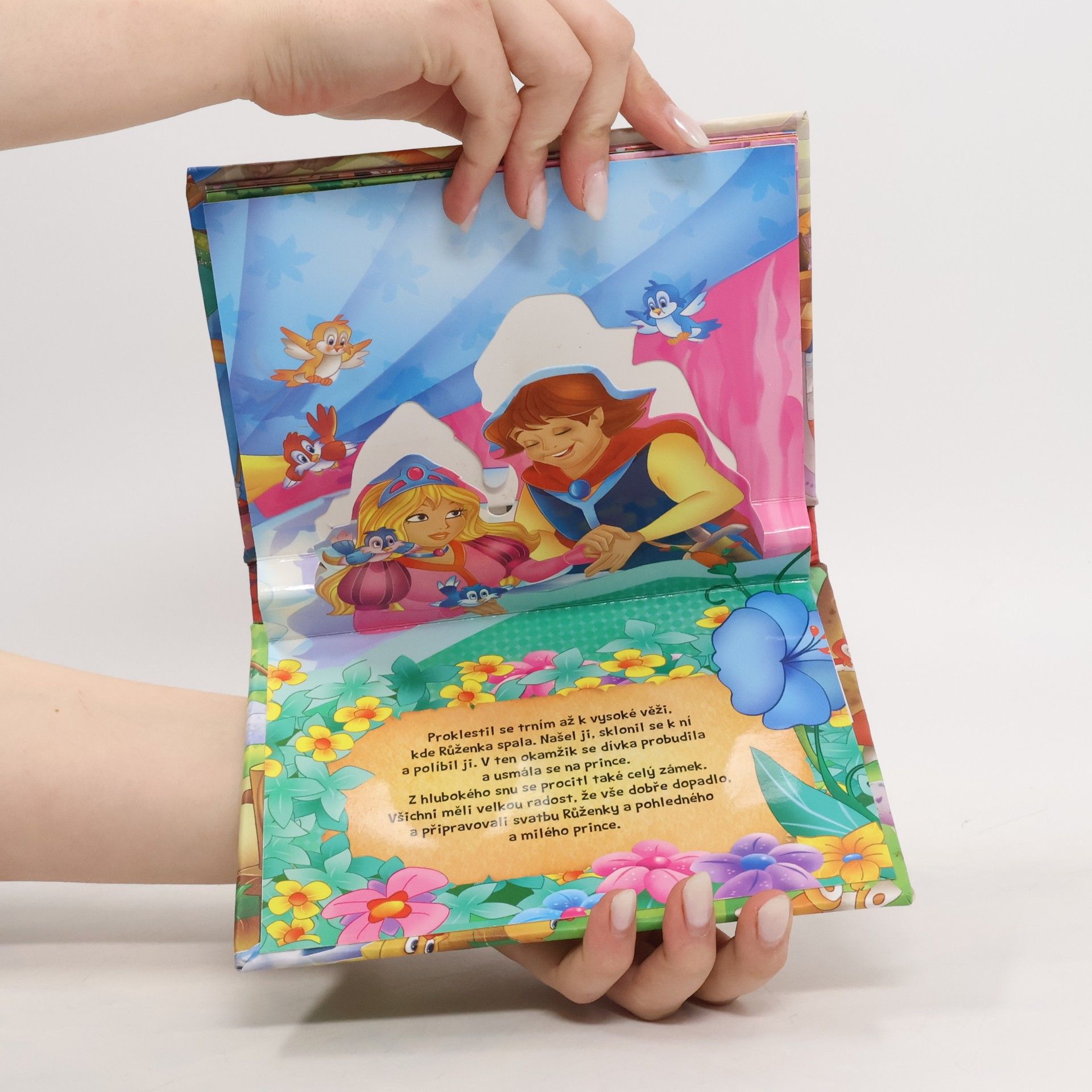 Převyprávěná klasická pohádka o princezně Růžence s obrázky, které po otevření každé dvojstrany dostanou třetí rozměr.