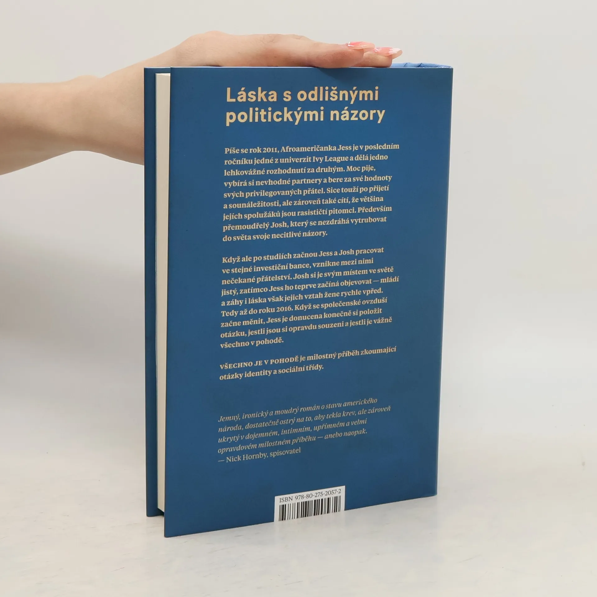 Láska s odlišnými politickými názory. Píše se rok 2011, Afroameričanka Jess je v posledním ročníku jedné z univerzit Ivy League a dělá jedno lehkovážné rozhodnutí za druhým. Moc pije, vybírá si nevhodné partnery a bere za své hodnoty svých privilegovaných přátel. Sice touží po přijetí a sounáležitosti, ale zároveň také cítí, že většina jejích spolužáků jsou rasističtí pitomci. Především přemoudřelý Josh, který se nezdráhá vytrubovat do světa svoje necitlivé názory. Když však po studiích začnou Jess a Josh pracovat ve stejné investiční bance, vznikne mezi nimi nečekané přátelství. Josh si je svým místem ve světě jistý, Jess ho teprve začíná objevovat mládí a záhy také láska však jejich vztah žene rychle vpřed. Tedy až do roku 2016. Když se společenské ovzduší začne měnit, Jess je donucena konečně si položit otázku, jestli jsou si opravdu souzeni a jestli je vážně všechno v pohodě. Všechno je v pohodě je milostný příběh, který zkoumá otázky identity a sociální třídy.