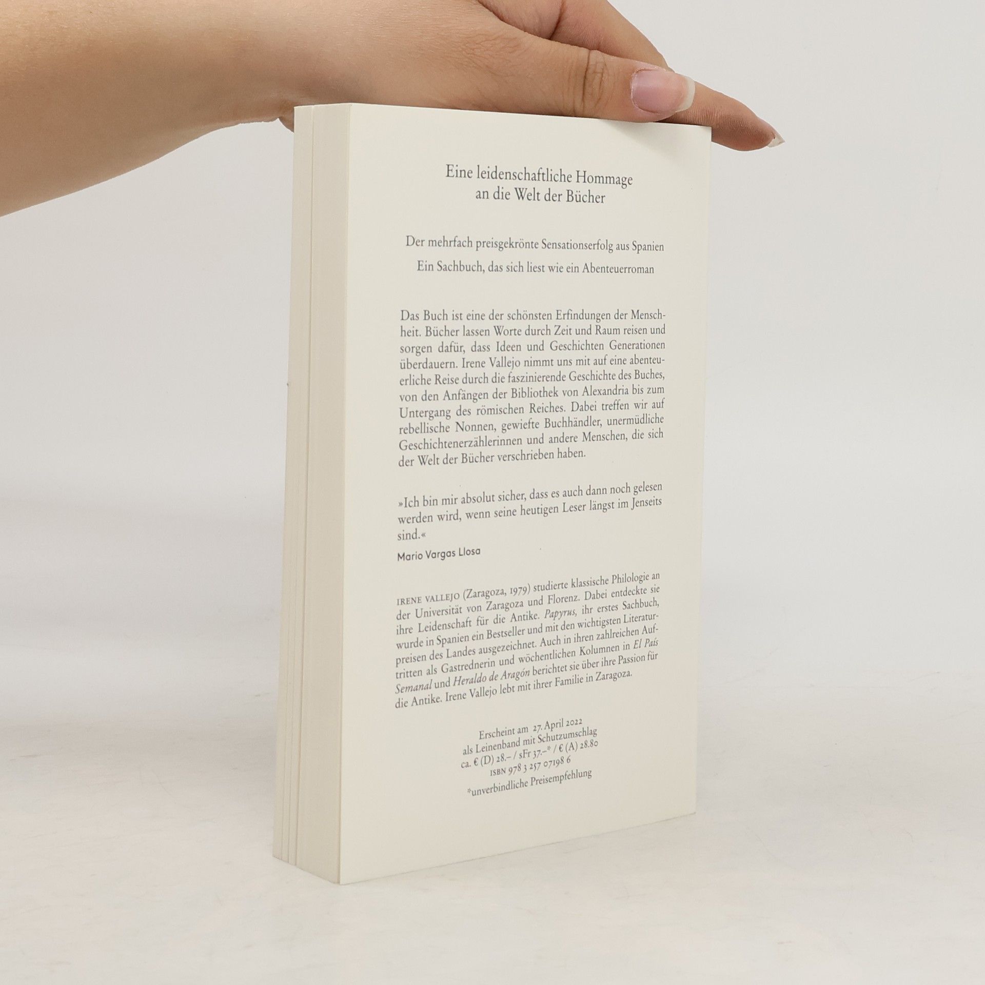 Das Buch ist eine der schönsten Erfindungen der Menschheit. Bücher lassen Worte durch Zeit und Raum reisen und sorgen dafür, dass Ideen und Geschichten Generationen überdauern. Irene Vallejo nimmt uns mit auf eine abenteuerliche Reise durch die faszinierende Geschichte des Buches, von den Anfängen der Bibliothek von Alexandria bis zum Untergang des Römischen Reiches. Dabei treffen wir auf rebellische Nonnen, gewiefte Buchhändler, unermüdliche Geschichtenerzählerinnen und andere Menschen, die sich der Welt der Bücher verschrieben haben.