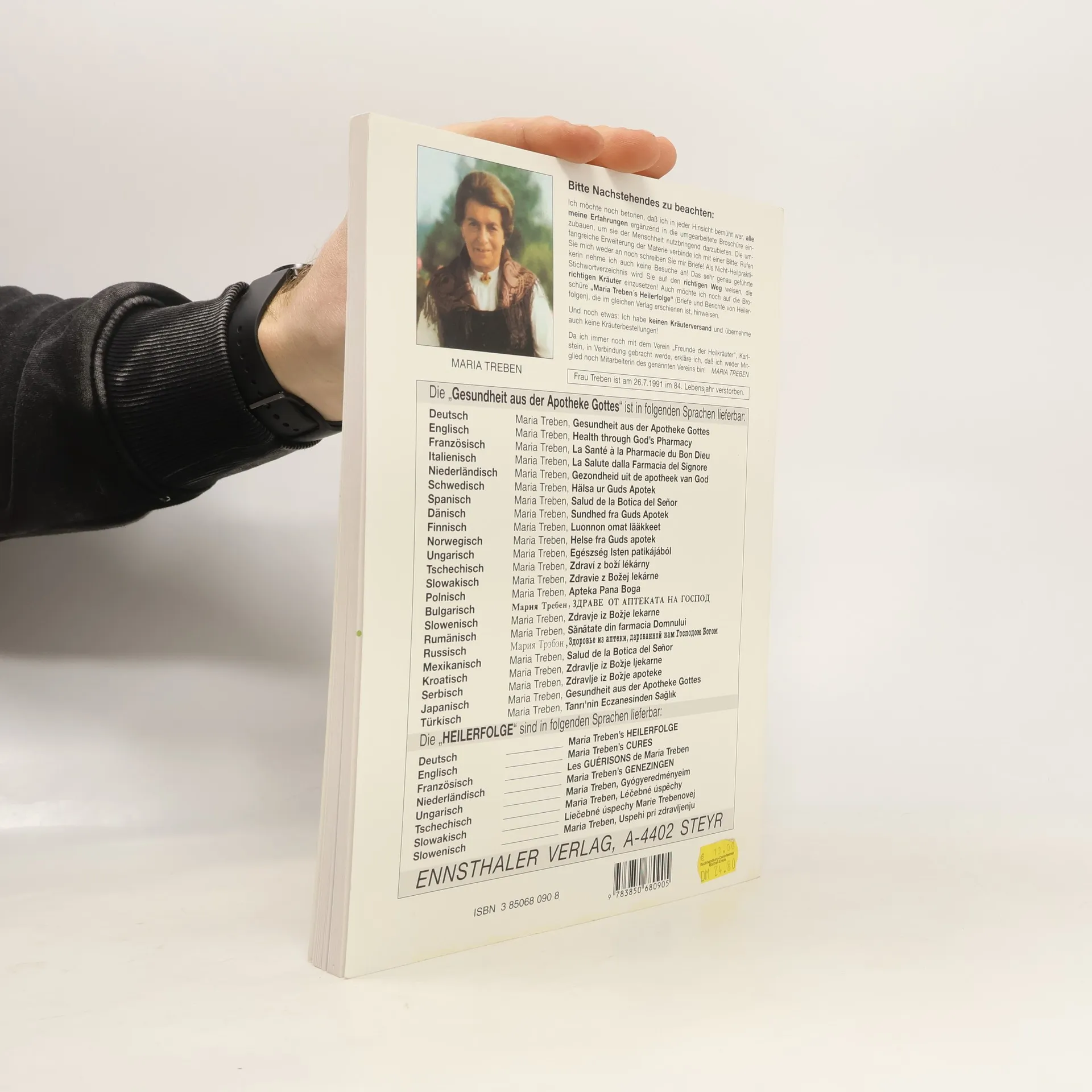 Das Hauptwerk Maria Trebens, die „Gesundheit aus der Apotheke Gottes“, ist 1980 im Ennsthaler Verlag erschienen und wurde bisher in 27 Sprachen übersetzt. Es werden 31 Heilkräuter, deren Heilkraft und Anwendungsmöglichkeiten als Tee, aufzulegender Brei, Bad oder Frischsaft ausführlich beschrieben. Maria Treben hat sich als eine der wichtigsten Pioniere der Kräuterheilkunde ihren Platz in der Geschichte erobert. Viele verehrten sie wie eine Heilige, tatsächlich war sie ein Frau, die sich ein Leben lang mit Heilkräutern beschäftigte und ihre Erfahrungen möglichst vielen Menschen nahebringen wollte. In all den Jahren hat ihre Popularität und die ihrer Werke nie nachgelassen. Ihre Bücher erleben heute durch die fortschreitende Anwendung der Alternativmedizin eine neue und ungebrochene Aktualität.