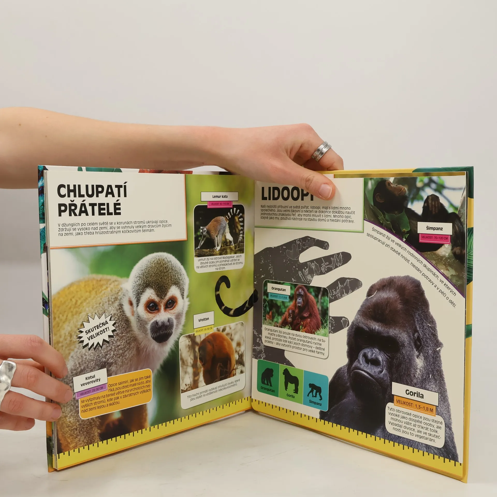 Možná jste ani neměli tušení, že existuje motýl se jménem ptakokřídlec Alexandřin. Stejně tak vás možná překvapí, jak malinký může být kolibřík. A co teprve když zjistíte, jak velký je zub tygra ve srovnání s vaší rukou! V této knize se na velkých rozkládacích stranách dozvíte plno faktů, a navíc si zvířata prohlédnete v životních velikostech. Ale dávejte si pozor! Všude kolem je džungle…