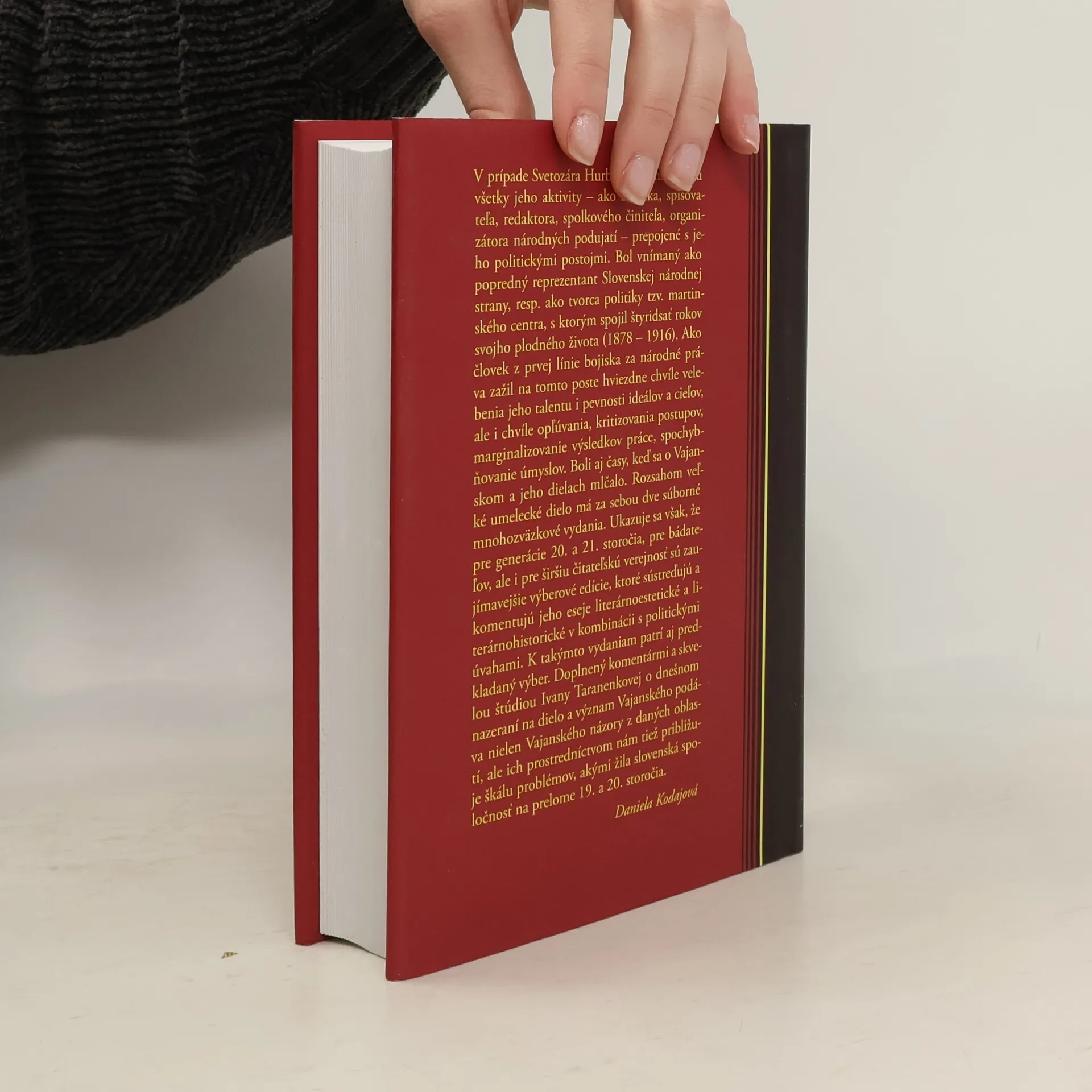 V prípade Svetozára Hurbana Vajanského sú všetky jeho aktivity - ako básnika, spisovateľa, redaktora, spolkového činiteľa, organizátora národných podujatí — prepojené s jeho politickými postojmi. Bol vnímaný ako popredný reprezentant Slovenskej národnej strany, resp. ako tvorca politiky tzv. martinského centra, s ktorým spojil štyridsať rokov svojho plodného života (1878 — 1916). Ako človek z prvej línie bojiska za národné práva zažil na tomto poste hviezdne chvíle vele-benia jeho talentu i pevnosti ideálov a cieľov, ale i chvíle opľúvania, kritizovania postupov, marginalizovanie výsledkov práce, spochybňovanie úmyslov. Boli aj časy, keď sa o Vajan-skom a jeho dielach mlčalo. Rozsahom veľké umelecké dielo má za sebou dve súborné mnohozväzkové vydania. Ukazuje sa však, že pre generácie 20. a 21. storočia, pre bádateľov, ale i pre širšiu čitateľskú verejnosť sú zaujímavejšie výberové edície, ktoré sústreďujú a komentujú jeho eseje literárnoestetické a literárnohistorické v kombinácii s politickými úvahami. K takýmto vydaniam patrí aj predkladaný výber. Doplnený komentármi a skvelou štúdiou Ivany Taranenkovej o dnešnom nazeraní na dielo a význam Vajanského podáva nielen Vajanského názory z daných oblastí, ale ich prostredníctvom nám tiež približuje škálu problémov, akými žila slovenská spoločnosť na prelome 19. a 20. storočia.