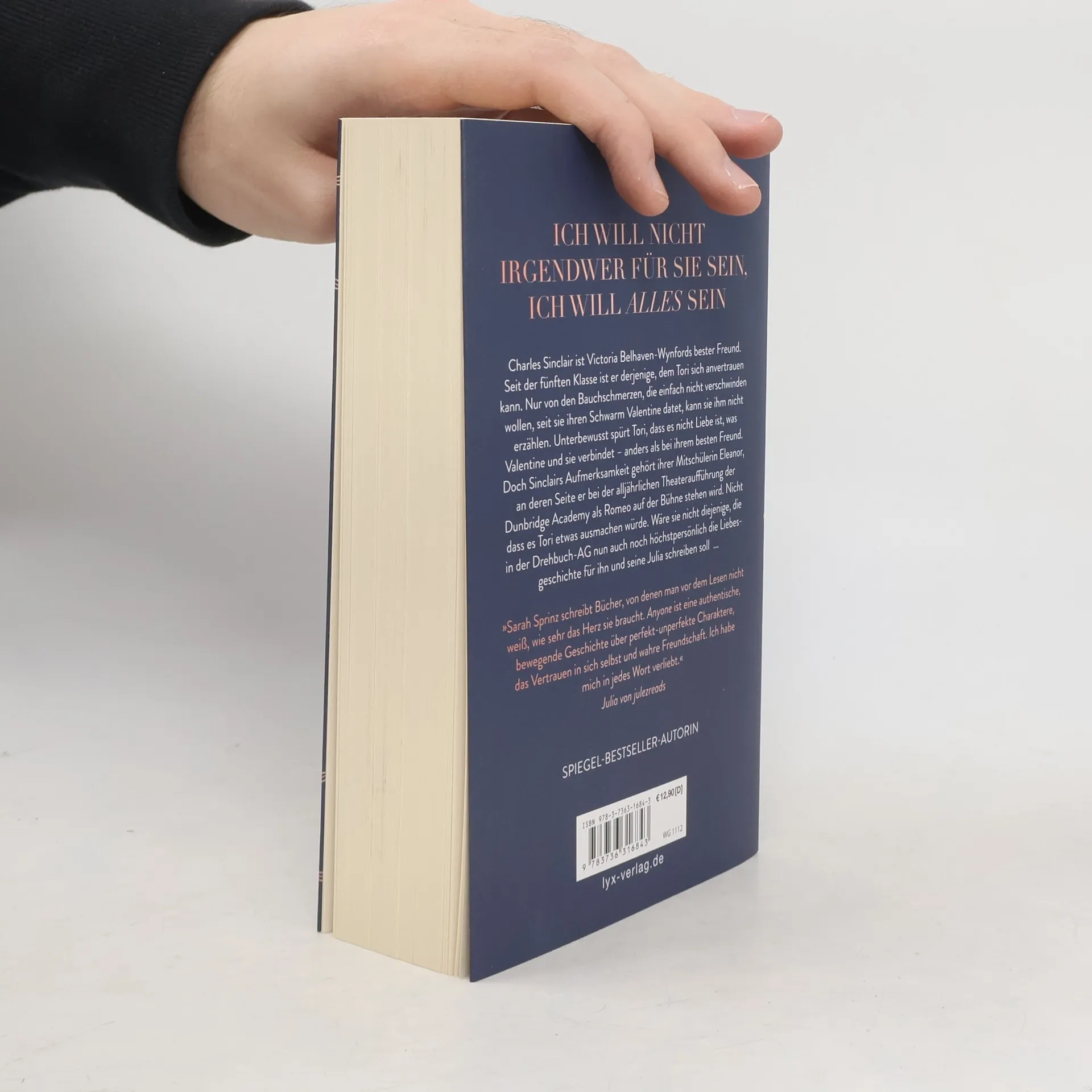 Ich will nicht Irgendwer für sie sein, ich will alles sein Charles Sinclair ist Victoria Belhaven-Wynfords bester Freund. Seit der fünften Klasse ist er derjenige, dem Tori sich anvertrauen kann. Nur von den Bauchschmerzen, die einfach nicht verschwinden wollen, seit sie ihren Schwarm Valentine datet, kann sie ihm nicht erzählen. Unterbewusst spürt Tori, dass es nicht Liebe ist, was Valentine und sie verbindet - anders als bei ihrem besten Freund. Doch Sinclairs Aufmerksamkeit gehört ihrer Mitschülerin Eleanor, an deren Seite er bei der alljährlichen Theateraufführung der Dunbridge Academy als Romeo auf der Bühne stehen wird. Nicht dass es Tori etwas ausmachen würde. Wäre sie nicht diejenige, die in der Drehbuch-AG nun auch noch höchstpersönlich die Liebesgeschichte für ihn und seine Julia schreiben soll ... Band 2 der DUNBRIDGE-ACADEMY-Reihe von SPIEGEL-Bestseller-Autorin Sarah Sprinz