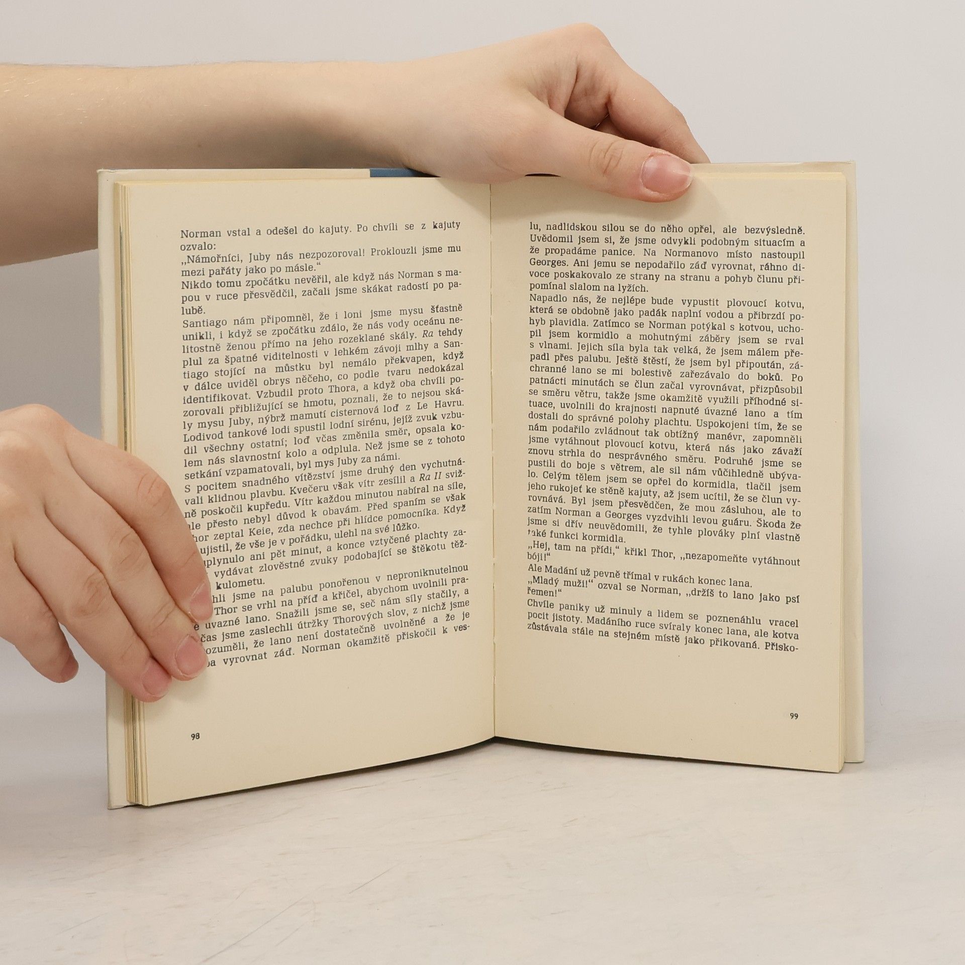 Mladý sovětský lékař Jurij Senkevič, jeden z osmi členů mezinárodní posádky, vedené norským cestovatelem a etnografem Thorem Heyerdahlem, vypráví v poutavě psané knížce o plavbě papyrusového voru z marockého přístavu Sáfí k břehům Jižní Ameriky. Živě líčí přípravy k vyplutí, denní život na lodi i četná dobrodružství, která voru připravil Atlantský oceán. Jádrem knihy nejsou Heyerdahlovy vědecké teorie ani výsledky jednotlivých expedic - ty tvoří jen rámec vyprávění. Na prvním místě jsou lidé, jejich chování a psychologie ve zvláštních podmínkách života na moři, protože Senkevič zůstává i na moři víc psychologem než mořeplavcem. 2. vydání.