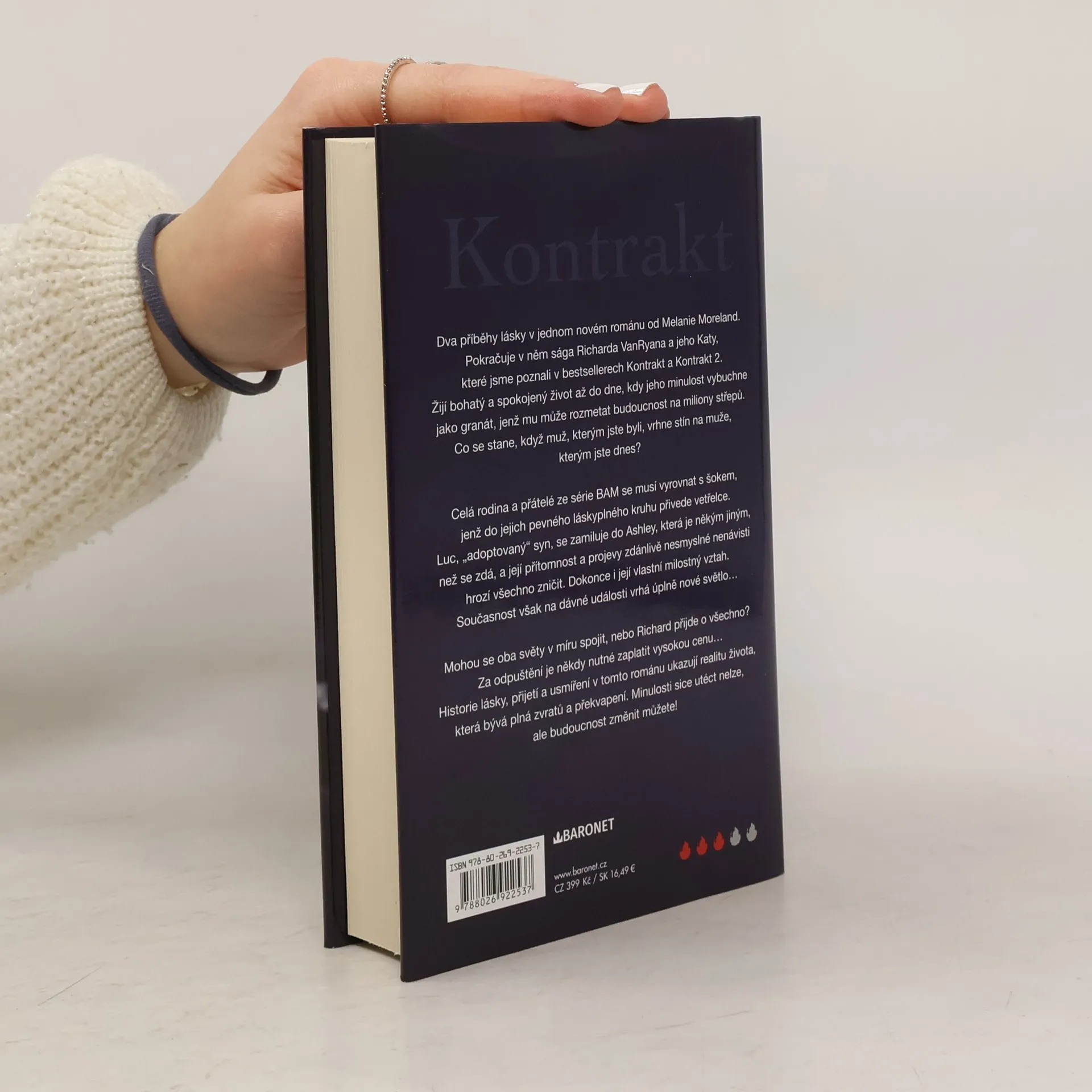 Minulosti sice utéct nelze, ale budoucnost změnit můžete! Dva příběhy lásky v jednom novém románu od Melanie Moreland. Pokračuje v něm sága Richarda VanRyana a jeho Katy, které jsme poznali v bestsellerech Kontrakt a Kontrakt 2. Žijí bohatý a spokojený život až do dne, kdy jeho minulost vybuchne jako granát, jenž mu může rozmetat budoucnost na miliony střepů. Co se stane, když muž, kterým jste byli, vrhne stín na muže, kterým jste dnes? Celá rodina a přátelé ze série BAM se musí vyrovnat s šokem, jenž do jejich pevného láskyplného kruhu přivede vetřelce. Luc, „adoptovaný“ syn, se zamiluje do Ashley, která je někým jiným, než se zdá, a její přítomnost a projevy zdánlivě nesmyslné nenávisti hrozí všechno zničit. Dokonce i její vlastní milostný vztah. Současnost však na dávné události vrhá úplně nové světlo… Mohou se oba světy v míru spojit, nebo Richard přijde o všechno? Za odpuštění je někdy nutné zaplatit vysokou cenu… Historie lásky, přijetí a usmíření v tomto románu ukazují realitu života, která bývá plná zvratů a překvapení. Minulosti sice utéct nelze, ale budoucnost změnit můžete!