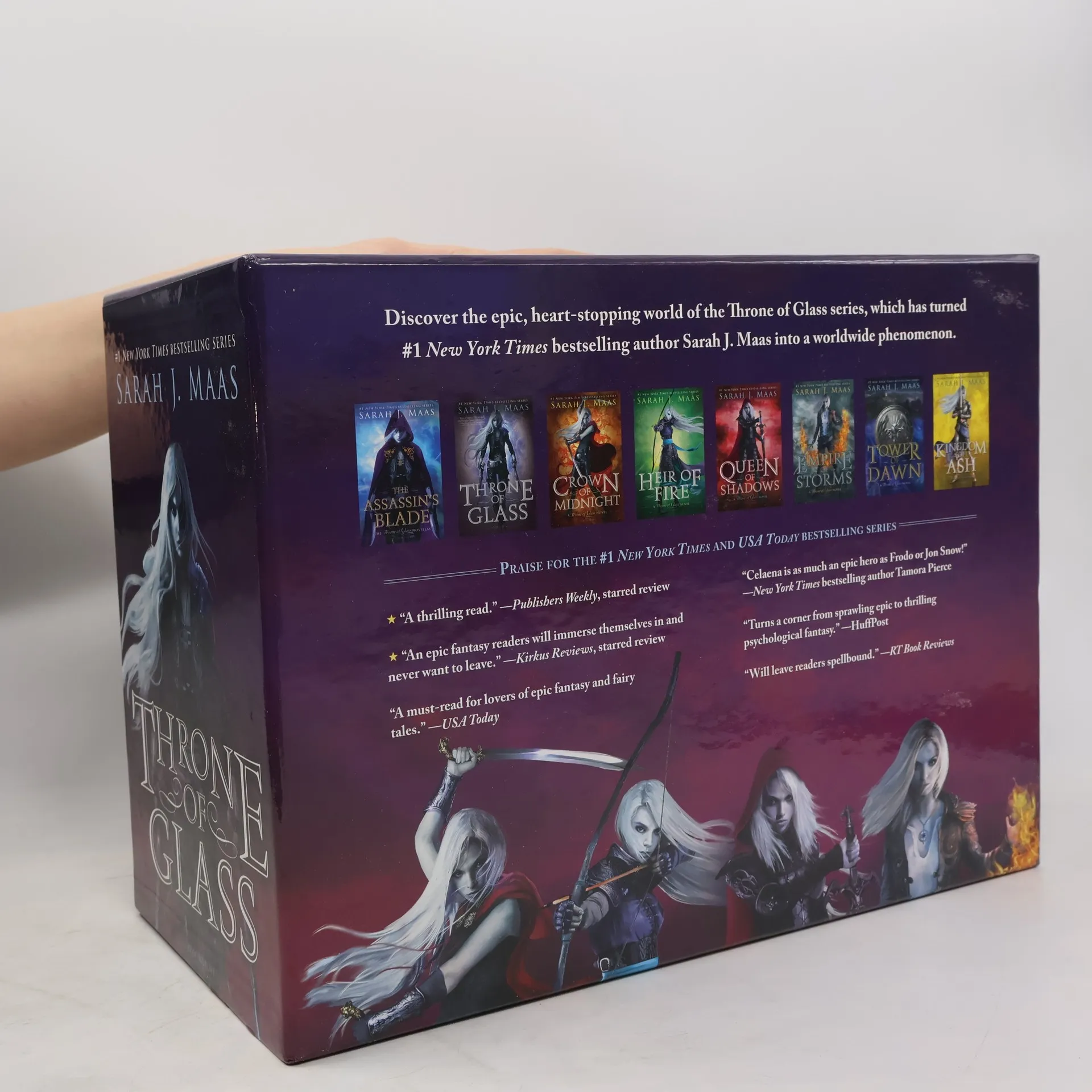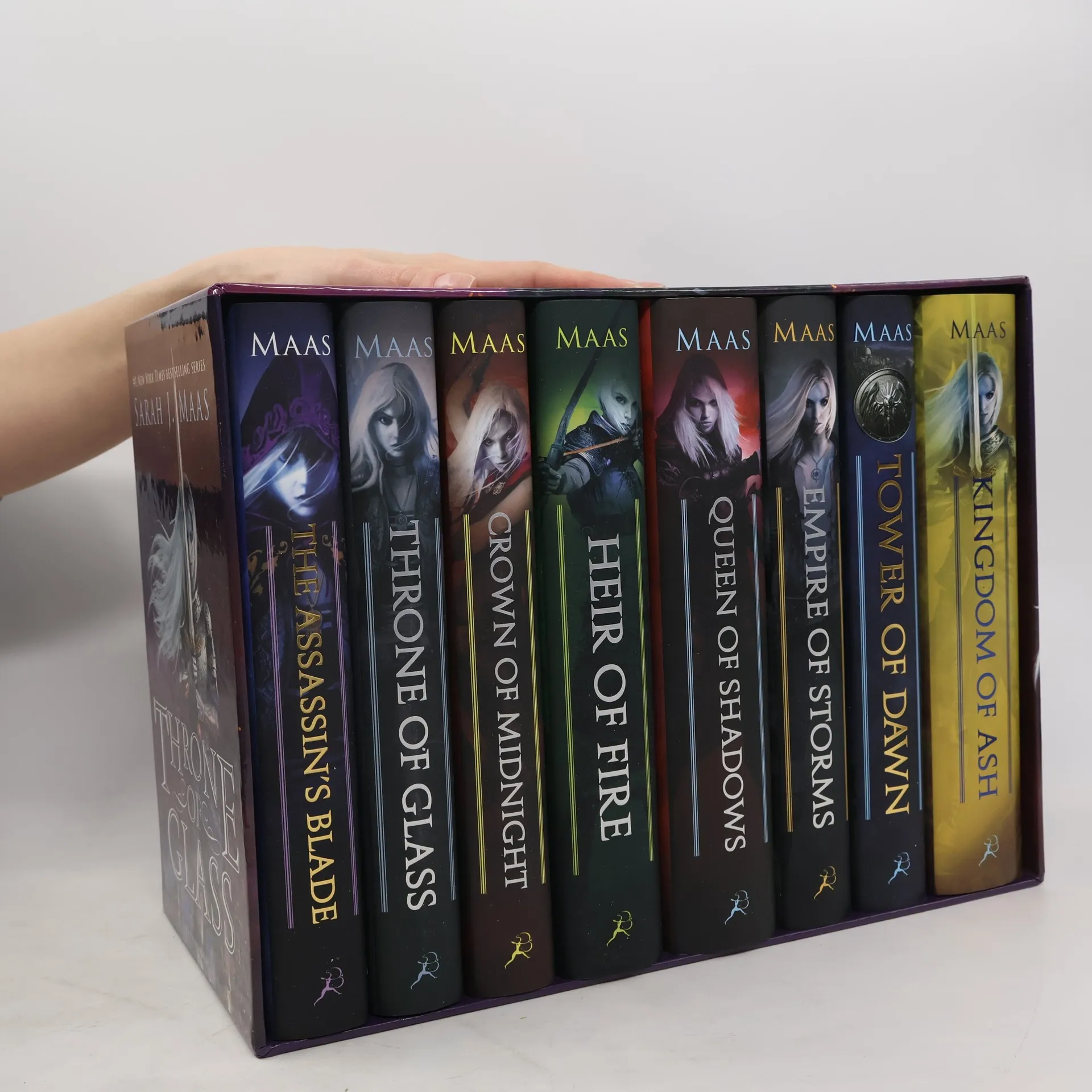 Discover the worldwide phenomenon of the Throne of Glass series in this gorgeous 8-book hardcover box set, complete with an exclusive poster. When magic has gone from the world, and a vicious king rules from his throne of glass, an assassin comes to the castle. She does not come to kill, but to win her freedom. If she can defeat twenty-three killers, thieves, and warriors in a competition to find the greatest assassin in the land, she will become the king's champion and earn her freedom. Her name is Celaena Sardothien – beautiful, deadly, and destined for greatness. But as dark forces gather on the horizon-forces which threaten to destroy her entire world-Celaena must fight to protect everything she holds dear, thrusting her into the epic, heart-stopping fantasy series that has turned #1 New York Times bestselling author Sarah J. Maas into a worldwide phenomenon. Fans new and old will dive into this special box set that contains a 4-color poster and hardcover editions of the entire series: The Assassin's Blade, Throne of Glass, Crown of Midnight, Heir of Fire, Queen of Shadows, Empire of Storms, Tower of Dawn, and the thrilling finale, Kingdom of Ash.