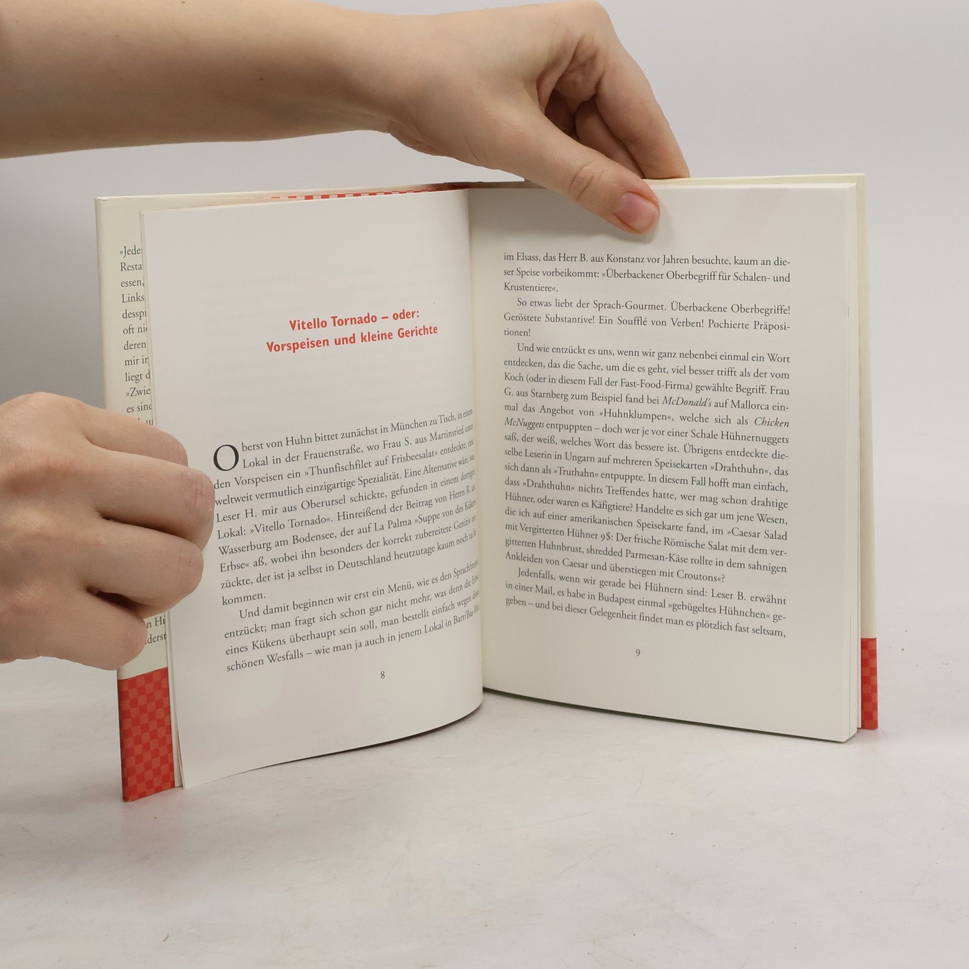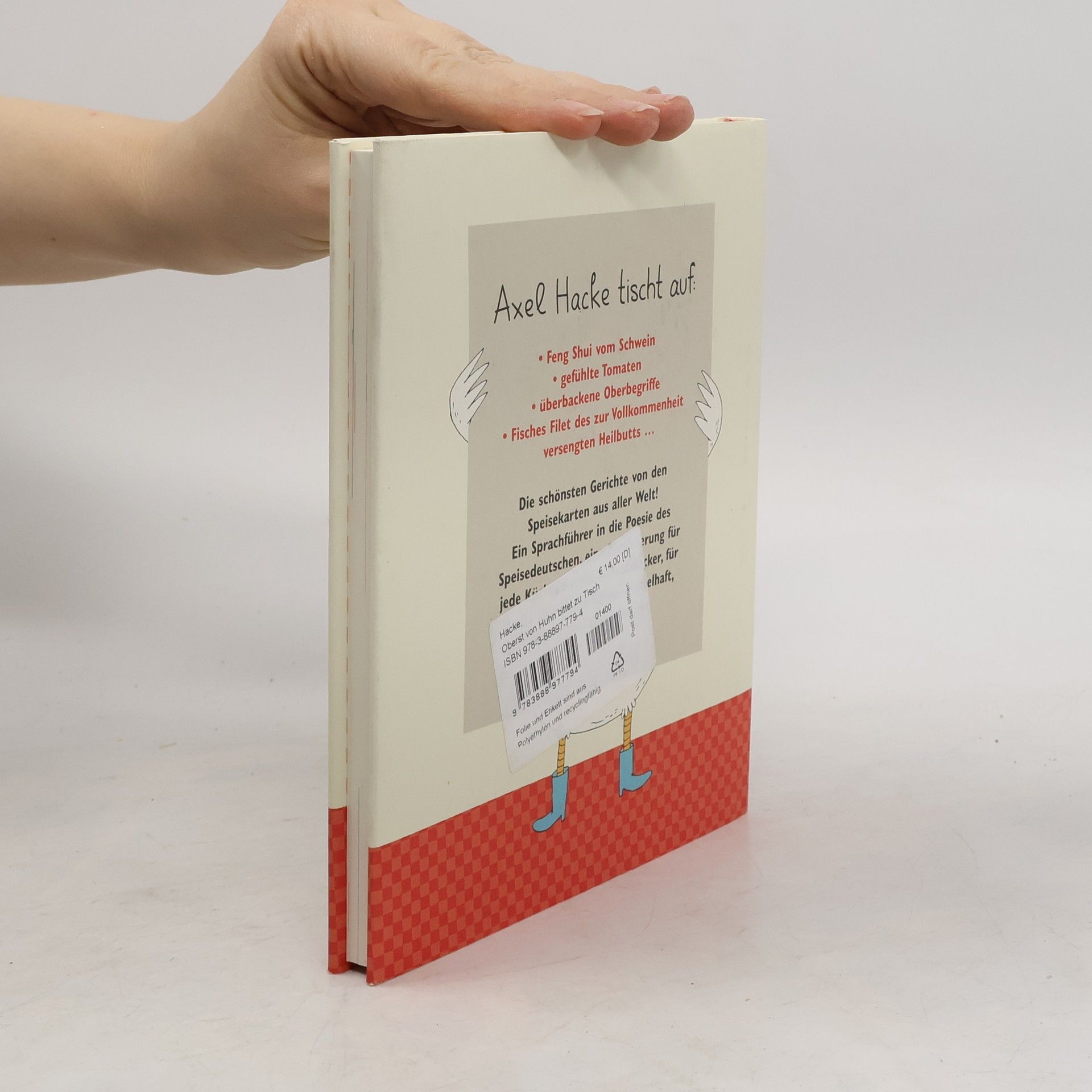 Was hat man sich unter »Oberst von Huhn breitet sich drastisch in einer Weißweincreme Aus, mit Penne Nudeln Federn und Parmesankäse« vorzustellen? Und was unter »Feng Shui vom Schwein«? Axel Hacke hat sich auf Recherche begeben und die schönsten Gerichte auf den Speisekarten aus aller Welt zusammengestellt: ein Sprachführer in die Poesie des Speisedeutschen und gleichzeitig eine Bereicherung für jede Küche, für alle Feinschmecker, für große und kleine Köche – rätselhaft, witzig und sehr köstlich. Wenn Oberst von Huhn zu Tisch bittet, kann keiner widerstehen. Eine Vorspeise aus dem Elsass: Überbackener Oberbegriff für Schalen- und Krustentiere. Ein Hauptgericht aus Russland: Die Kollektion der Scheibchen des Roastbeefs und des Kalbfleisches Vom Gelee aus der roten Schuld. Und das Dessert aus Italien: Sahne Chorhemd mit Fruchten im Wald. So etwas liebt der Sprach-Gourmet. Überbackene Oberbegriffe! Geröstete Substantive! Ein Soufflé von Verben! Pochierte Präpositionen! Ach, herrje, das Leben ist so schön.