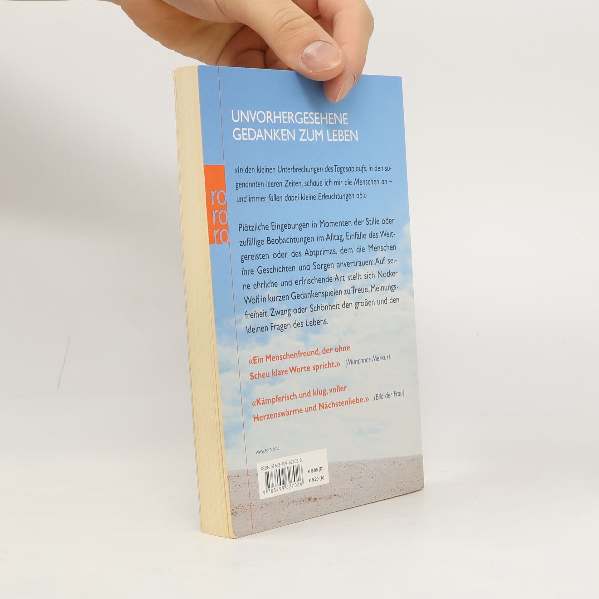 Unvorhergesehene Gedanken zum Leben «In den kleinen Unterbrechungen des Tagesablaufs, in den sogenannten leeren Zeiten, schaue ich mir die Menschen an – und immer fallen dabei kleine Erleuchtungen ab.» Plötzliche Eingebungen in Momenten der Stille oder zufällige Beobachtungen im Alltag, Einfälle des Weitgereisten oder des Abtprimas, dem die Menschen ihre Geschichten und Sorgen anvertrauen: Auf seine ehrliche und erfrischende Art stellt sich Notker Wolf in kurzen Gedankenspielen zu Treue, Meinungsfreiheit, Zwang oder Schönheit den großen und den kleinen Fragen des Lebens. «Ein Menschenfreund, der ohne Scheu klare Worte spricht.» (Münchner Merkur) «Kämpferisch und klug, voller Herzenswärme und Nächstenliebe.» (Bild der Frau)