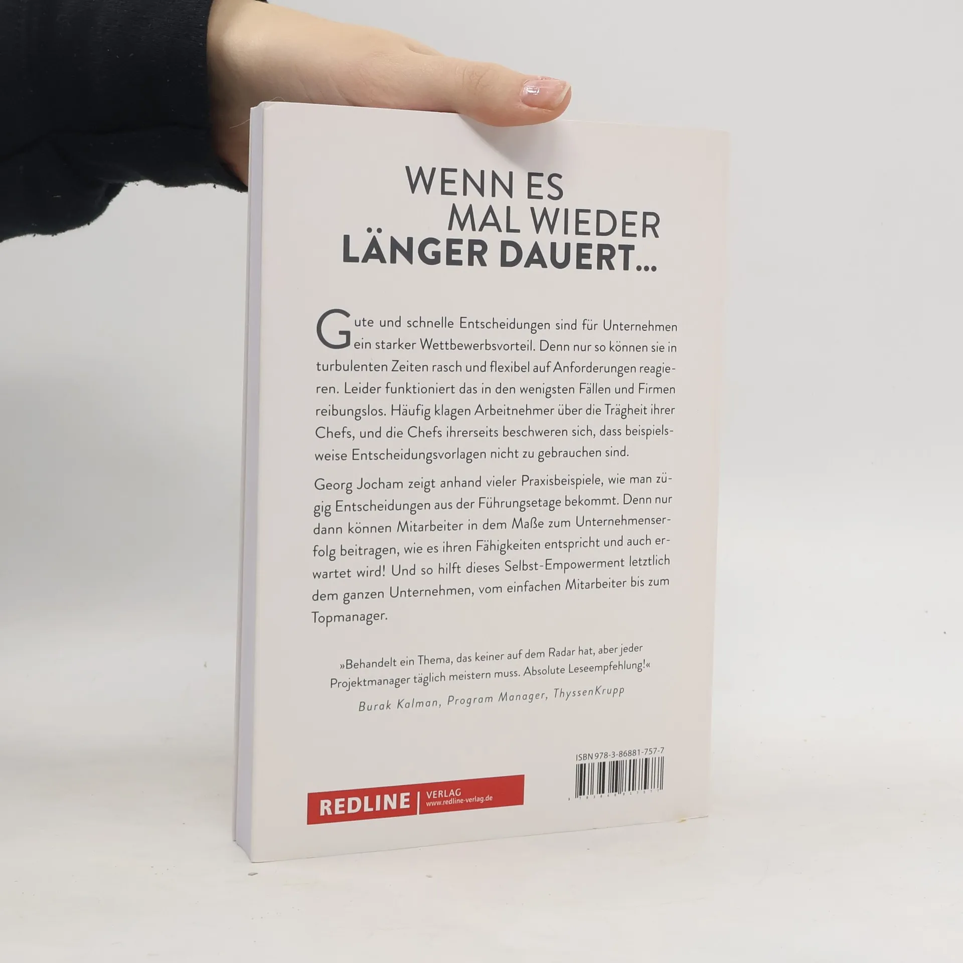 Wenn es mal wieder länger dauert... Gute und schnelle Entscheidungen sind für Unternehmen ein starker Wettbewerbsvorteil. Denn nur so können sie in turbulenten Zeiten rasch und flexibel auf Anforderungen reagieren. Leider funktioniert das in den wenigsten Fällen und Firmen reibungslos. Häufig klagen Arbeitnehmer über die Trägheit ihrer Chefs, und die Chefs ihrerseits beschweren sich, dass beispielsweise Entscheidungsvorlagen nicht zu gebrauchen sind. Georg Jocham zeigt anhand vieler Praxisbeispiele, wie man zügig Entscheidungen aus der Führungsetage bekommt. Denn nur dann können Mitarbeiter in dem Maße zum Unternehmenserfolg beitragen, wie es ihren Fähigkeiten entspricht und auch erwartet wird! Und so hilft dieses Selbst-Empowerment letztlich dem ganzen Unternehmen, vom einfachen Mitarbeiter bis zum Topmanager.