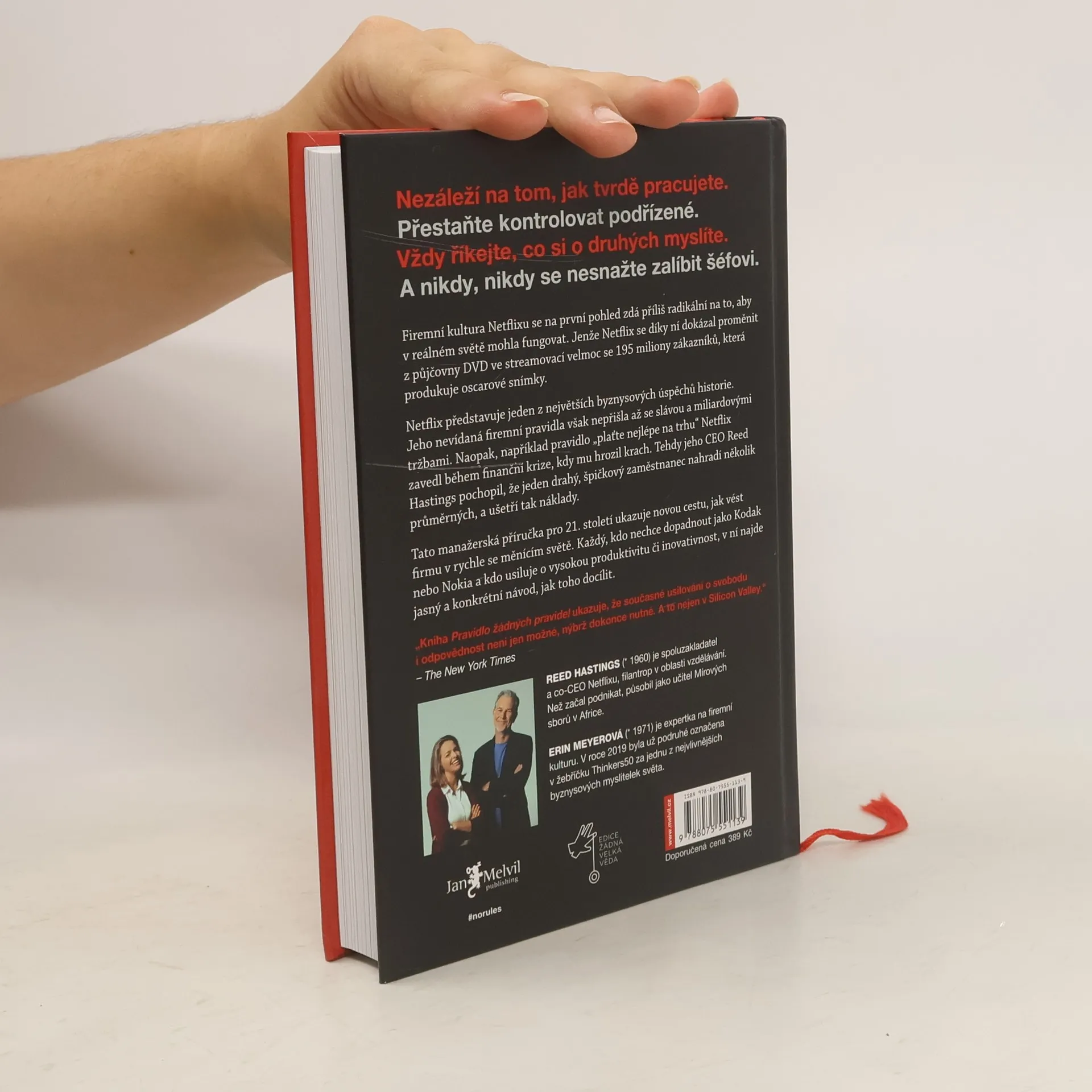 „Než přišel Netflix, nikdy předtím neexistovala společnost jako Netflix.“ Tato revoluční firma generuje miliardové roční příjmy a oslovuje stovky milionů lidí ve více než 190 zemích. Od svého vzniku v roce 1998, kdy začínala jako služba půjčování DVD, prošla Netflix mnoha změnami a prokázala velkou flexibilitu. Klíčovým faktorem úspěchu je kultura nastavená Reedem Hastingsem, která může na první pohled působit radikálně. Díky této kultuře zaměřené na svobodu a odpovědnost se Netflix dostal na vrchol. V tomto světovém bestselleru spoluzakladatel Hastings odhaluje vnitřní fungování Netflixu: jak nastavuje nové standardy, váží si lidí více než procesů, upřednostňuje inovace před efektivitou a zaměstnance nekontroluje. Neexistují žádná pravidla pro dovolenou ani výdaje. Zaměstnanci se nesnaží potěšit své nadřízené, ale poskytují upřímnou zpětnou vazbu. Tyto neobvyklé metody vedly k bezkonkurenční rychlosti inovací a Netflix se stal jednou z nejoblíbenějších značek na světě. Tato kniha je výbornou a čtivou byznysovou příručkou, která dramaticky proplétá historii Netflixu. Je určena pro ty, kdo vedou týmy, firmy, budují startupy nebo pracují v organizacích, které chtějí zlepšovat.