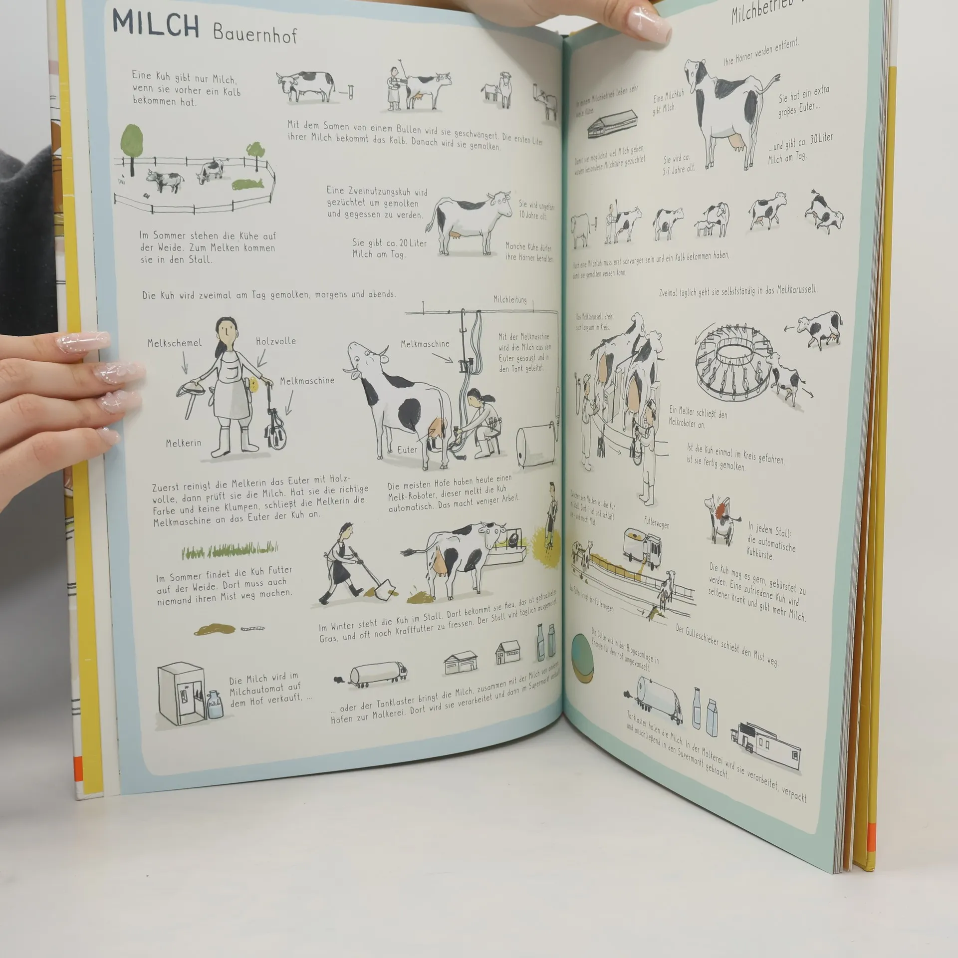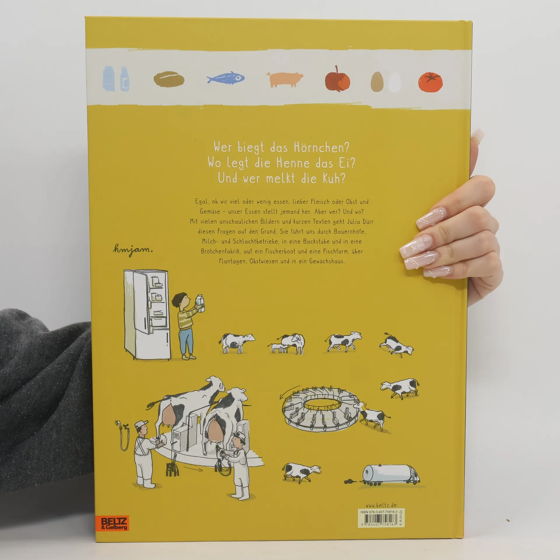 Woher kommen eigentlich die Lebensmittel, die auf unserem Tisch landen? Dieses Sachbilderbuch zeigt die verschiedenen Produktionsabläufe in kleinen und großen Betrieben: den Weg der Milch auf einem Bauernhof und in einem Milchbetrieb oder wie das Brot in der Backstube und wie es in der Backfabrik entsteht, Fischfang und Fischzucht. Wie und wo Tomaten oder Äpfel wachsen, was passiert, bevor die Wurst in die Pelle kommt - und was das alles mit dem Klima zu tun hat, erklären die detailreichen, großformatigen Bilder und die leicht verständlichen Texte.