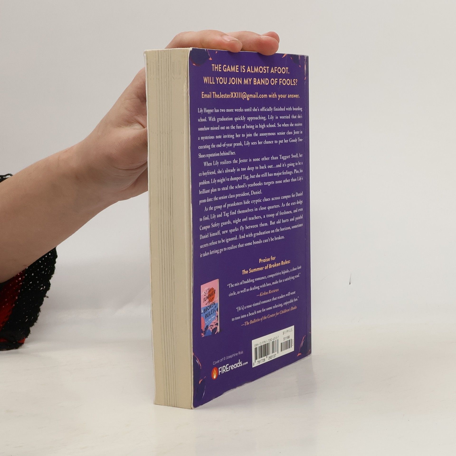 Lily Hopper has two more weeks until she's officially finished with boarding school. With graduation quickly approaching Lily is worried that she's somehow missed out on the fun of being in high school. So, when she receives a mysterious note inviting her to join the anonymous senior class Jester in executing the end-of-year prank, Lily sees her chance to put her goody-two-shoes reputation behind her. When Lily realizes the Jester is none other than Taggart Swell, her ex- boyfriend, she's already in too deep to back out. Lily might've dumped Tag, but she still has major feelings. Plus, his brilliant plan to steal the school's yearbooks, targets none other than Lily's prom date: the Senior Class President, Daniel. As the group of pranksters hide cryptic clues across campus for Daniel to find, Lily and Tag find themselves in close quarters. As the exes dodge Campus Safety guards, night owl teachers, a troop of freshmen, and even Daniel himself, new sparks fly. But old hurts and painful secrets refuse to be ignored. And with graduation on the horizon, Lily can only hope that breaking the rules will help mend her heart.