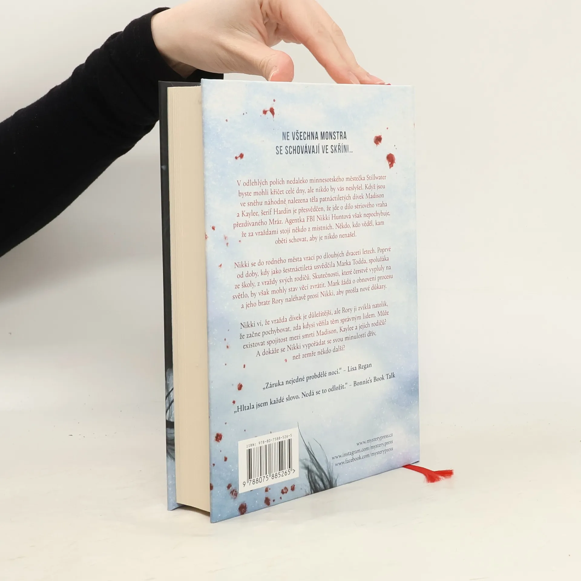 NE VŠECHNA MONSTRA SE SCHOVÁVAJÍ VE SKŘÍNI… V odlehlých polích nedaleko minnesotského městečka Stillwater byste mohli křičet celé dny, ale nikdo by vás neslyšel. Když jsou ve sněhu náhodně nalezena těla patnáctiletých dívek Madison a Kaylee, šerif Hardin je přesvědčen, že jde o dílo sériového vraha přezdívaného Mráz. Agentka FBI Nikki Huntová však nepochybuje, že za vraždami stojí někdo z místních. Někdo, kdo věděl, kam oběti schovat, aby je nikdo nenašel. Nikki se do rodného města vrací po dlouhých dvaceti letech. Poprvé od doby, kdy jako šestnáctiletá usvědčila Marka Todda, spolužáka ze školy, z vraždy svých rodičů. Skutečnosti, které čerstvě vypluly na světlo, by však mohly stav věcí zvrátit. Mark žádá o obnovení procesu a jeho bratr Rory naléhavě prosí Nikki, aby prošla nové důkazy. Nikki ví, že vražda dívek je důležitější, ale Rory ji zviklá natolik, že začne pochybovat, zda kdysi věřila těm správným lidem. Může existovat spojitost mezi smrtí Madison, Kaylee a jejích rodičů? A dokáže se Nikki vypořádat se svou minulostí dřív, než zemře někdo další? _____ „Záruka nejedné probdělé noci.“ – Lisa Regan „Hltala jsem každé slovo. Nedá se to odložit.“ – Bonnie’s Book Talk