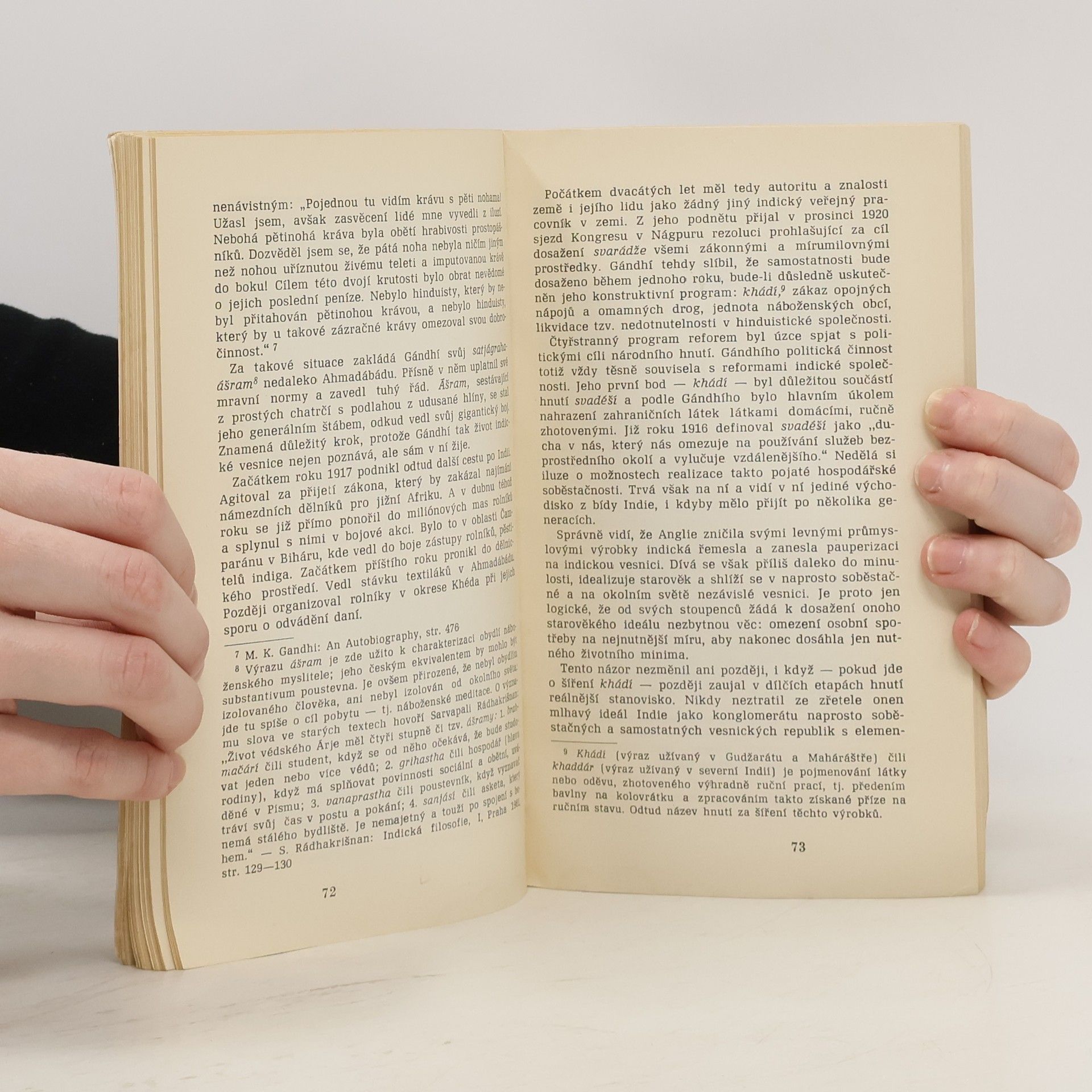V publikaci se proplétají dvě pásma. První vypráví o životě a působení M. Gándhího, myslitele a bojovníka za svobou Indie. Jeho učení, gándhismus, se stalo v několika zemích, např. v Ghaně, formou národně osvobozenecého boje. V druhém pásmu poznaváme metody politického a hospodářského útisku, jež uvalila Velká Británie na Indii. Dodatky jednak otiskují úryvky z projevů Gándhího, jednak soudy o něm.