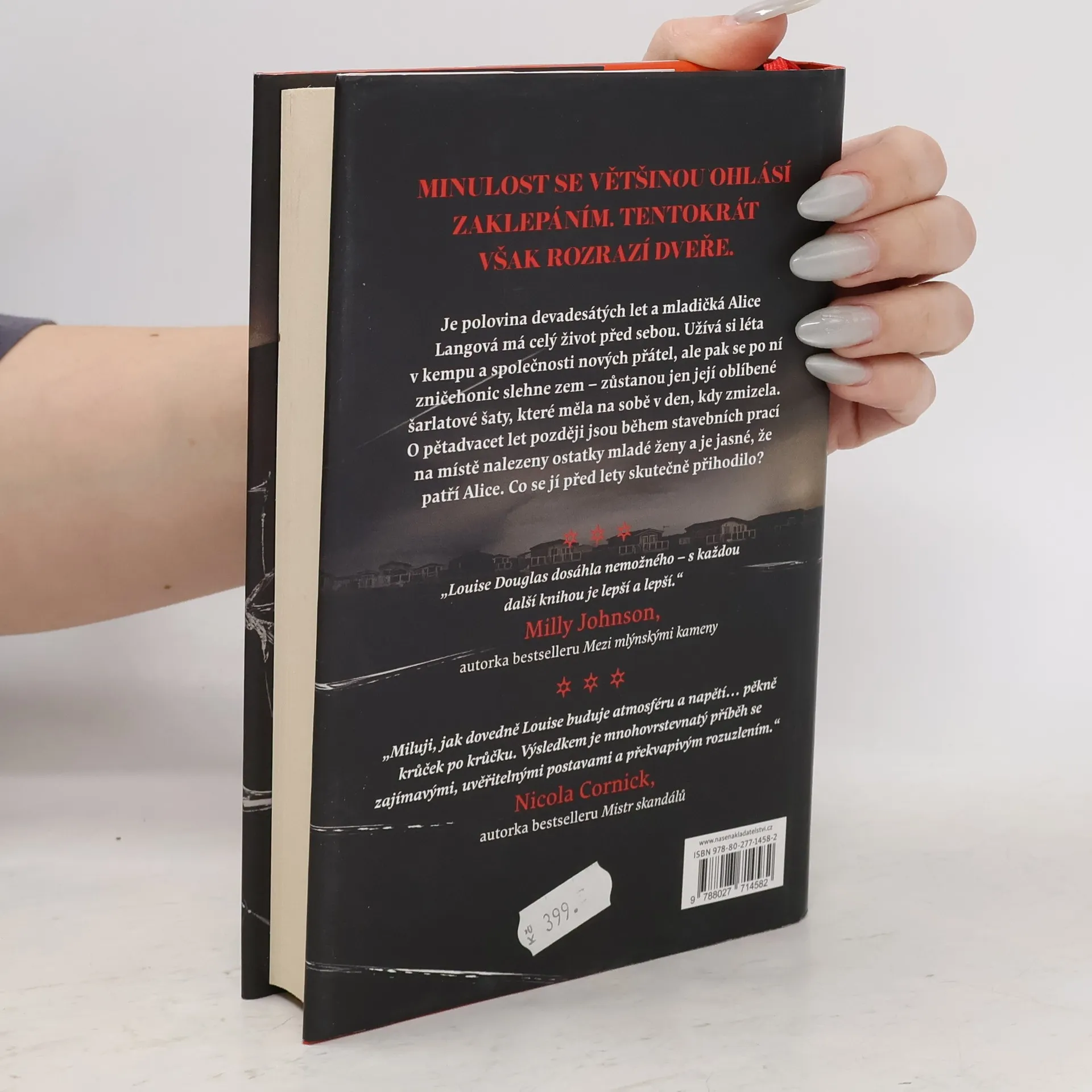 Nekonečně dlouhého parného léta roku 1995 si dvaadvacetiletá Alice Langová pronajme karavan na periferii prázdninového kempu v městečku Severn Sands. Spřátelí se s Marnie, stydlivou křehkou dívenkou, jejíž otec pracuje v kempu jako správce, a s Willem, jehož matka tu vede bar. Jednoho večera ale Alice ze svého karavanu zmizí. Nikde po ní není ani stopy, až na její šarlatové šaty, které se najdou vyvrženy na břehu moře. O čtvrt století později se prázdninový kemp prodá na stavbu nových domů a stavaři na pozemku vykopou lidské kosti. Nepochybně patří Alice. Životy Willa i Marnie jsou událostmi onoho léta nesmazatelně poznamenány. A nyní, když se Alice konečně našla, se oba musí popasovat s tajemstvími minulosti, vyřčenými lžemi a nesnesitelně těžkým břemenem viny. Jaký osud to Alice potkal? Kdo ji zabil? A proč? Louise Douglas, autorka mezinárodních bestsellerů, se vrací s dalším podmanivým románem, ze kterého čtenáři bude běhat mráz po zádech.