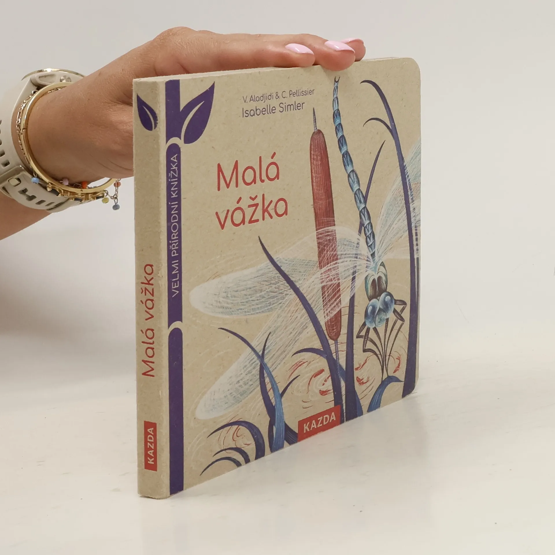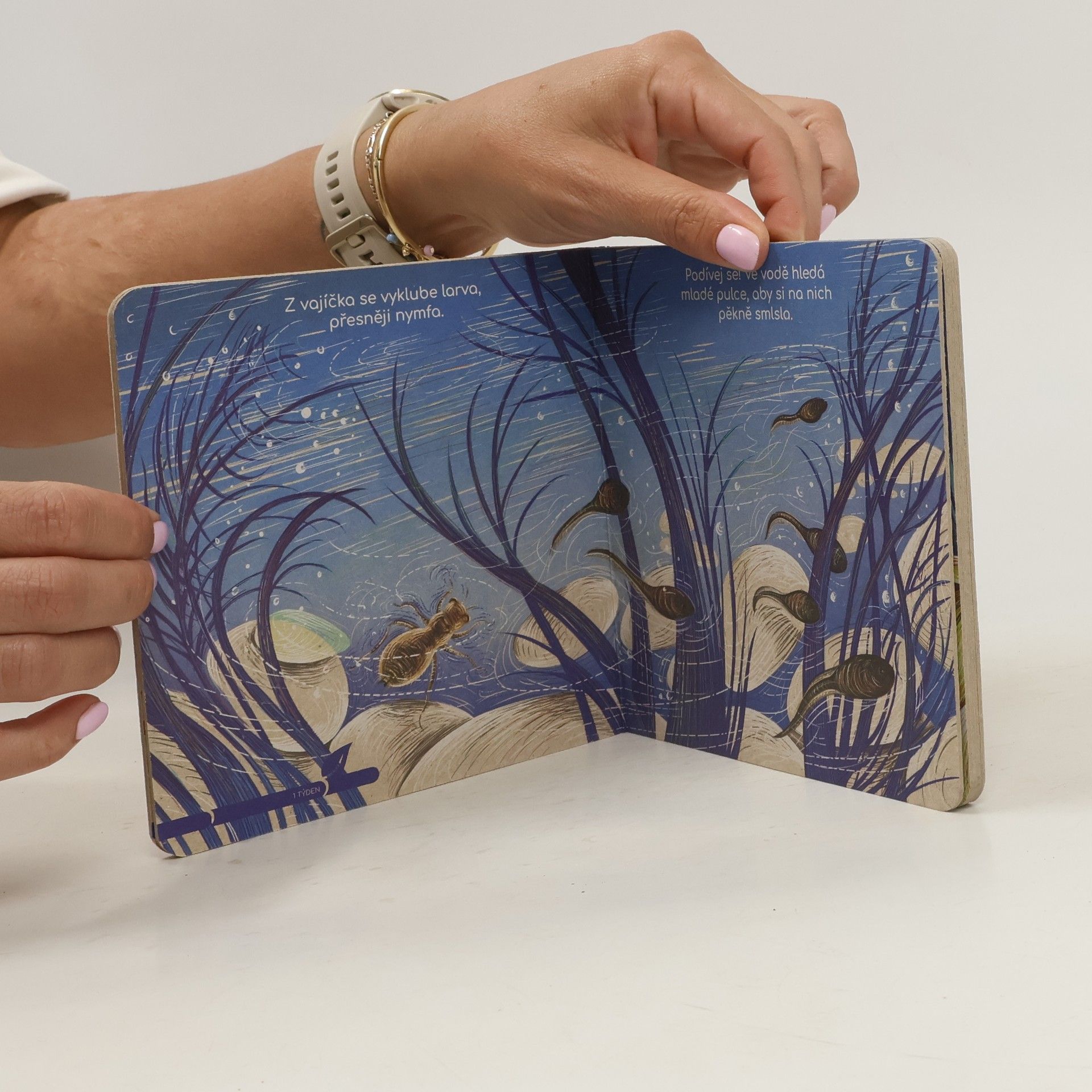 Knížka z recyklovaného neběleného kartonu ukazuje, jak se z nakladených vajíček stane krásná modrá vážka.