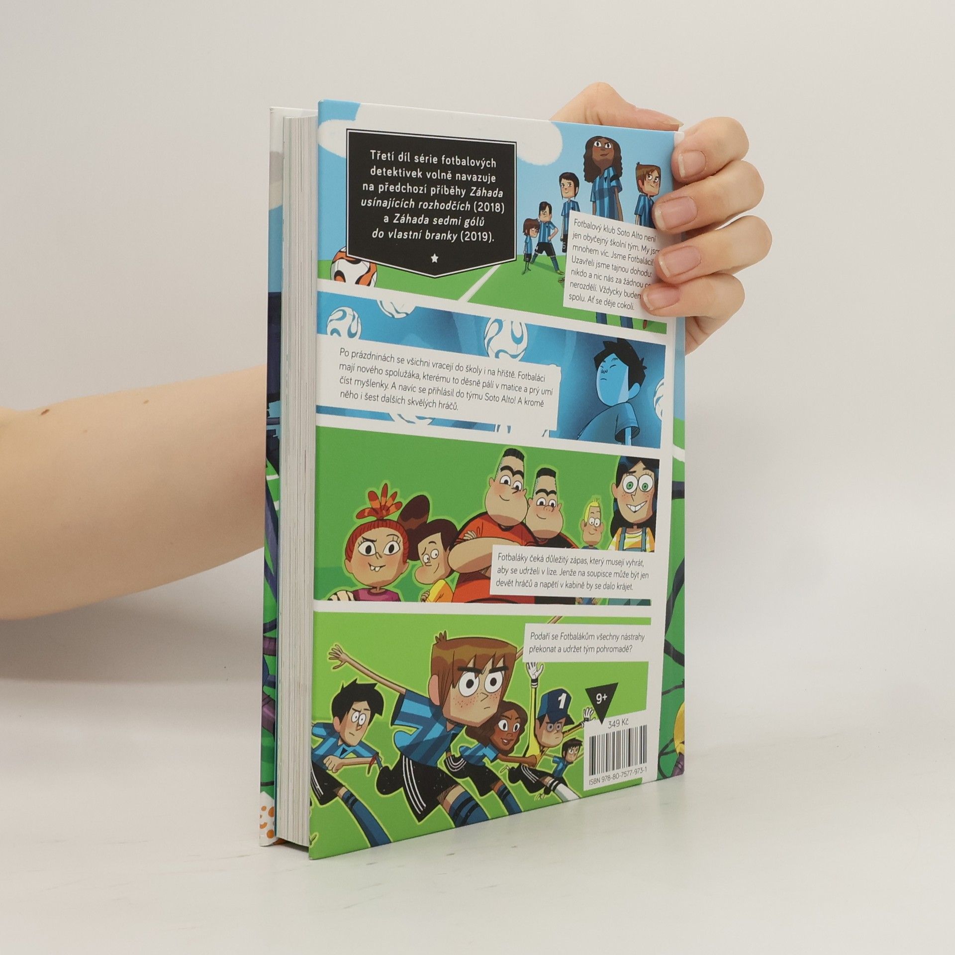Pokračování detektivní série z fotbalového prostředí. Po prázdninách se všichni vracejí do školy i na hřiště. Fotbaláci mají nového spolužáka, kterému to děsně pálí v matice a prý umí číst myšlenky. A navíc se přihlásil do týmu Soto Alto! A kromě něho i šest dalších, vážně skvělých hráčů. Fotbaláky čeká důležitý zápas, který musejí vyhrát, aby se udrželi v lize. Jenže na soupisce může být jen devět hráčů a napětí v kabině by se dalo krájet. Nakladatelská anotace. Kráceno.