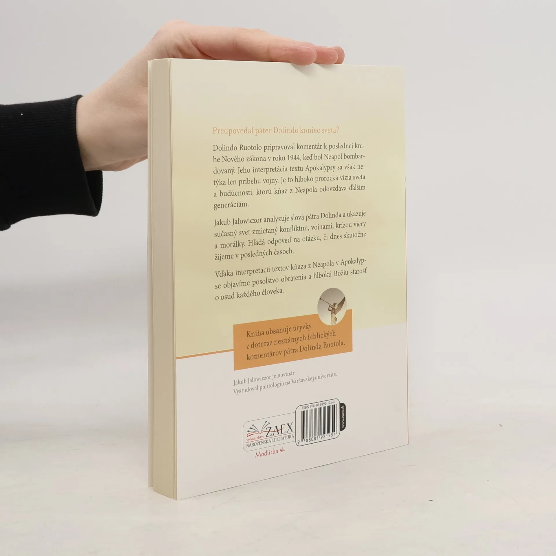Predpovedal páter Dolindo koniec sveta? Dolindo Ruotolo pripravoval komentár k poslednej knihe Nového zákona v roku 1944, keď bol Neapol bombardovaný. Jeho interpretácia textu Apokalypsy sa však netýka len príbehu vojny. Je to hlboko prorocká vízia sveta a budúcnosti, ktorú kňaz z Neapola odovzdáva ďalším generáciám. Kniha obsahuje úryvky z doteraz neznámych biblických komentárov pátra Dolinda Ruotola. Jakub Jałowiczor analyzuje slová pátra Dolinda a ukazuje súčasný svet zmietaný konfliktmi, vojnami, krízou viery a morálky. Hľadá odpoveď na otázku, či dnes skutočne žijeme v posledných časoch. Vďaka interpretácii textov kňaza z Neapola v Apokalypse objavíme posolstvo obrátenia a hlbokú Božiu starosť o osud každého človeka.