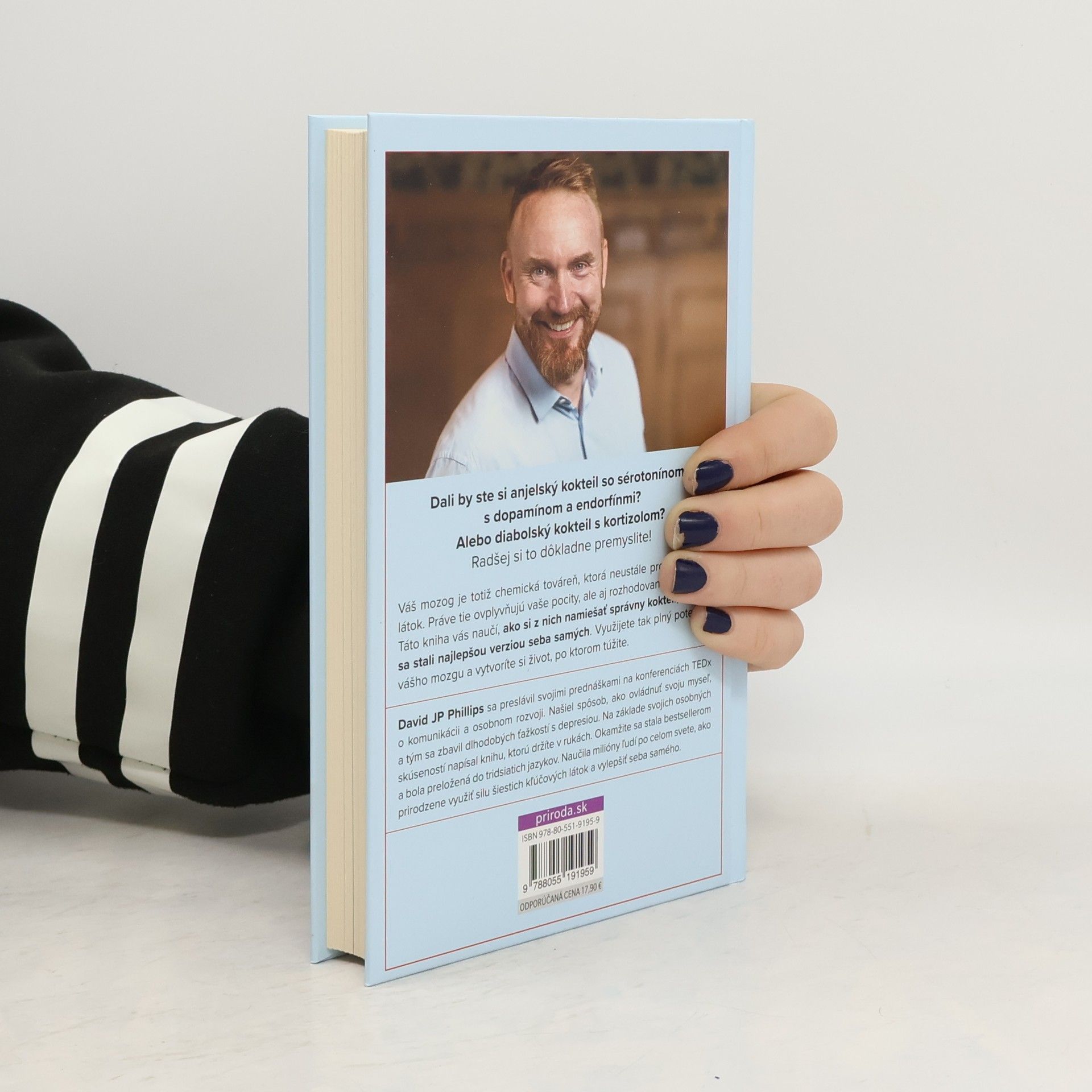 Dali by ste si anjelský kokteil so sérotonínom, s dopamínom a endorfínmi? Alebo diabolský kokteil s kortizolom? Radšej si to dôkladne premyslite! Váš mozog je totiž chemická továreň, ktorá neustále produkuje šesť látok. Práve tie ovplyvňujú vaše pocity, ale aj rozhodovanie a konanie. Táto kniha vás naučí, ako si z nich namiešať správny kokteil, aby ste sa stali najlepšou verziou seba samých. Využijete tak plný potenciál vášho mozgu a vytvoríte si život, po ktorom túžite. David JP Phillips sa preslávil svojimi prednáškami na konferenciách TEDx o komunikácii a osobnom rozvoji. Našiel spôsob, ako ovládnuť svoju myseľ, a tým sa zbavil dlhodobých ťažkostí s depresiou. Na základe svojich osobných skúseností napísal túto knihu, ktorá sa okamžite stala bestsellerom a bola preložená do tridsiatich jazykov. Naučila milióny ľudí po celom svete, ako prirodzene využiť silu šiestich kľúčových látok a vylepšiť seba samého.