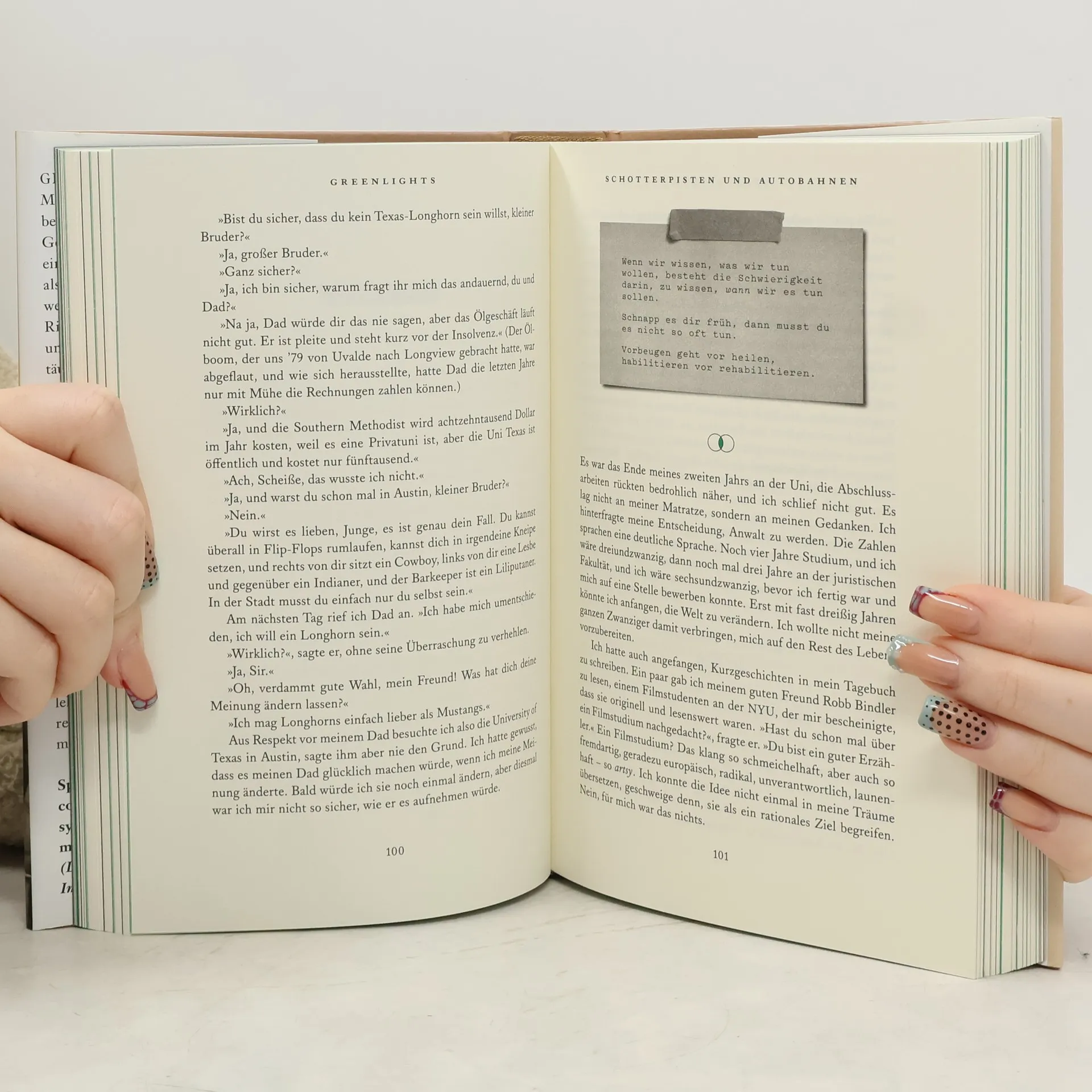 Spannende Autobiographie und zugleich Leitfaden fürs Leben – vom sympathischen Hollywood-Darsteller mit den vielen Gesichtern („Dallas Buyers Club“, „True Detective“, „Interstellar“). „Greenlights“ – so nennt Matthew McConaughey seine rauen, bewegenden, temperamentvollen Geschichten. In der Tat, er fährt auf einer „grünen Welle“ durchs Leben, als habe er immer „freie Fahrt“, auch wenn die nicht immer in die richtige Richtung geht. Er erzählt vom Auf und Ab, von Erwartungen und Enttäuschungen und einem entspannten Umgang damit – und liefert damit zugleich eine kluge, warmherzige Blaupause für ein erfülltes Leben in den heutigen turbulenten Zeiten. »Greenlights ist ein Ratgeber, der sich als Autobiographie getarnt hat. Wie wird man widerstandsfähig, um mit den Wunden klar zu kommen, die einem das Leben verpasst hat? Um diese Frage kreist das Buch.« DER SPIEGEL »McConaughey hat sein Leben zu Literatur gemacht.« ARD titel – thesen - temperamente