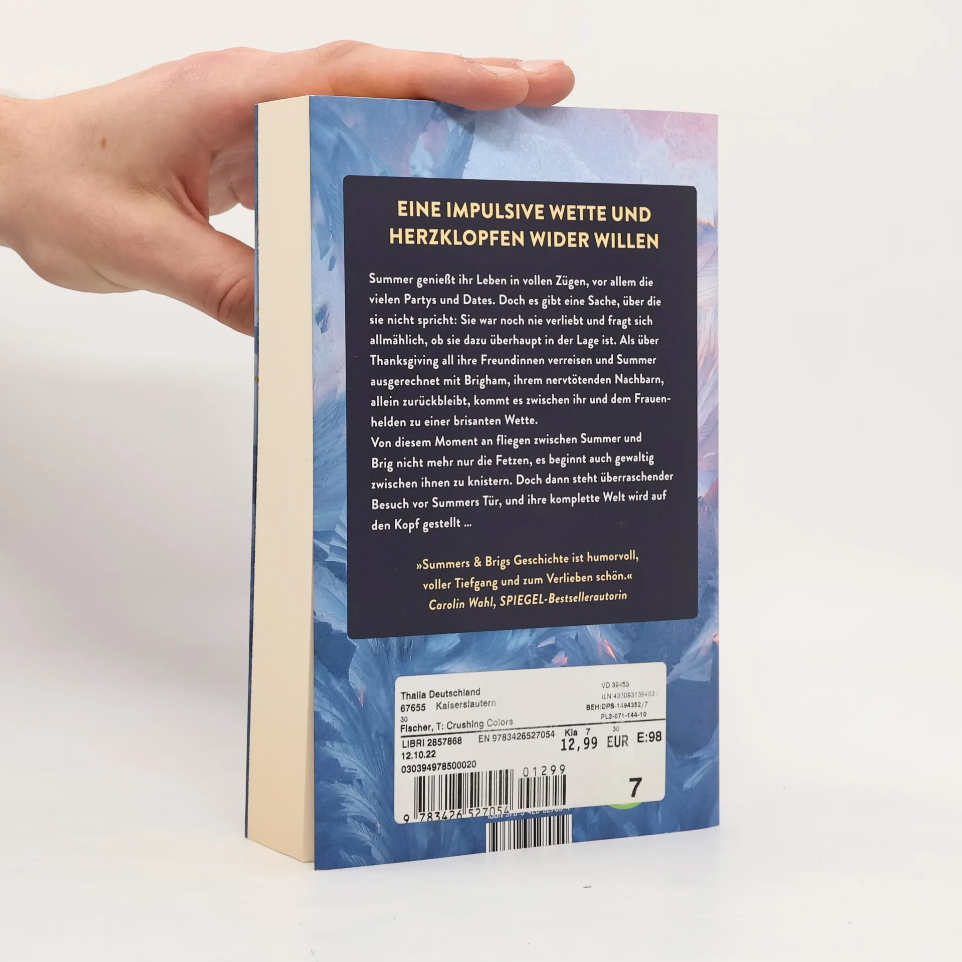 Eine impulsive Wette und unerwartetes Herzklopfen: In »Crushing Colors«, dem letzten New-Adult-Roman der »Fletcher University«-Reihe von Bestseller-Autorin Tami Fischer, treffen die Erzfeinde Summer und Brigham aufeinander – und alles verläuft anders als erwartet. Summer Andrews genießt ihr Leben, vor allem Partys und Dates, doch sie hat nie von Liebe erfahren und fragt sich, ob sie dazu fähig ist. Als ihre Freundinnen über die Feiertage verreisen und sie mit ihrem nervtötenden Nachbarn Brigham allein bleibt, kommt es zu einer brisanten Wette zwischen den beiden. Von diesem Moment an fliegen nicht nur die Fetzen, sondern es knistert gewaltig zwischen ihnen. Besonders als überraschender Besuch vor Summers Tür steht und ihre Welt auf den Kopf stellt. In »Crushing Colors« öffnet die Fletcher University ein letztes Mal ihre Tore. Die Geschichte bietet eine herzliche Freundes-Clique, funkensprühende Flirts, Romantik und die Suche nach sich selbst und der großen Liebe – alles, was die College-Liebesromane von Tami Fischer ausmacht. Die Liebesromane der »Fletcher University«-Reihe sind unabhängig voneinander lesbar und bieten eine fesselnde Lektüre für Fans von New Adult.