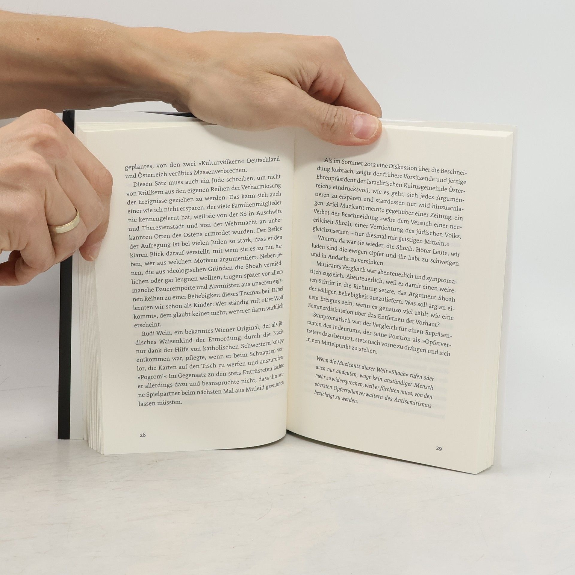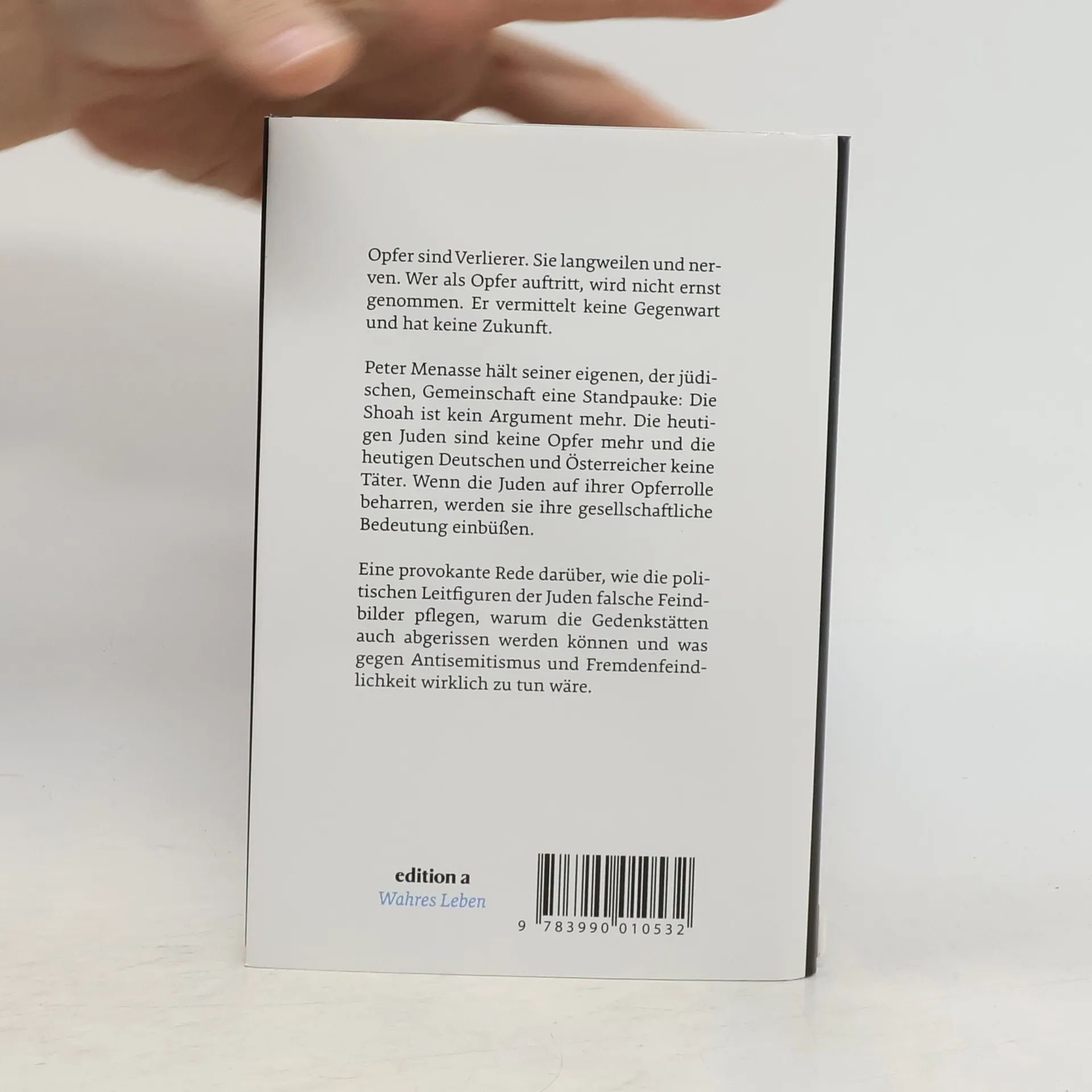 Opfer sind Verlierer. Sie langweilen und nerven. Wer als Opfer auftritt, wird nicht ernst genommen. Er vermittelt keine Gegenwart und hat keine Zukunft. Peter Menasse hält seiner eigenen, der jüdischen, Gemeinschaft eine Standpauke: Die Schoah ist kein Argument mehr. Die heutigen Juden sind keine Opfer mehr und die heutigen Deutschen und Österreicher keine Täter. Wenn die Juden auf ihrer Opferrolle beharren, werden sie ihre gesellschaftliche Bedeutung einbüßen. Eine provokante Rede darüber, wie die politischen Leitfiguren der Juden falsche Feindbilder pflegen, warum die Gedenkstätten auch abgerissen werden können und was gegen Antisemitismus und Fremdenfeindlichkeit wirklich zu tun wäre.