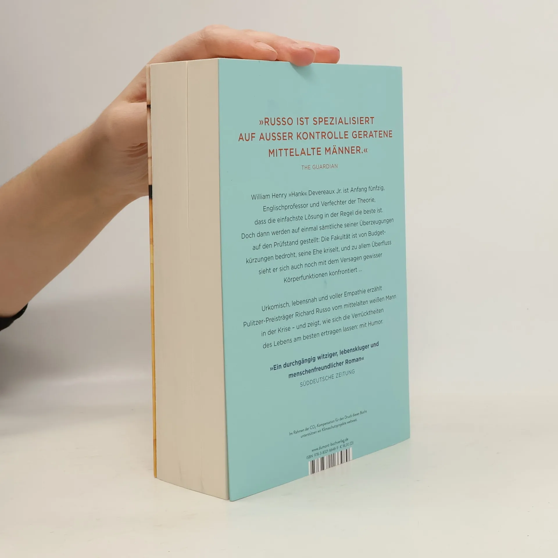 William Henry »Hank« Devereaux Jr. ist Vorsitzender der Englischfakultät einer kleinen Universität in Pennsylvania und daran gewöhnt, sich den Ernst des Lebens mit den Waffen der Ironie vom Leib zu halten. Eigentlich ist er ein gemachter Mann. Er ist glücklich verheiratet, Vater zweier Töchter, hat vor Jahren einen Roman veröffentlicht, der immerhin ein Kritikererfolg war, und bestimmt die Geschicke der Universität entscheidend mit. Eigentlich. Denn auf einmal kommt diese eine Woche, in der wirklich alles schiefgeht: Hank gerät mit seinen Kollegen aneinander, die Fakultät ist von Budgetkürzungen bedroht, er zweifelt an seiner Ehe, und dann ist da noch die Sache mit seiner Prostata … ›Mittelalte Männer‹ ist die Charakterstudie eines Mannes um die fünfzig, der gern den Weg des geringsten Widerstands geht und schließlich doch einsehen muss, dass ihm nichts anderes übrig bleibt, als Verantwortung zu übernehmen. Ein hochkomischer Roman, der die Absurdität des Lebens illustriert, aber auch Raum lässt für abgründige Beobachtungen – ein klassischer Russo mit Herz, Hintersinn und Humor.