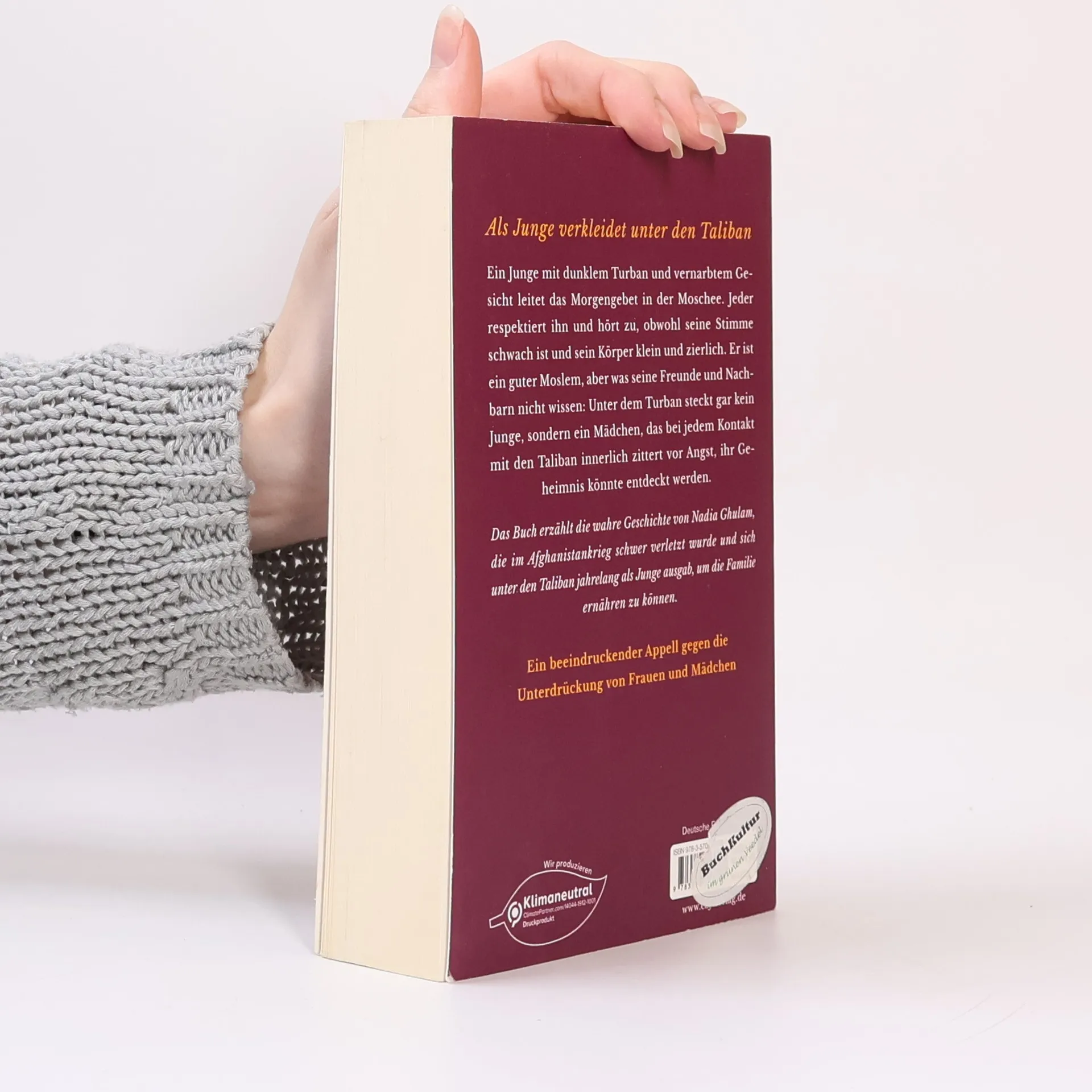 Als Junge verkleidet unter den Taliban Unter dem dunklen Turban leitet ein Junge mit vom Bombenangriff vernarbten Gesicht das Morgengebet in der Moschee an. Jeder respektiert ihn und hört zu, obwohl seine Stimme schwach ist und sein Körper klein und zierlich. Er ist ein guter Moslem, aber was seine Freunde und Nachbarn nicht wissen: Unter dem Turban steckt gar kein Junge, sondern ein Mädchen, das bei jedem Kontakt mit den Taliban innerlich zittert vor Angst, ihr Geheimnis könnte entdeckt werden. Das Buch erzählt die wahre Geschichte von Nadia Ghulam, einem Mädchen, das im Afghanistankrieg schwer verletzt wurde und sich schließlich unter den Taliban zehn Jahre lang als Junge ausgab, um arbeiten und die Familie ernähren zu können. Ein beeindruckendes Plädoyer gegen die Unterdrückung von Frauen und Mädchen