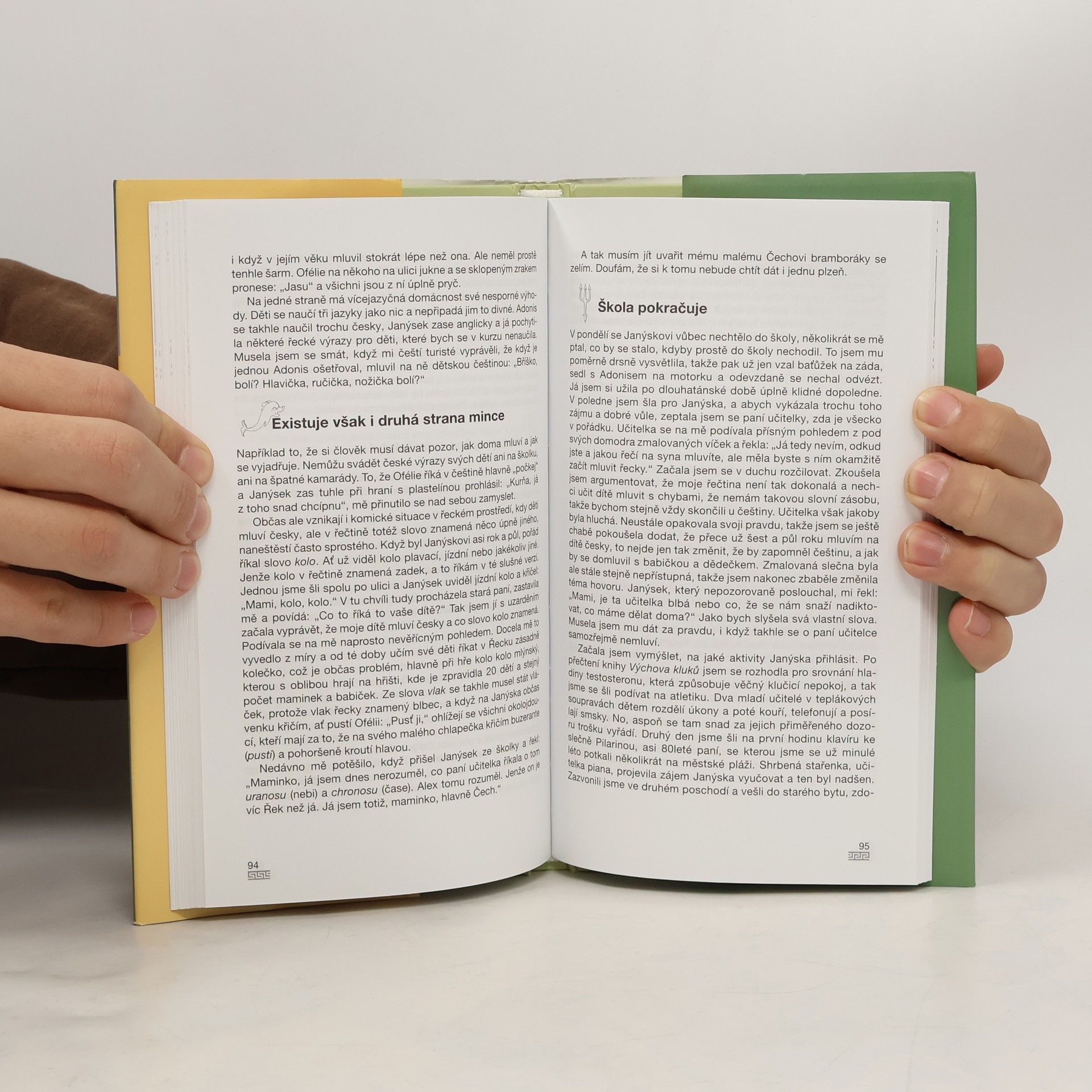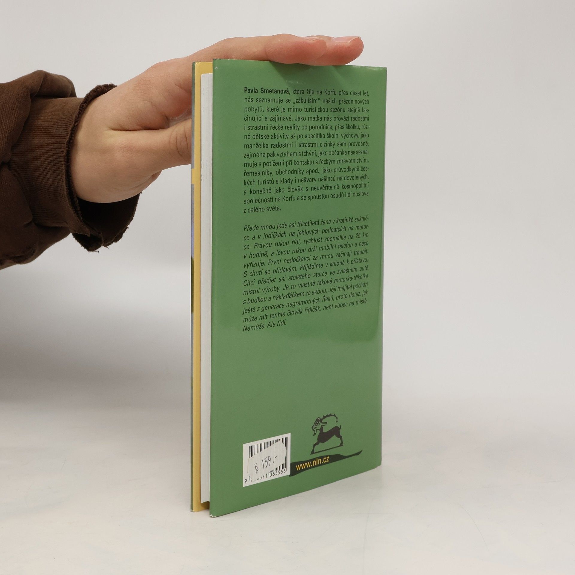 Autorka žije na Korfu přes deset let se svým řeckým manželem a dvěma dětmi. Její postřehy jsou prodchnuty láskou a obdivem k novému domovu, což jí umožňuje vnímat jak krásu a poezii celého ostrova či vlídnost a pohostinnost jeho obyvatel, tak i méně příjemné stránky zdejšího života. Ty však dokáže glosovat s laskavým humorem i s jistým pochopením....Jejím prostřednictvím se seznamujeme se „zákulisím\" našich prázdninových pobytů a zjišťujeme, že život mimo turistickou sezónu je stejně fascinující a zajímavý. Jako matka nás provází radostmi i strastmi řecké reality od porodnice, přes školku, různé dětské aktivity až po specifika školní výchovy, jako manželka radostmi i strastmi cizinky sem provdané, zejména pak vztahem s tchýní, jako občanka nás seznamuje s potížemi při kontaktu s řeckým zdravotnictvím, řemeslníky, obchodníky apod., jako průvodkyně českých turistů s klady i nešvary našinců na dovolených, a konečně jako člověk s neuvěřitelně kosmopolitní společností na Korfu a se spoustou osudů lidí doslova z celého světa.